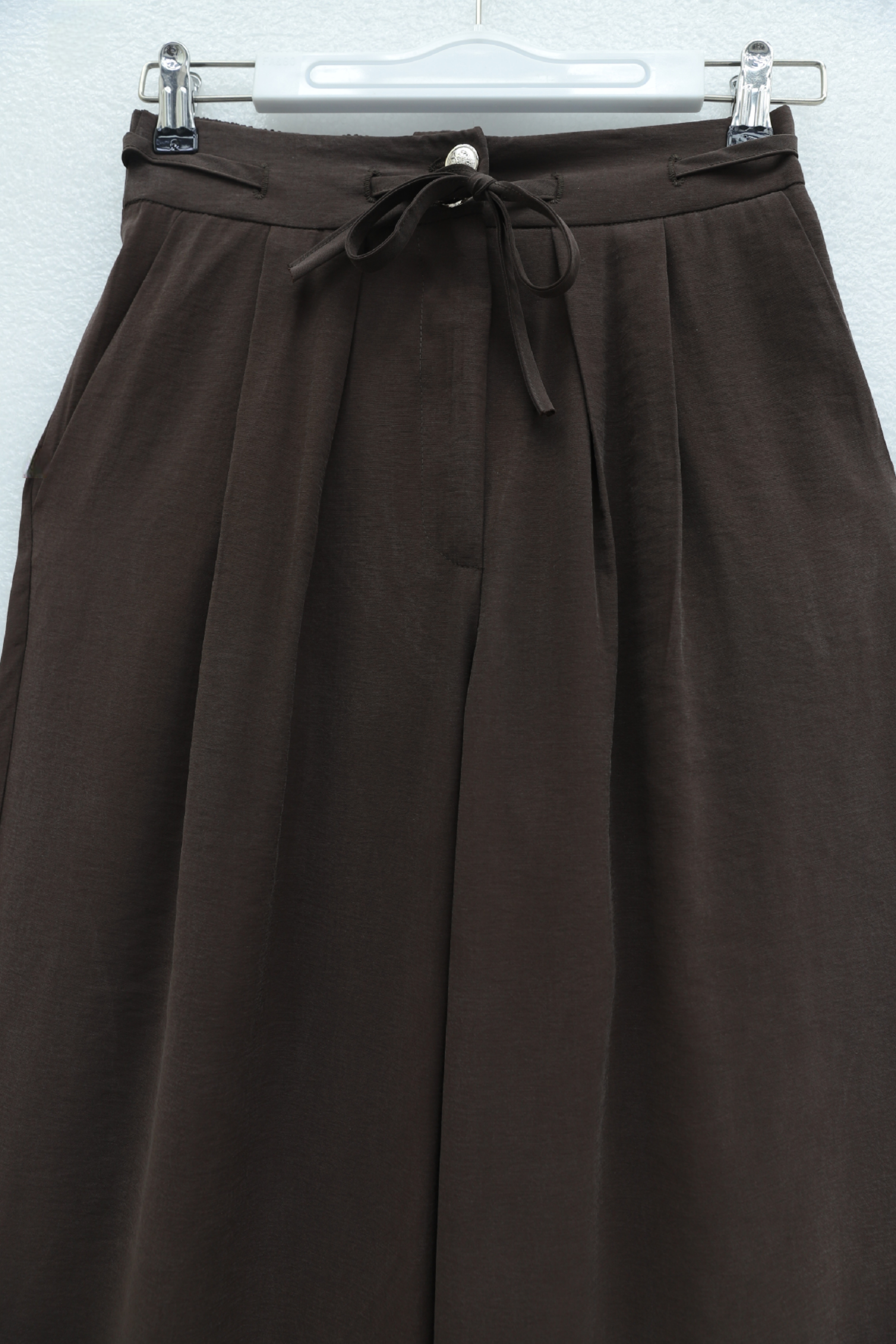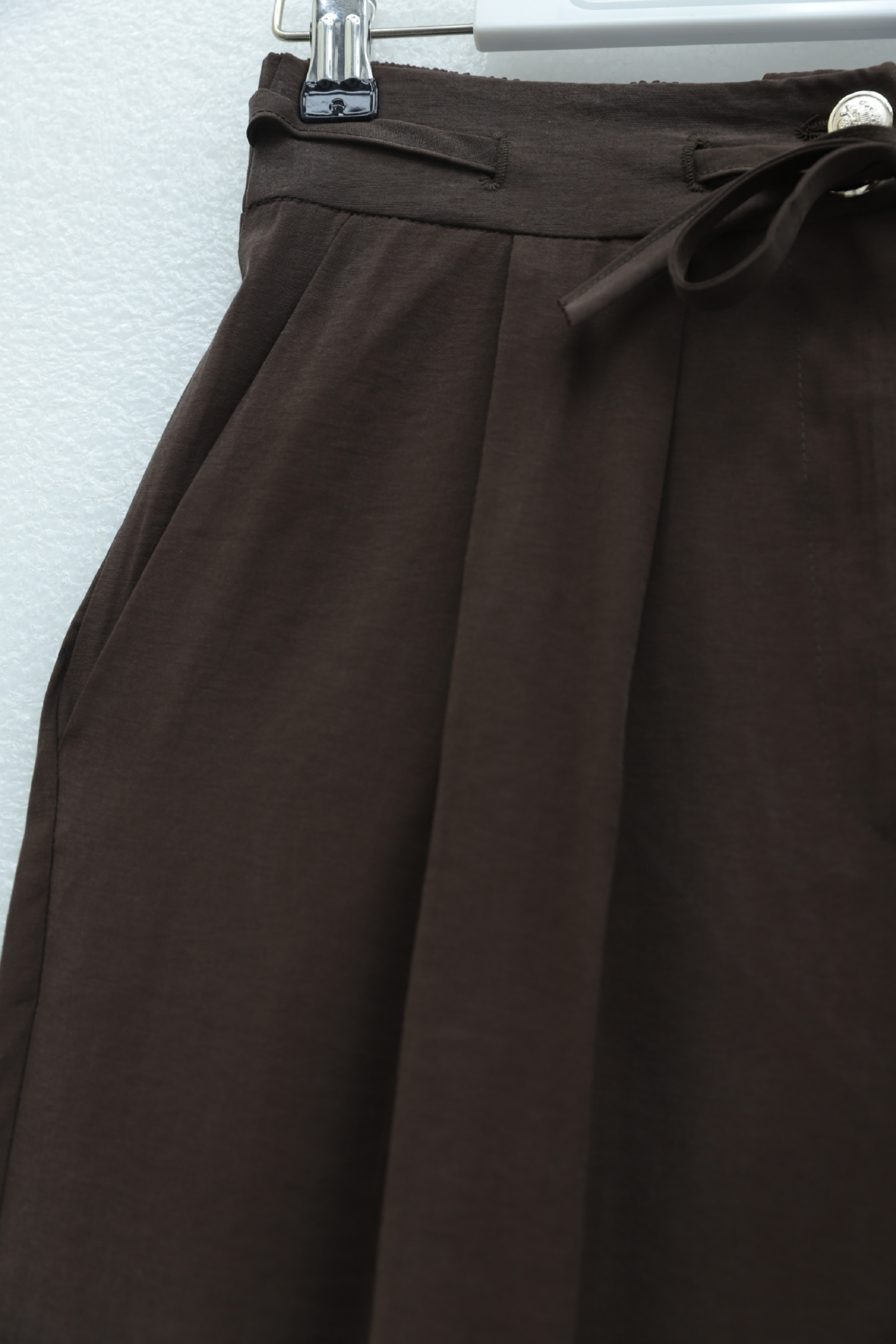 Beli Bağcıklı Çift Düğmeli Yüksek Bel Tensel Pantolon -Kahve