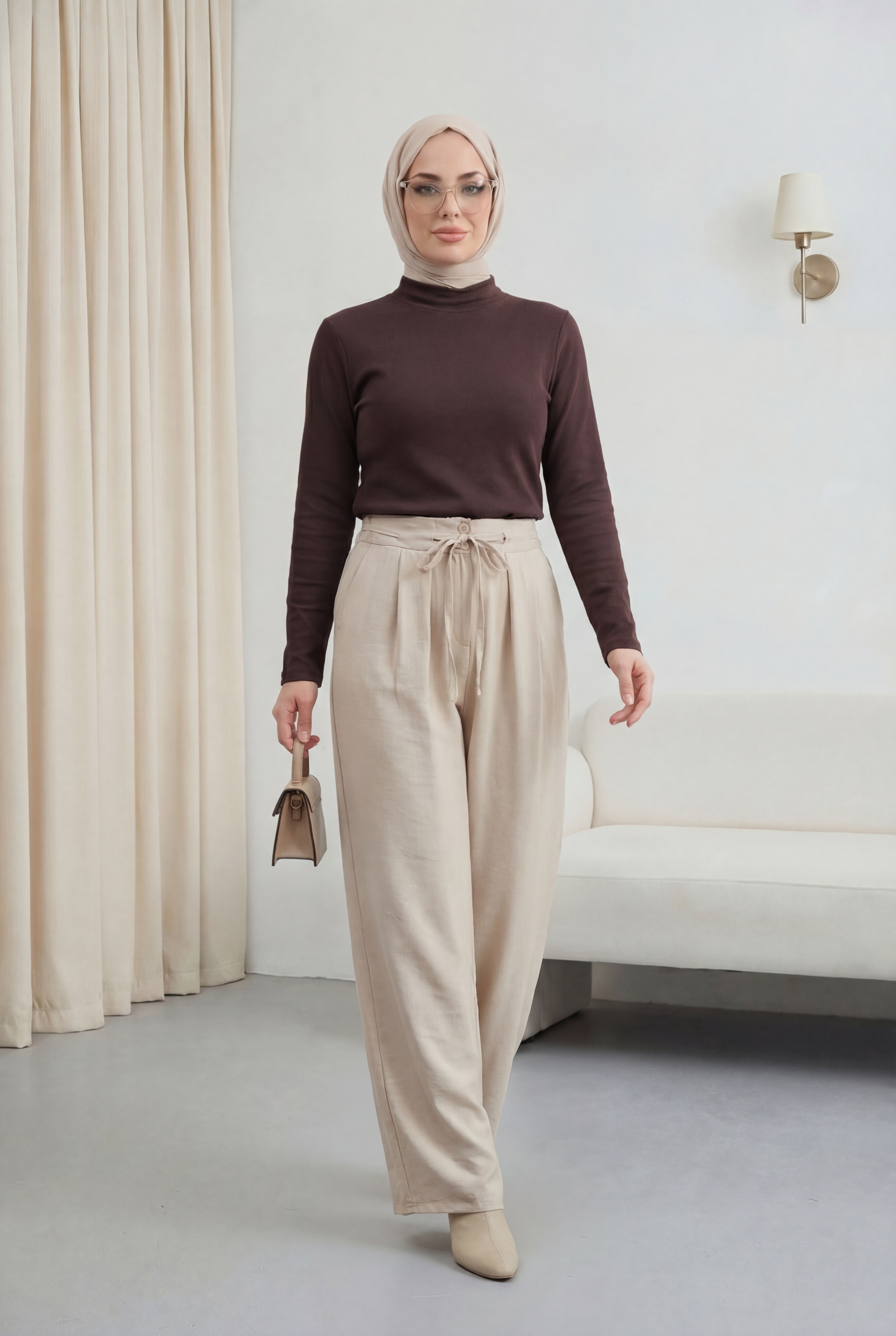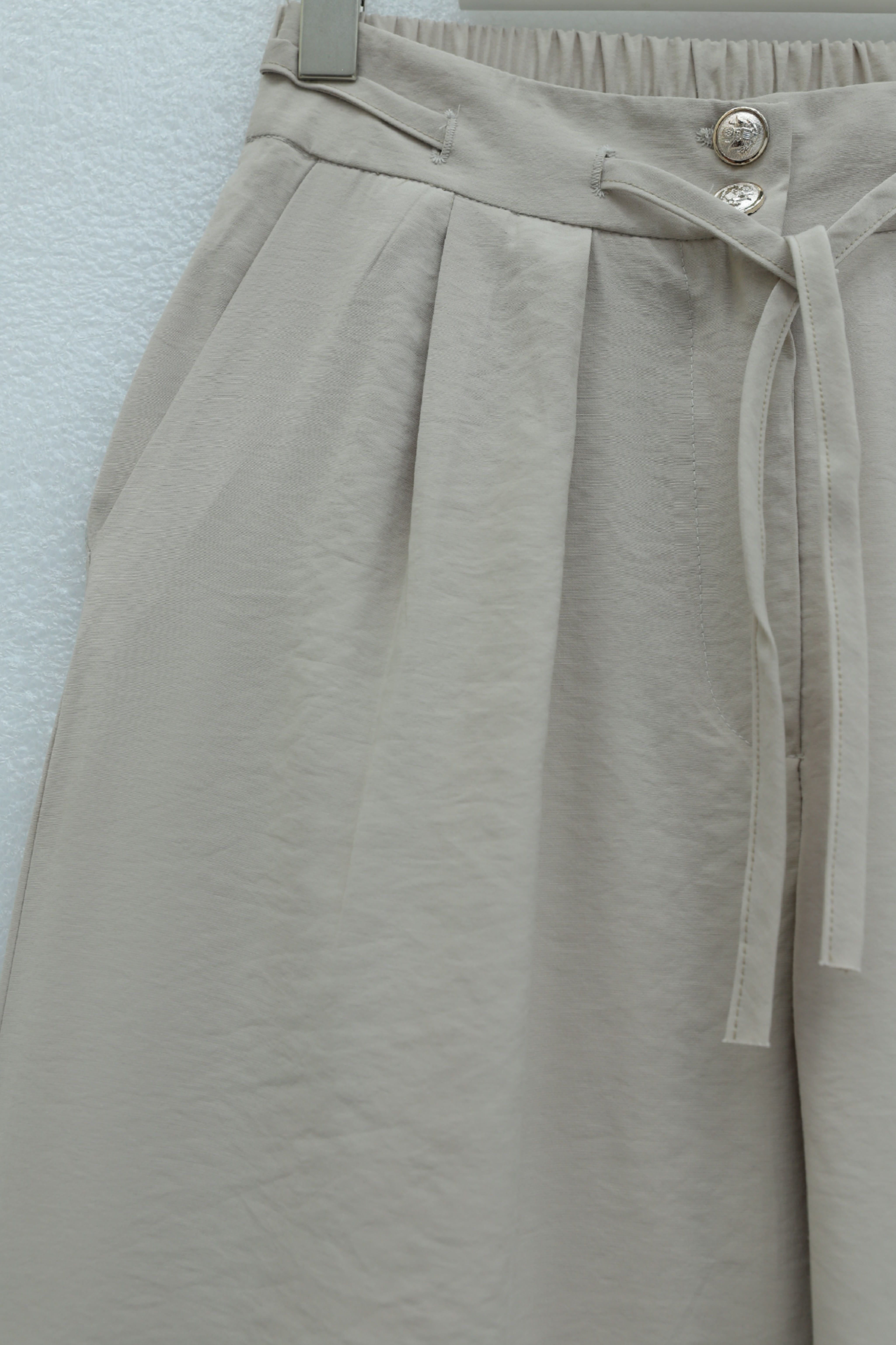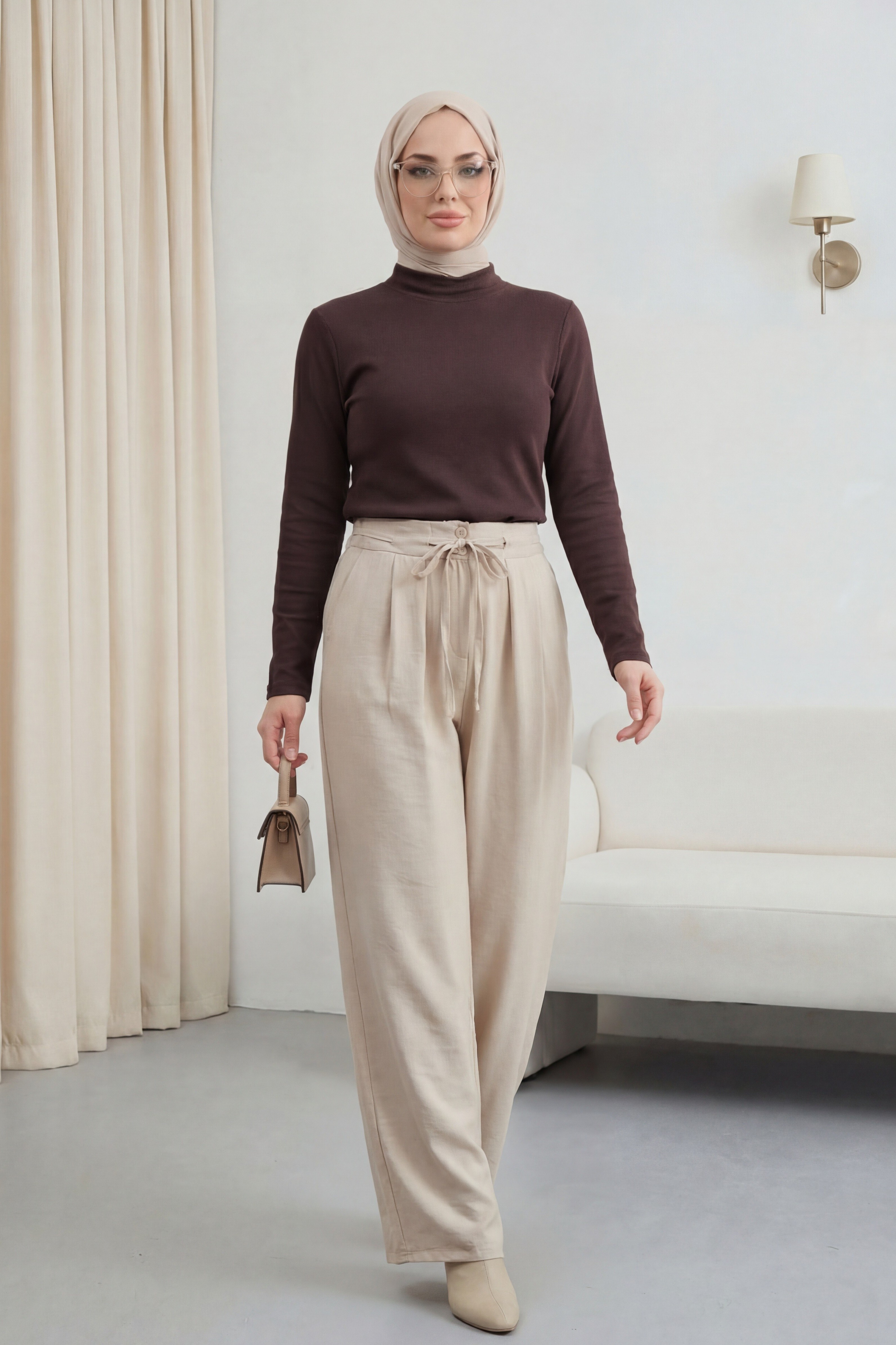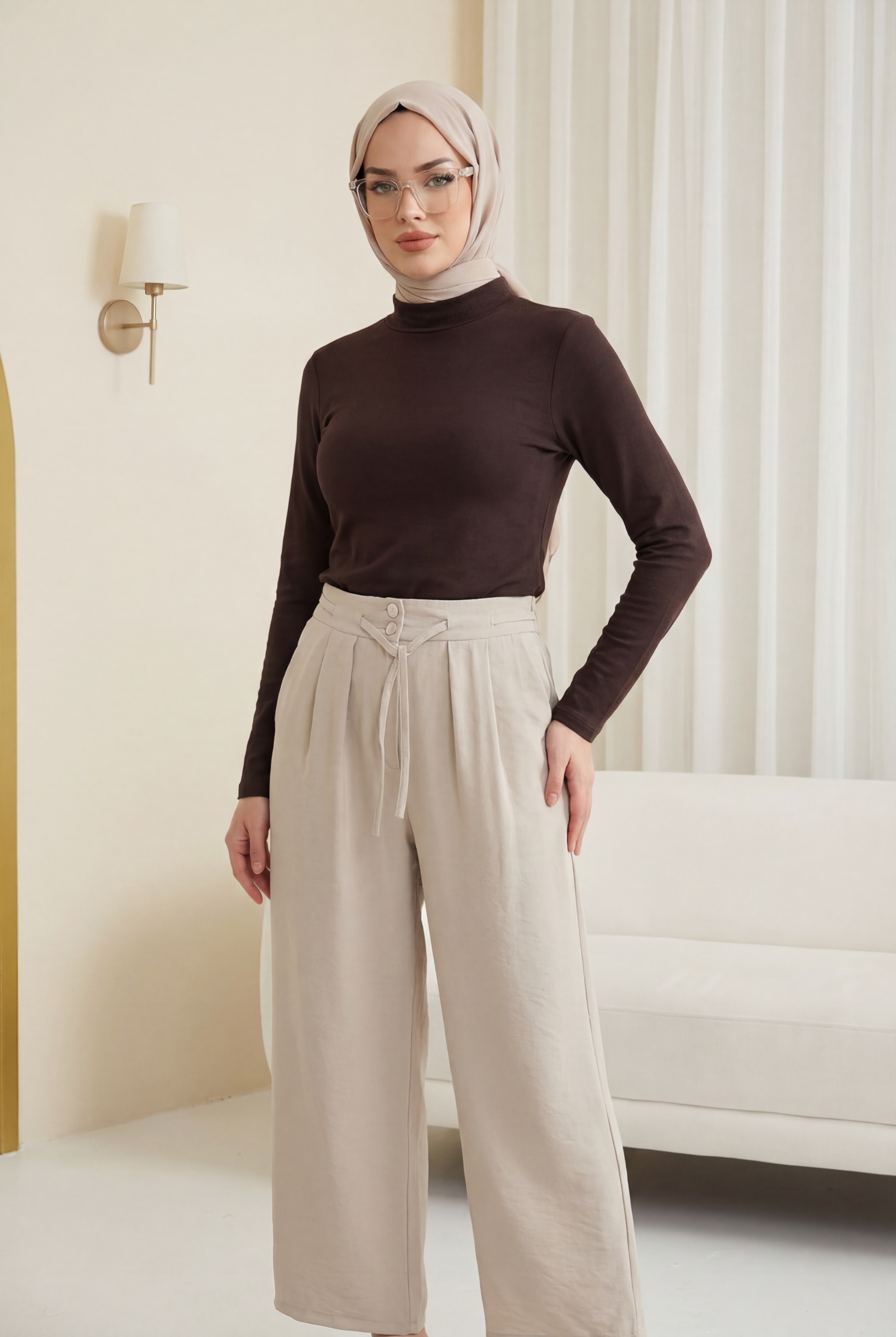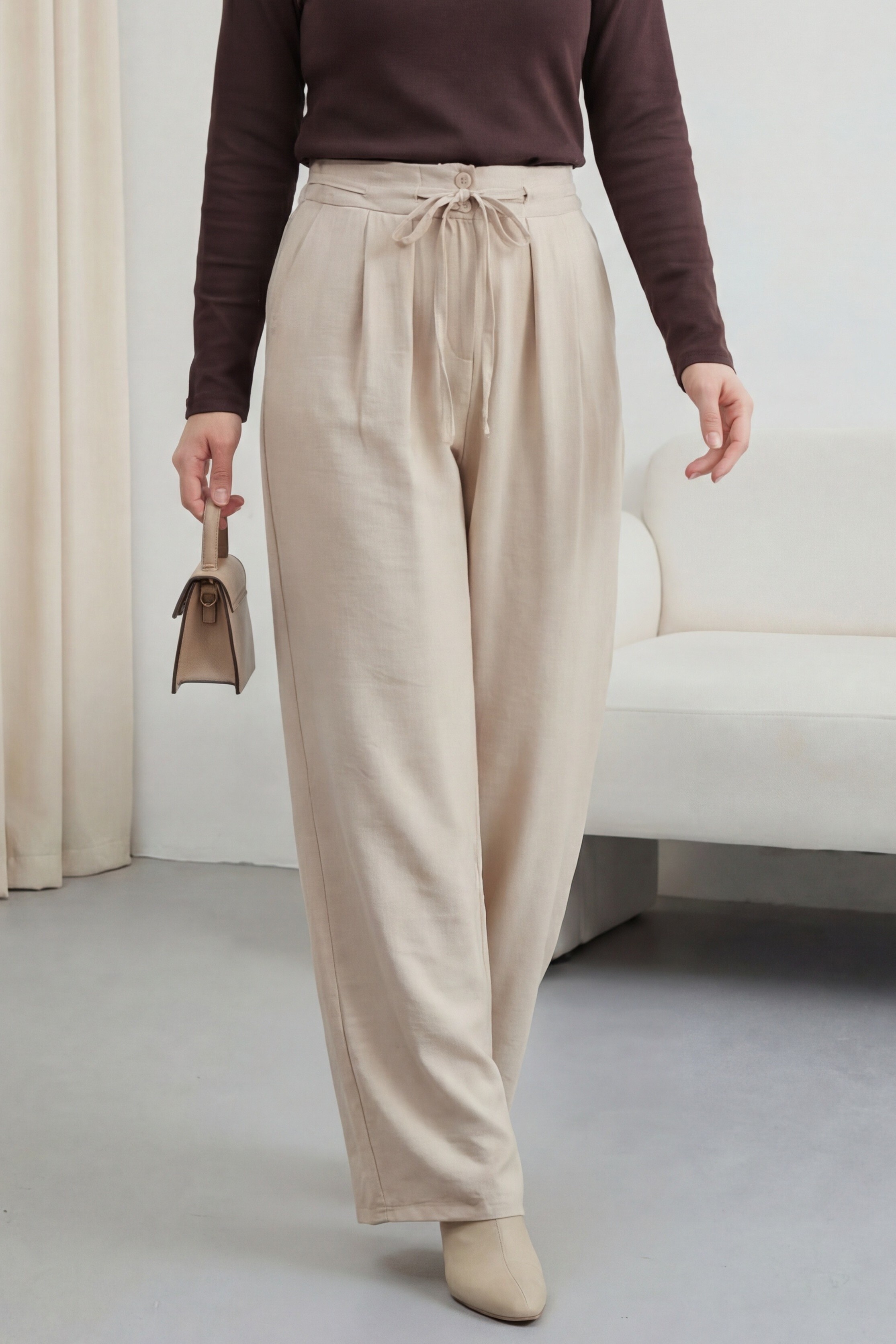 Beli Bağcıklı Çift Düğmeli Yüksek Bel Tensel Pantolon, modern ve konforlu bir stil sunar. Yüksek bel formu silueti dengelerken, çift düğme detayı şık bir görünüm kazandırır. Beli bağcıklı yapısı ayarlanabilir kullanım sağlar. Tensel kumaşı hafif, yumuşak ve nefes alabilendir.