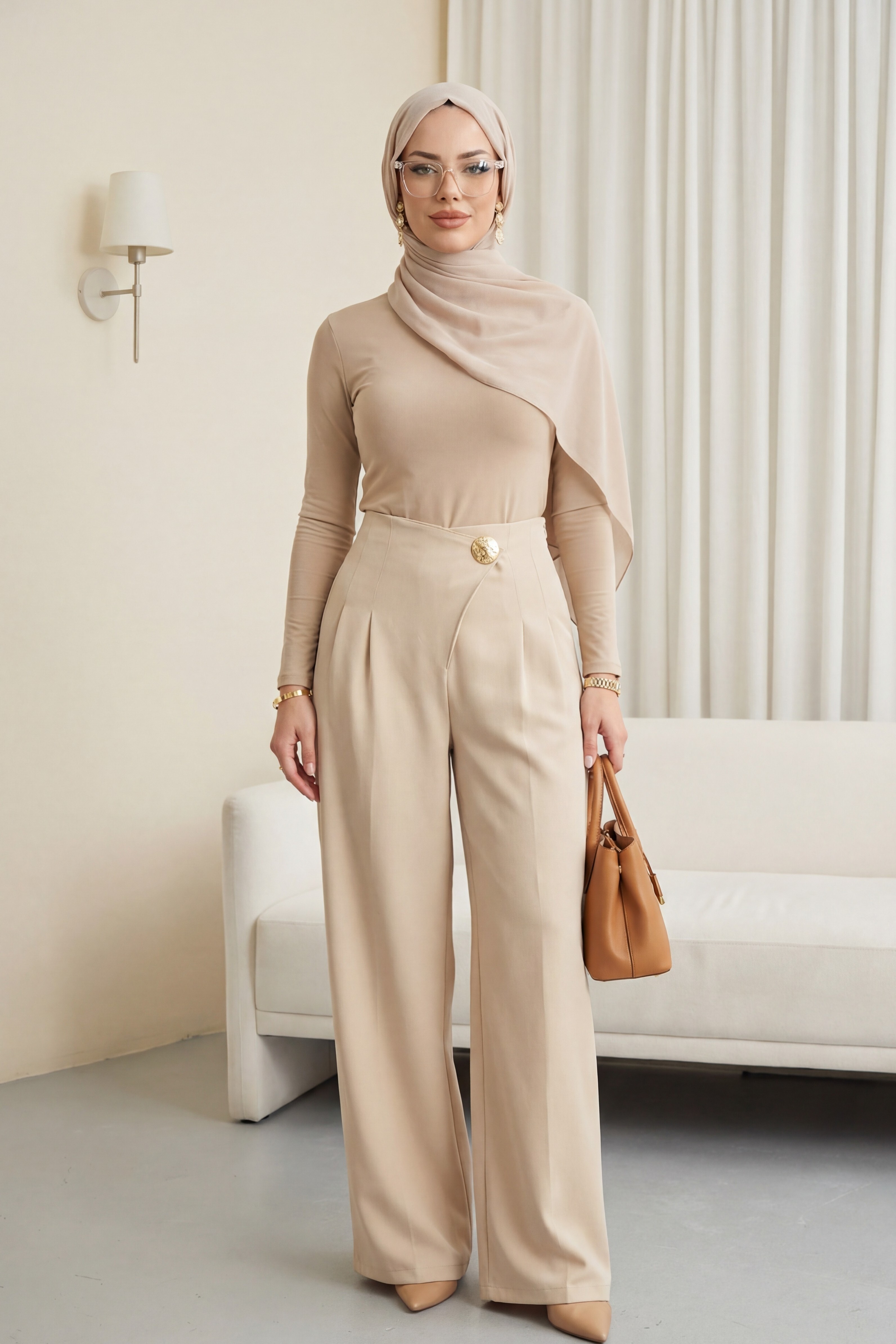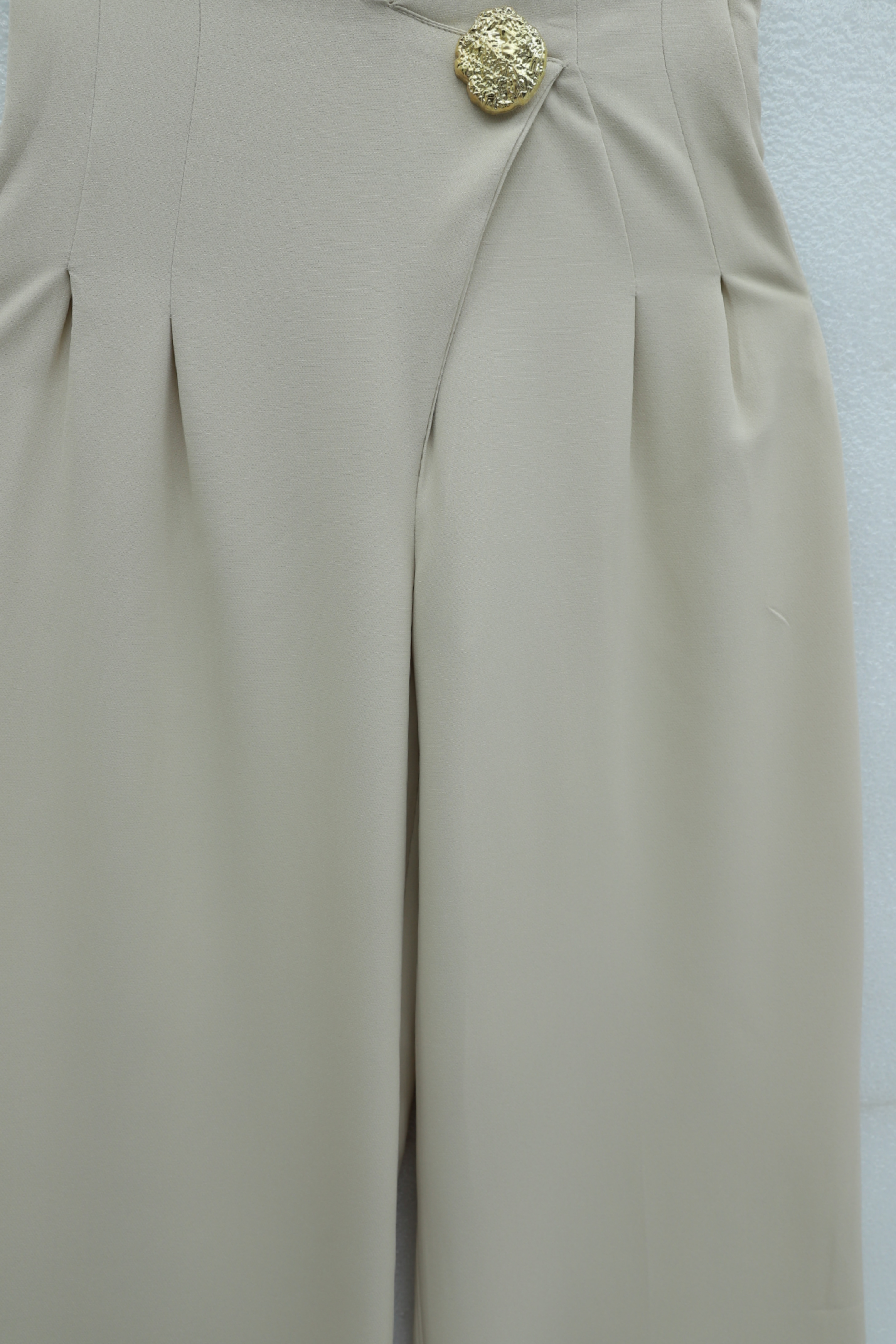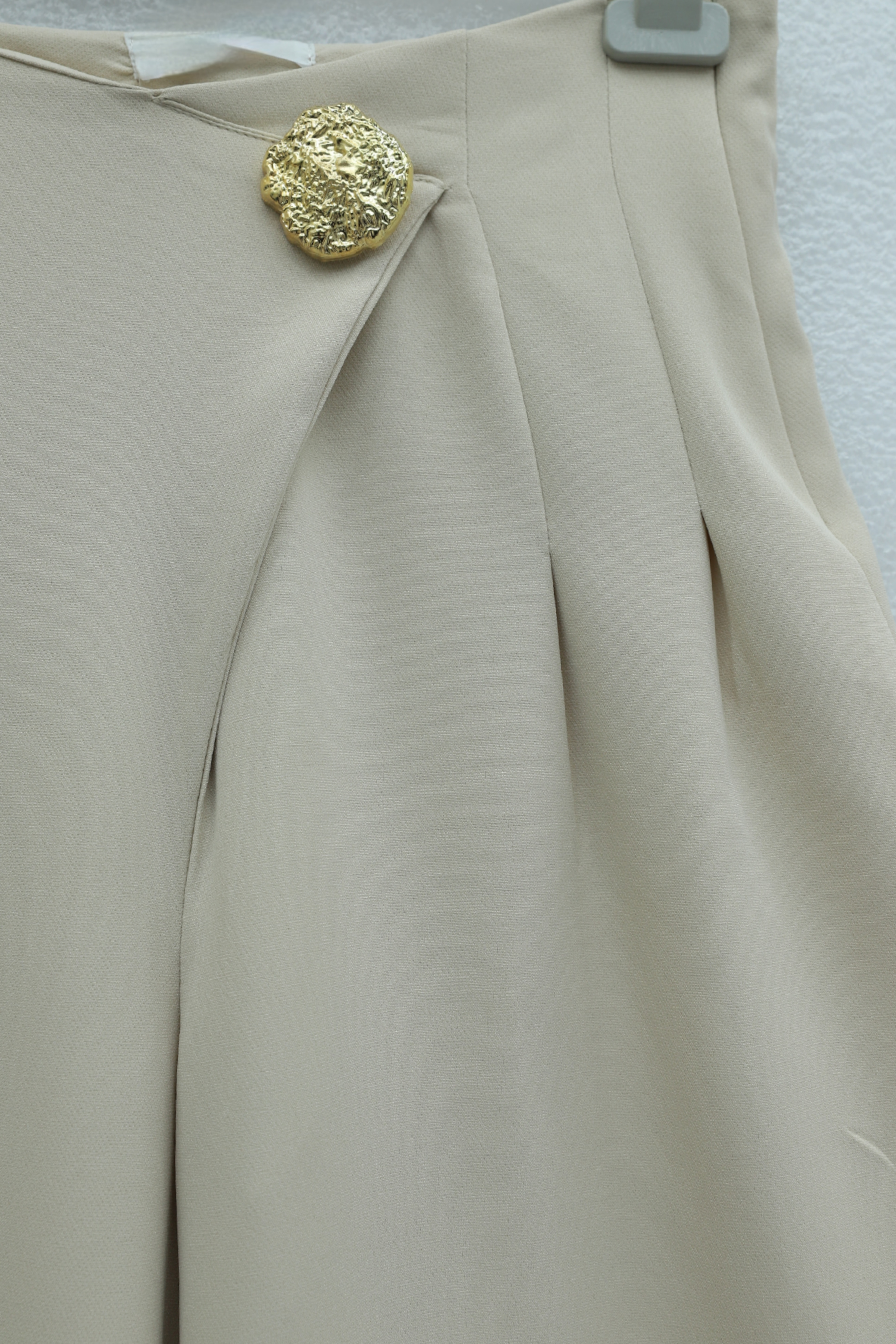 Yandan Fermuarlı Broşlu Katlama Detaylı Bol Paça Krep Pantolon, şık ve modern bir stil sunar. Yandan fermuar detayı pratik kullanım sağlarken, katlama detayı tasarıma hareket katar. Broş detayı zarif bir dokunuş sunar. Bol paça formu akışkan bir siluet oluşturur. Krep kumaşı rahat ve konforludur.