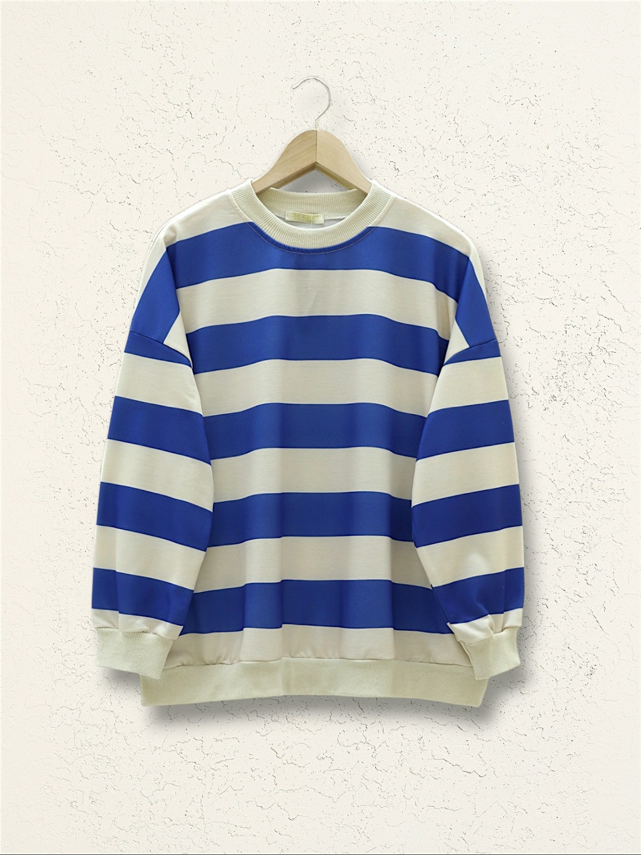 Yuvarlak Yaka Kalın Çizgili Oversize Sweat -Saks