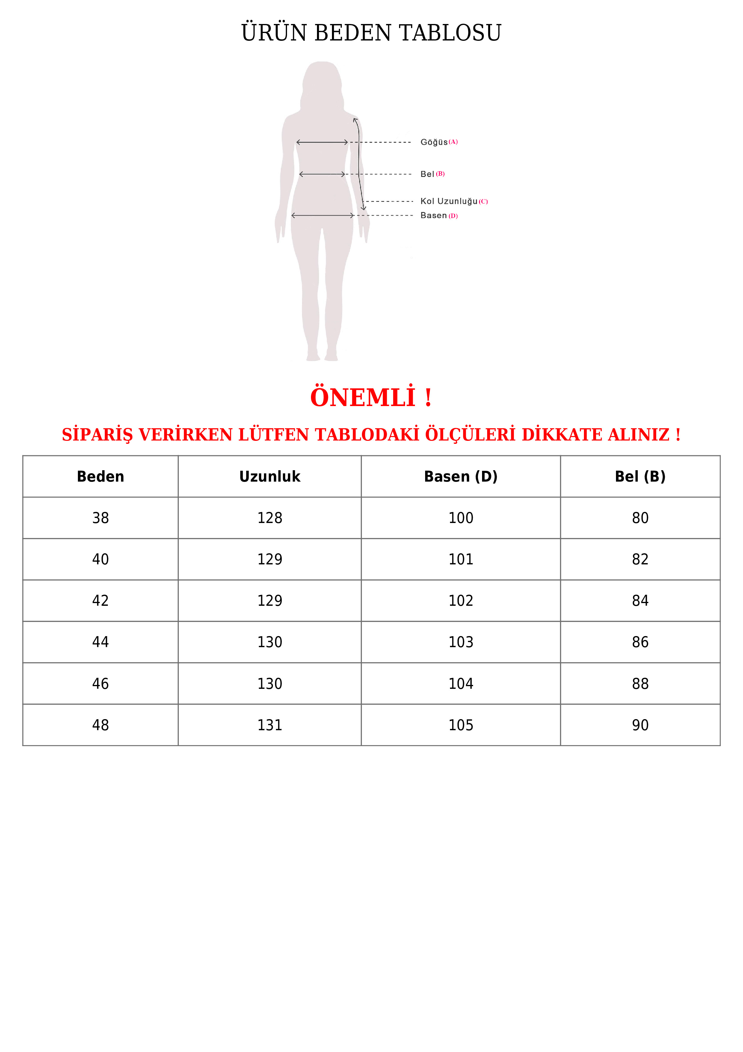 Giydiğiniz bedeni ölçü tablosuna bakarak belirleyebilir, size en uygun bedeni sepetinize ekleyerek en iyi fiyata sipariş edebilirsiniz.