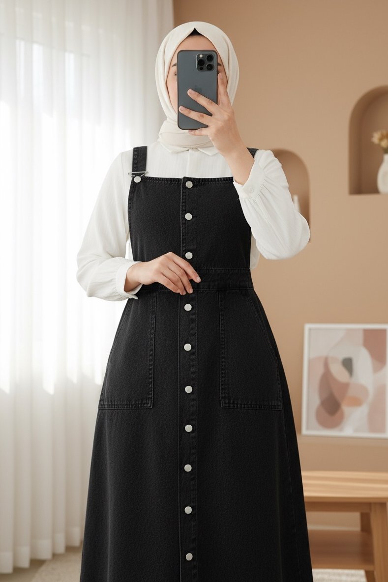 Boydan Düğmeli Çift Cepli Kot Salopet -Siyah