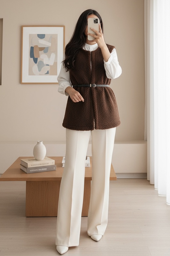 Not: Ürün içeriği yelekten oluşmaktadır. (Bluz, pantolon, ayakkabı, çanta ve takılar dekor amaçlı kullanılmaktadır.)