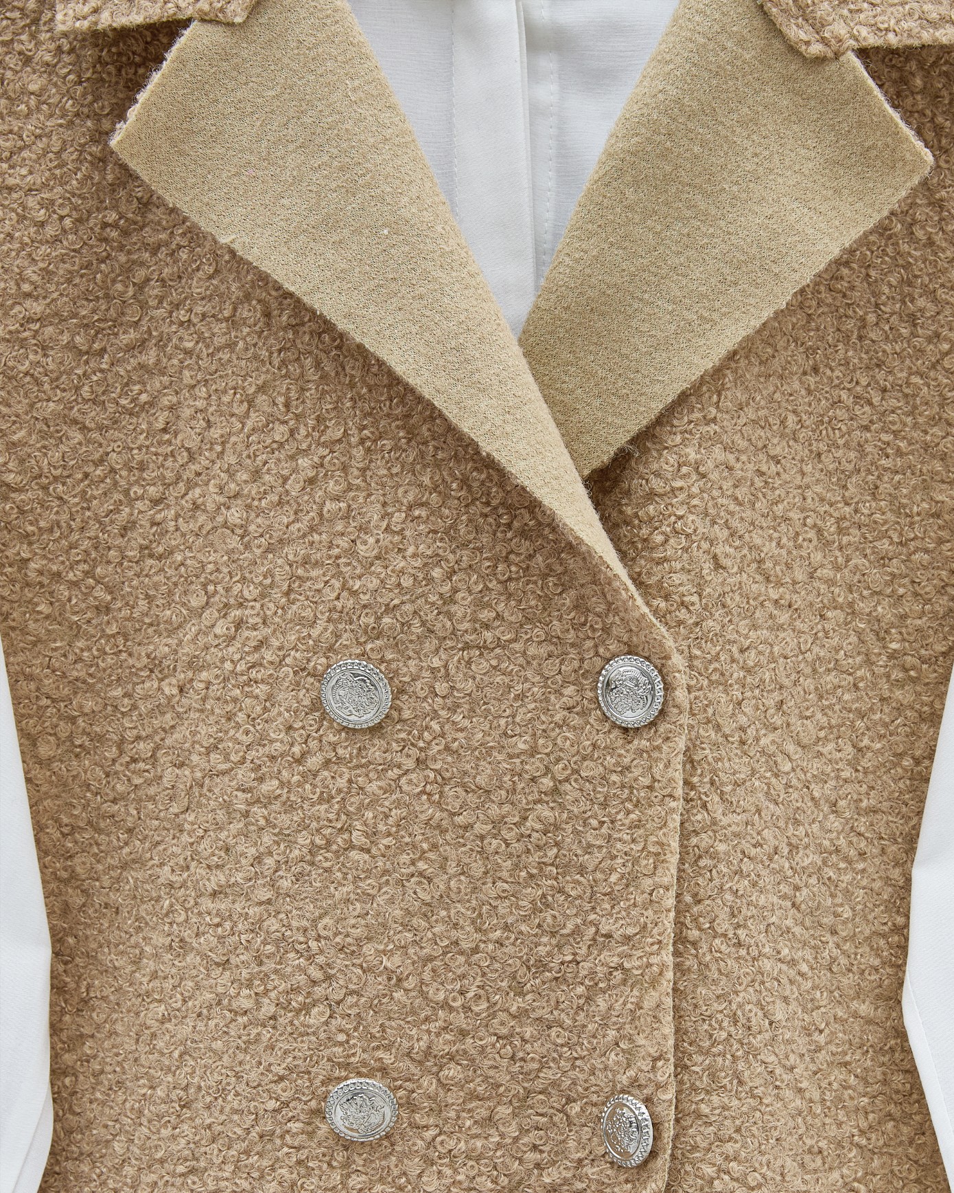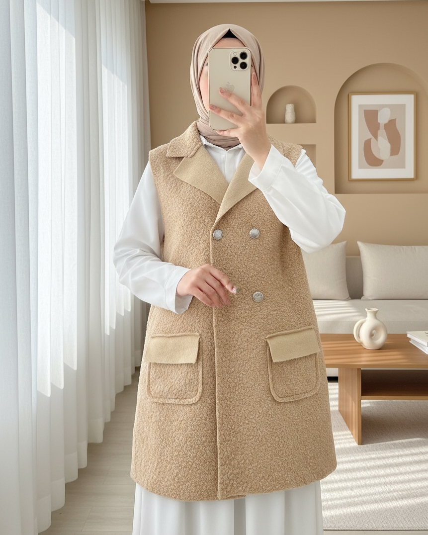 Düğmeli Çift Cepli Buklet Yelek -Vizon - 349-6041-R23