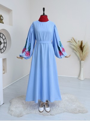 Kolları Balon Süzene İşlemeli Kemerli Elbise -Mavi