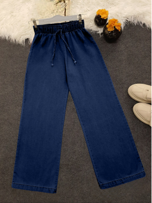 Bol Paça Beli Lastikli Bağcık Detaylı Kot Pantolon -İndigo