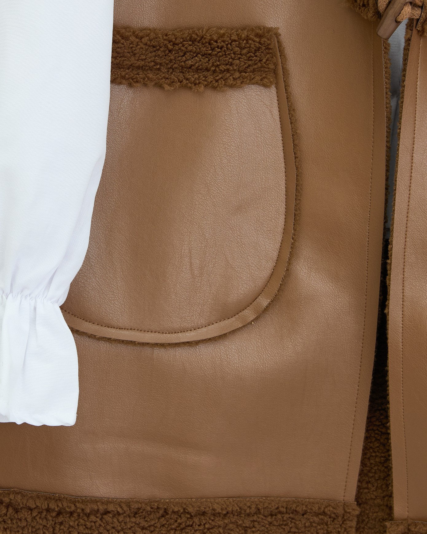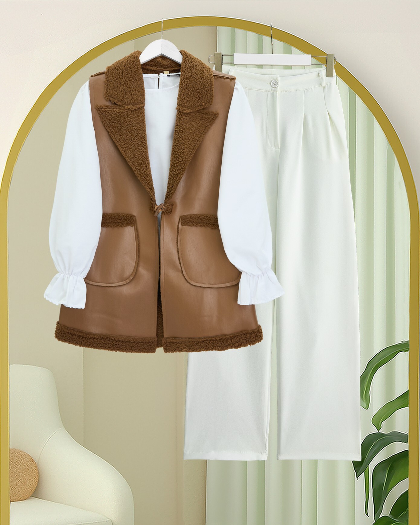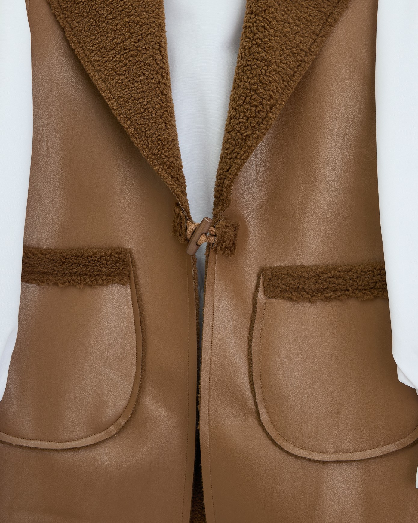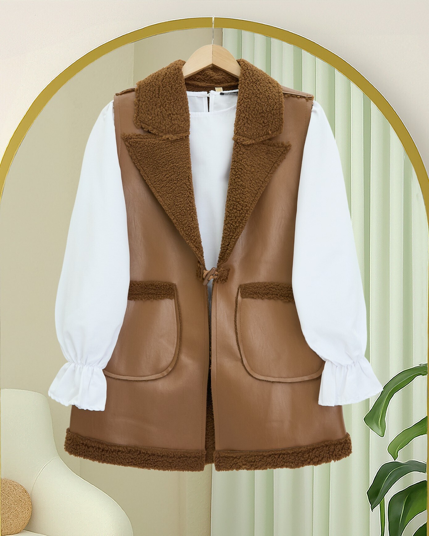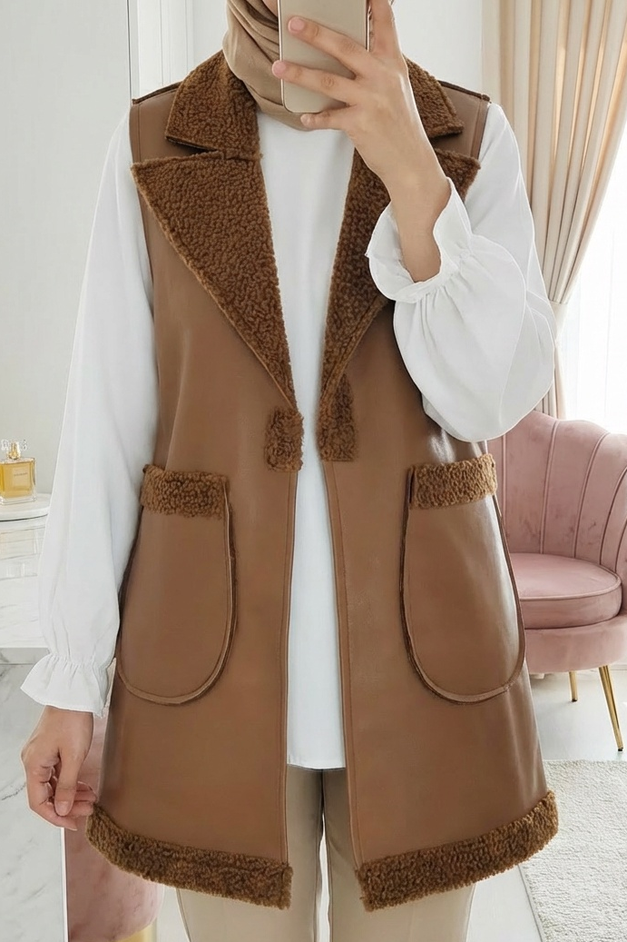 İçi Kuzu Peluş Çift Cepli Yelek -Taba