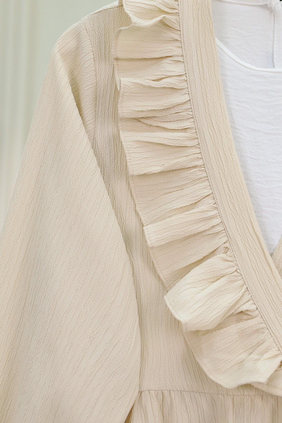 Önü Fırfırlı Bağlamalı Krinkıl Kimono, zarif fırfır detayları ve bağlama şıklığıyla dikkat çeker. Krinkıl kumaşı, hafif ve rahat bir kullanım sunar. Günlük stilinize şıklık katacak bu kimono, farklı kombinlerle rahatlıkla uyum sağlar ve feminen bir hava yaratır.