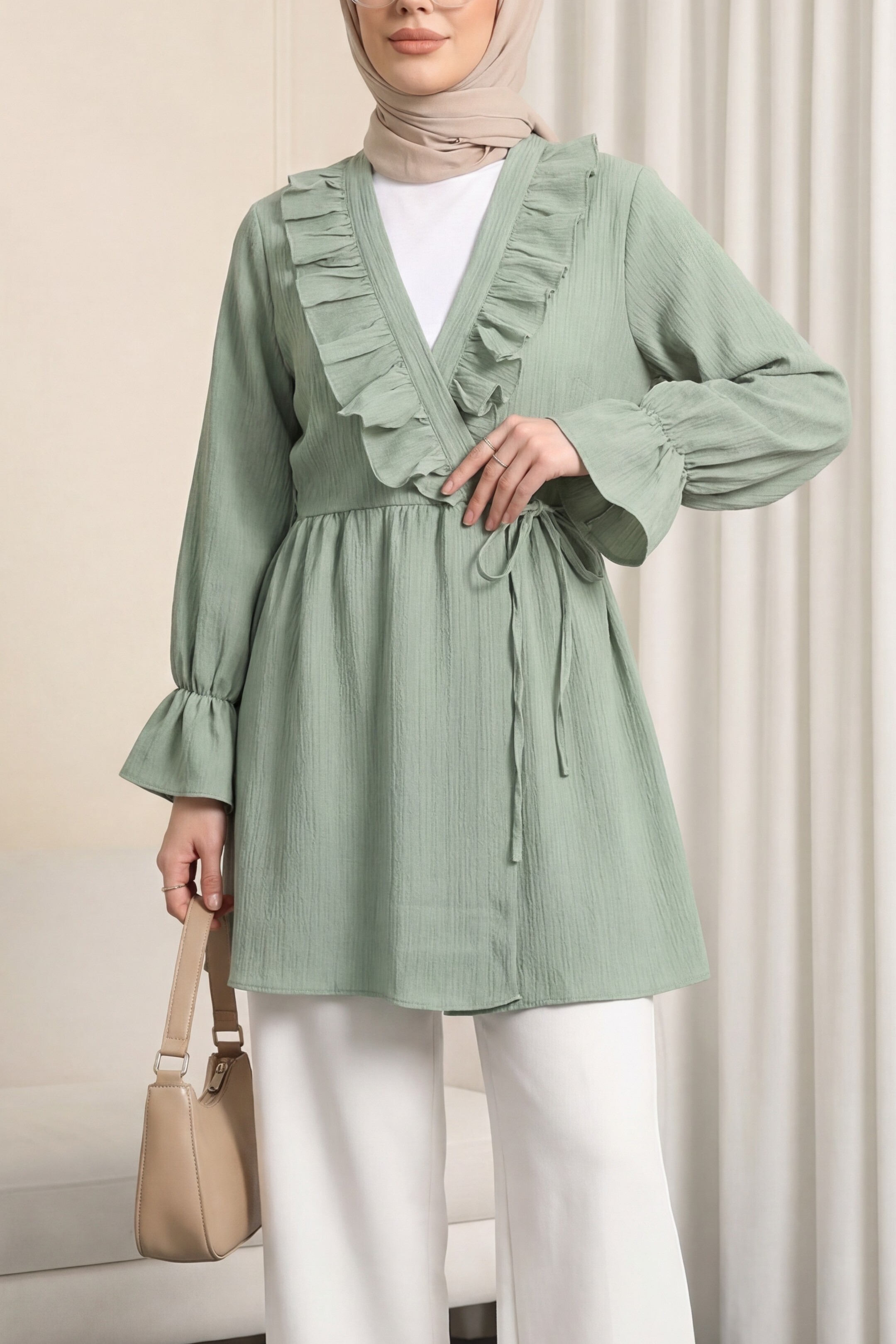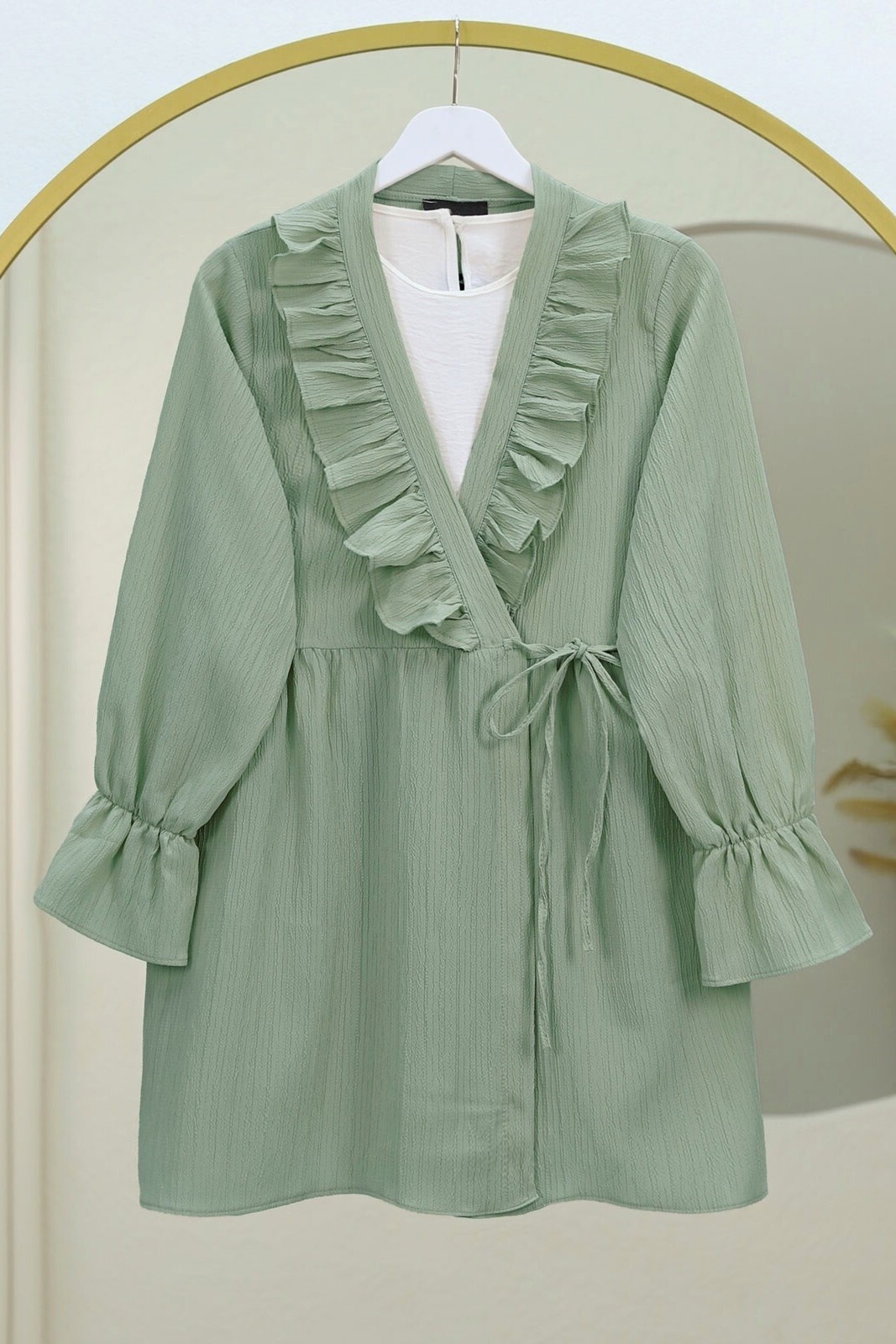 Önü Fırfırlı Bağlamalı Krinkıl Kimono -Mint