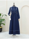 Eteği Püsküllü Tünel Bağcıklı Kot Elbise -Buz Mavi