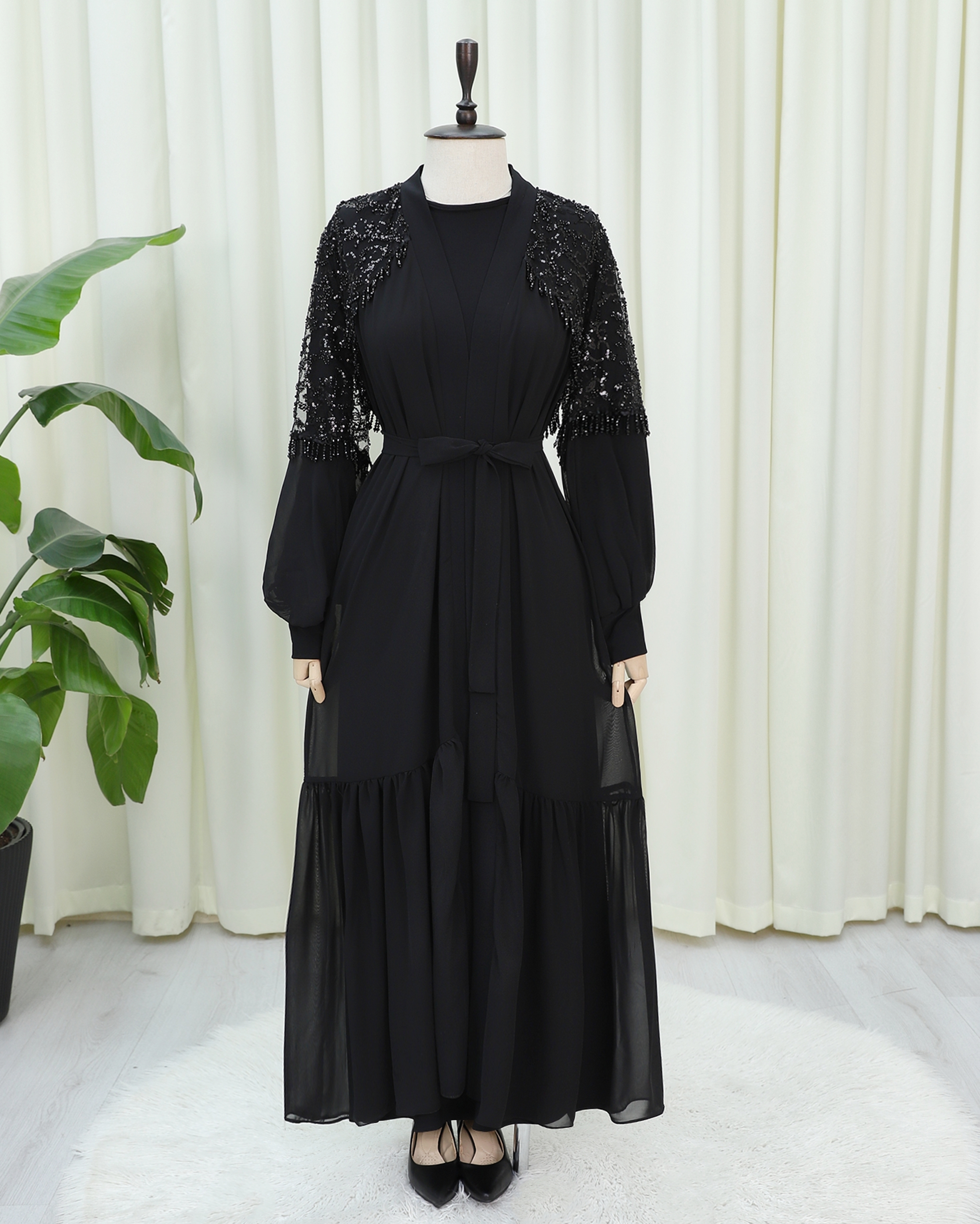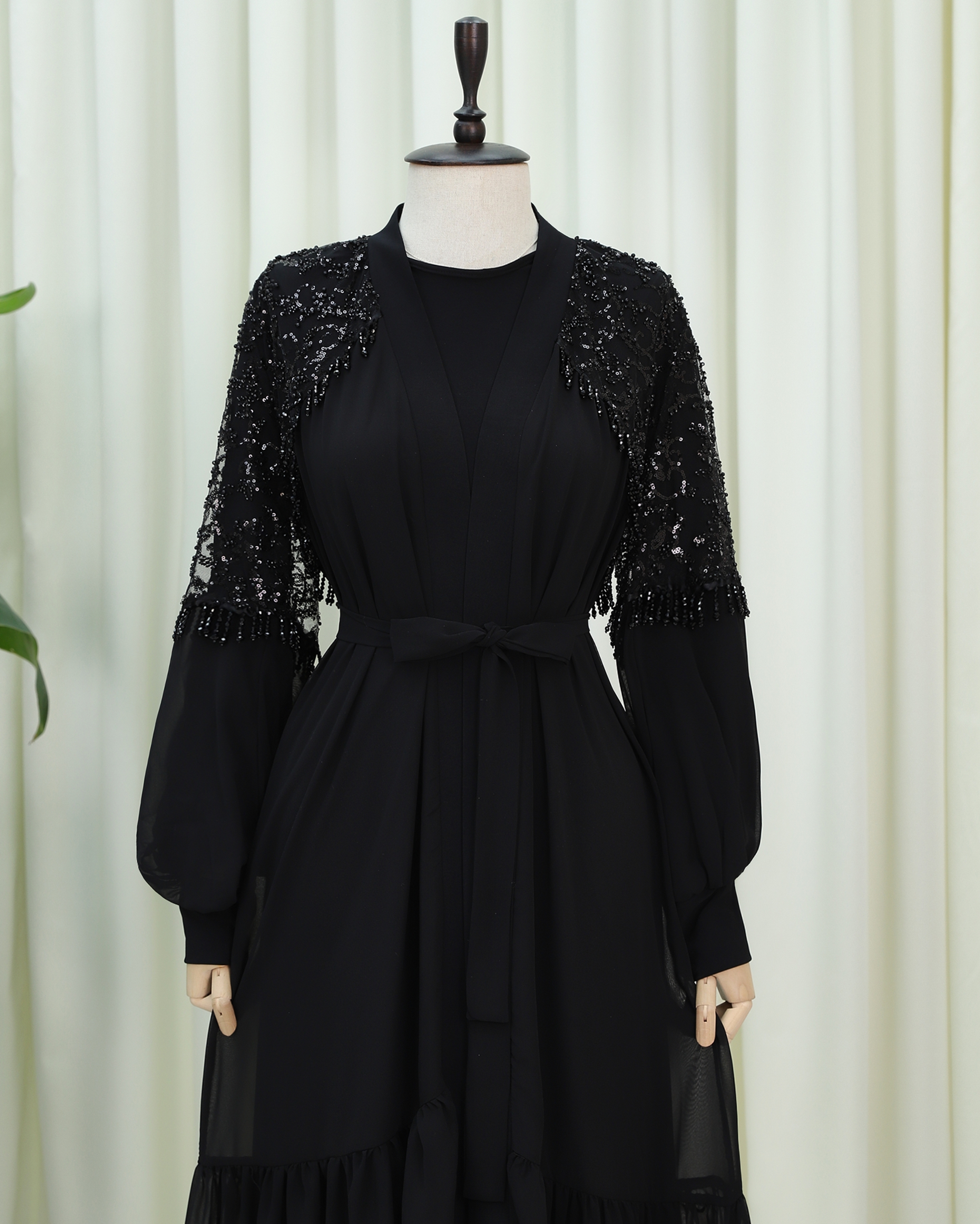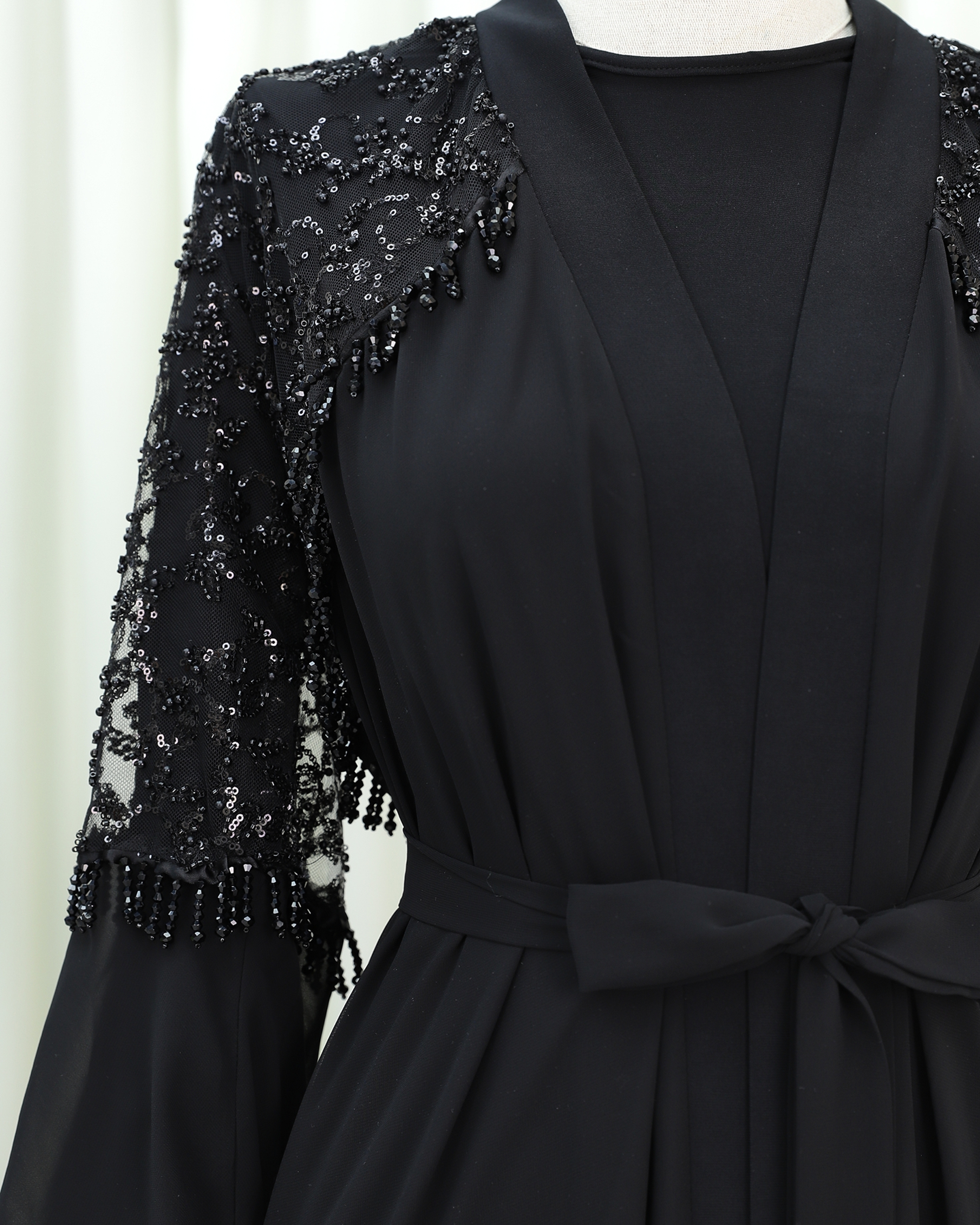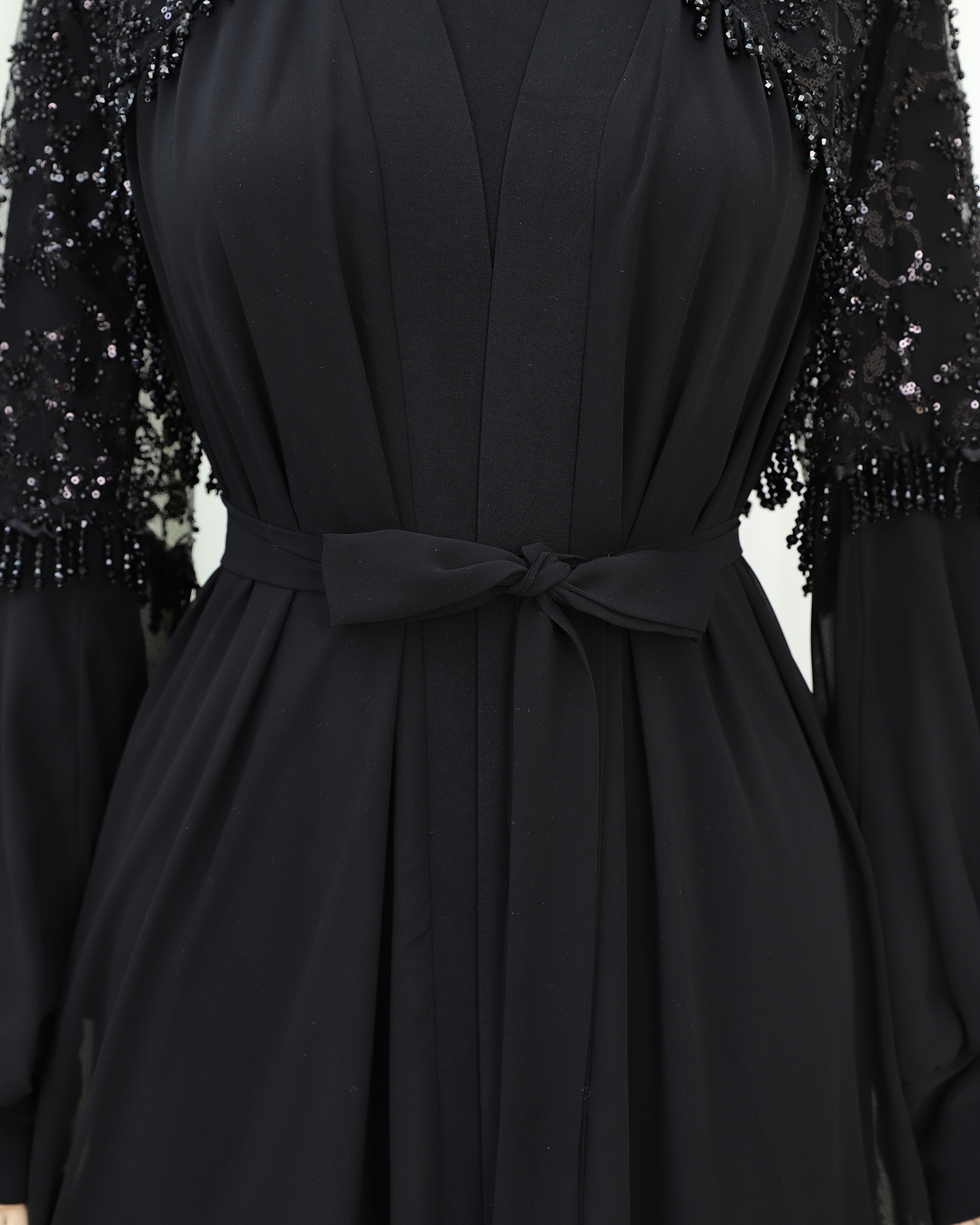 Kesme Boncuklu Kemerli İkili Abaya Takım -Siyah - 316-T0017-4820-R01