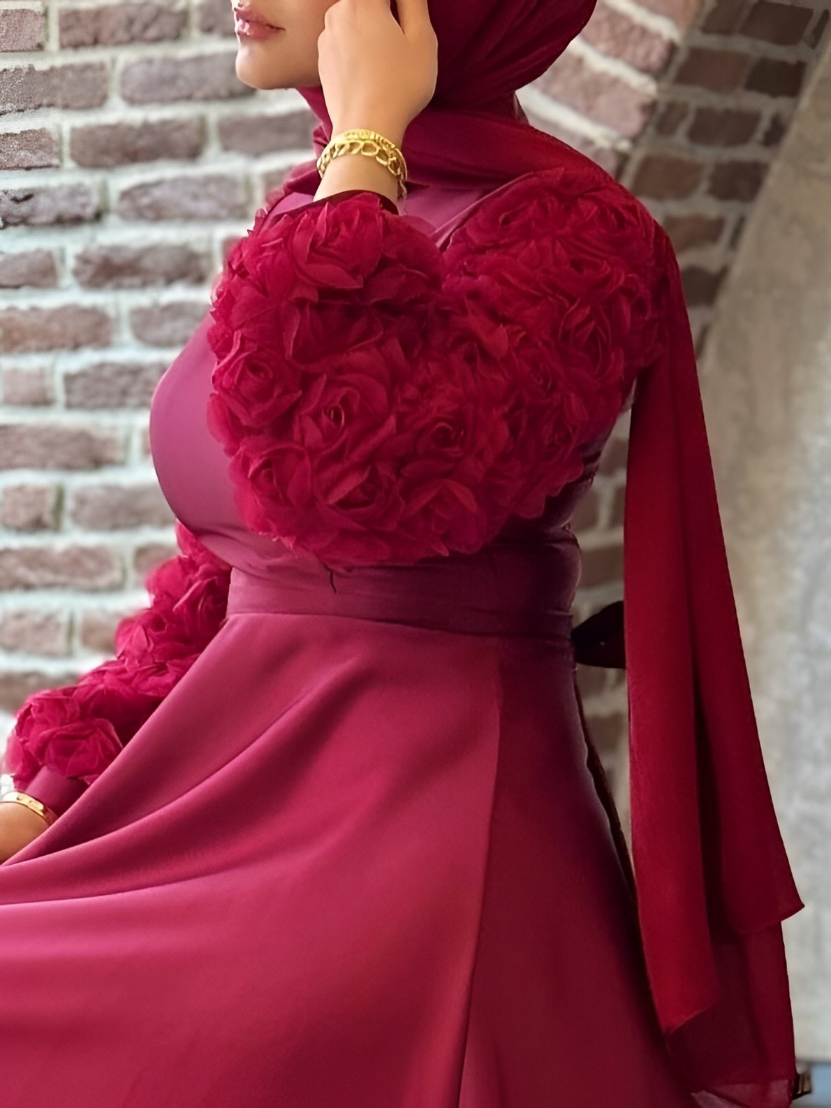 Eteği ve kolları gül detaylı, saten abiye; zarafeti ve şıklığı bir araya getiriyor. Gül işlemeleriyle sofistike bir dokunuş sağlarken, saten kumaşın parlaklığı gece şıklığınızı tamamlar. İnce detaylarla vurgulanan bu abiye, özel davetler, düğünler ve gece etkinlikleri için mükemmel bir tercihtir. Hem romantik hem de zarif bir stil arayanlar için ideal bir seçenek.
