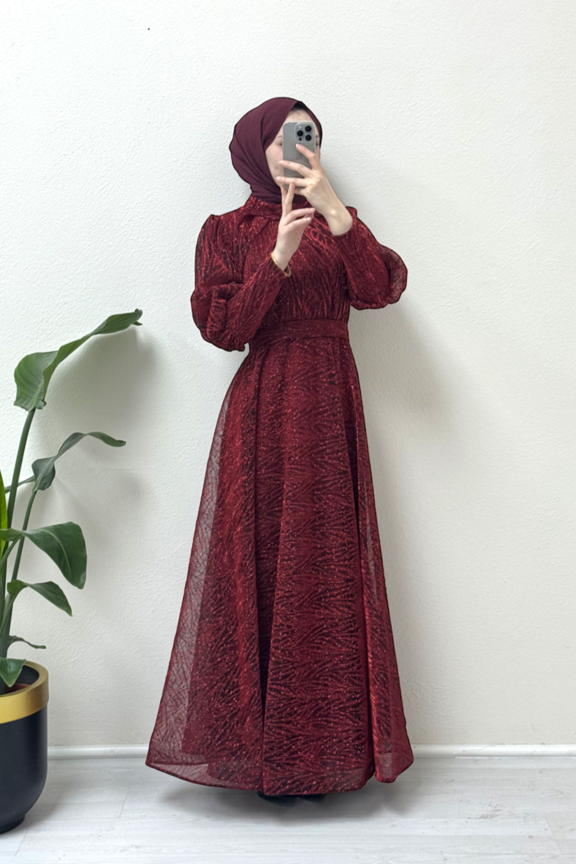 Hakim yaka, balon kol, simli abiye; zarif ve göz alıcı bir tasarıma sahiptir. Hakim yaka, sofistike bir görünüm sunarken balon kollardaki detaylar elbiseye hacim ve zarafet katmaktadır. Simli kumaş, elbiseye ışıltı ve modern bir hava ekler. Bu abiye, özel davetler ve şık etkinlikler için mükemmel bir tercih olup, dikkat çekici ve şık bir görünüm sağlar.