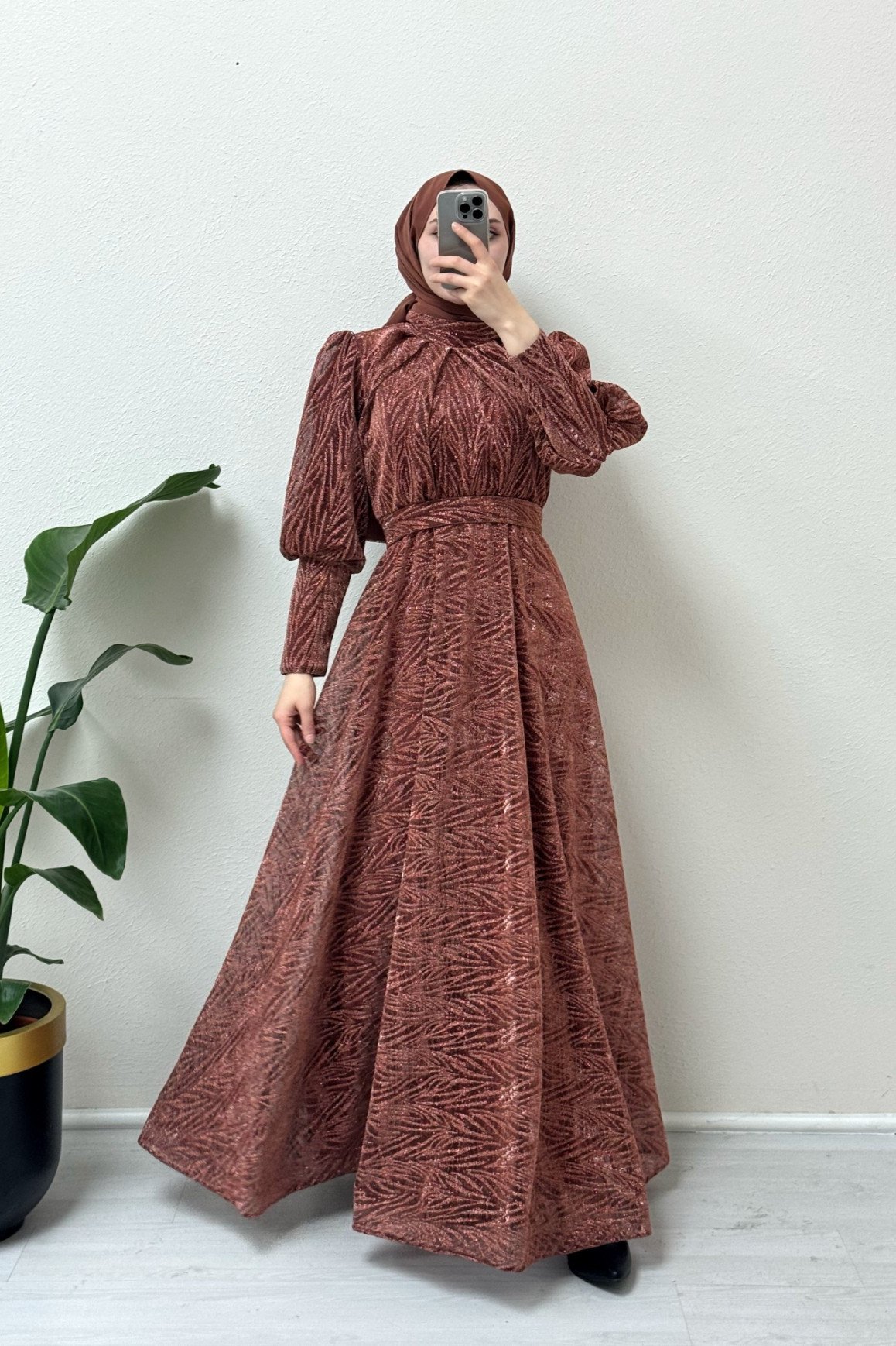 Hakim yaka, balon kol, simli abiye; zarif ve göz alıcı bir tasarıma sahiptir. Hakim yaka, sofistike bir görünüm sunarken balon kollardaki detaylar elbiseye hacim ve zarafet katmaktadır. Simli kumaş, elbiseye ışıltı ve modern bir hava ekler. Bu abiye, özel davetler ve şık etkinlikler için mükemmel bir tercih olup, dikkat çekici ve şık bir görünüm sağlar.