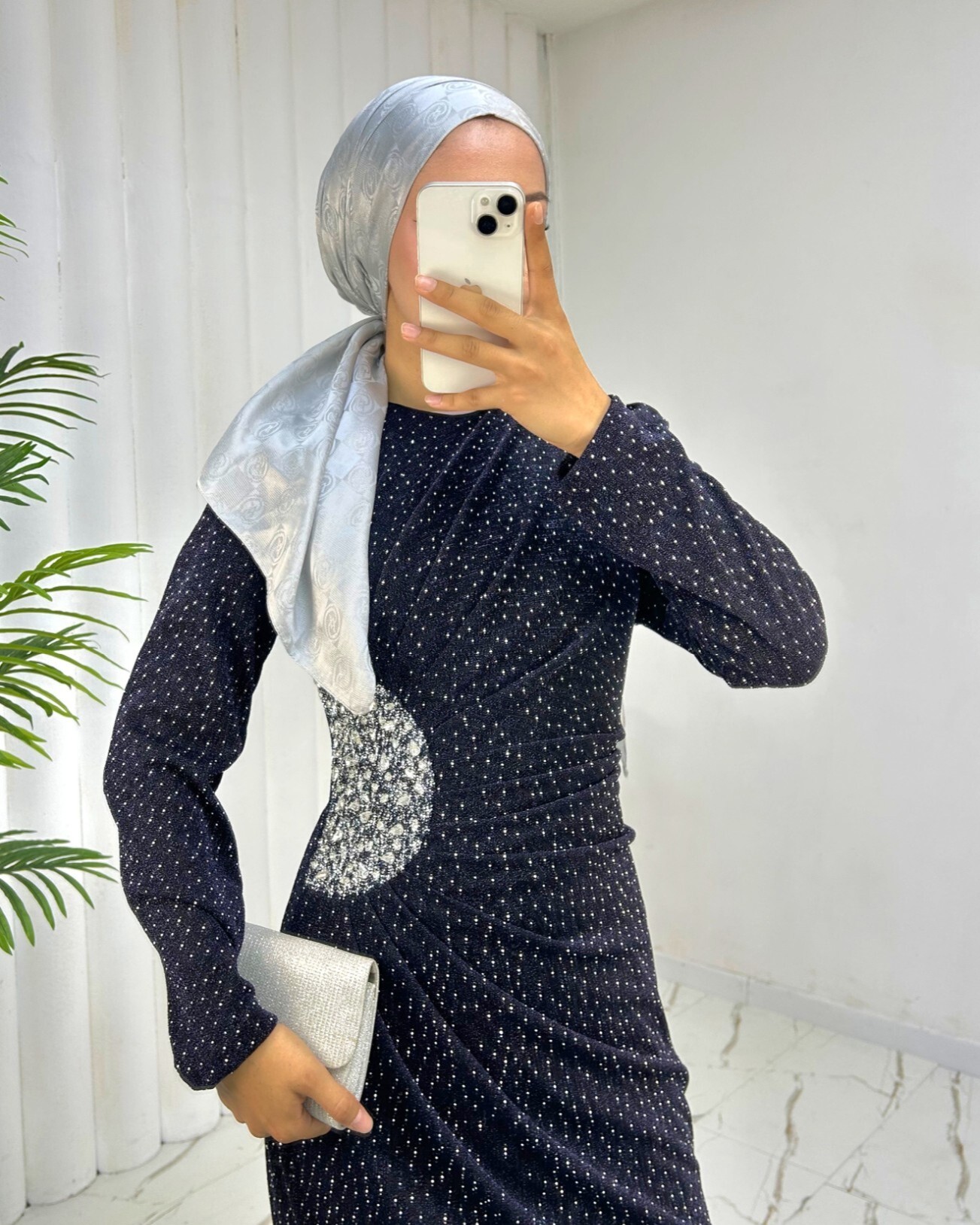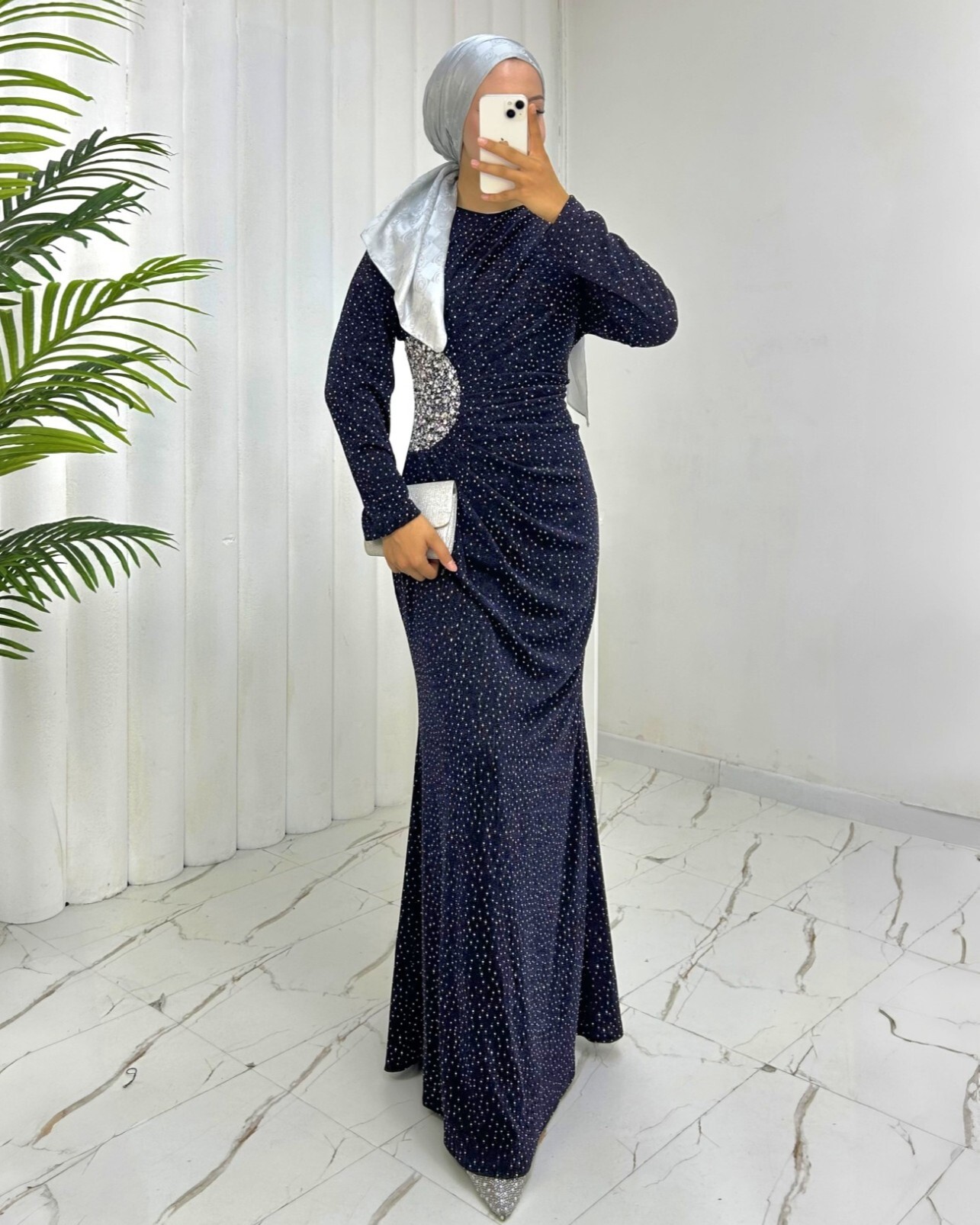Önü Drapeli Taşlı Uzun Abiye, zarafeti ve ışıltıyı bir araya getirerek göz kamaştıran bir görünüm sunar. Drapeli tasarımı vücut hatlarını kusursuz şekilde sararken, taş detaylarıyla şıklığı zirveye taşır. Düğün, nişan, mezuniyet ve tüm özel davetler için ideal bir tercih.