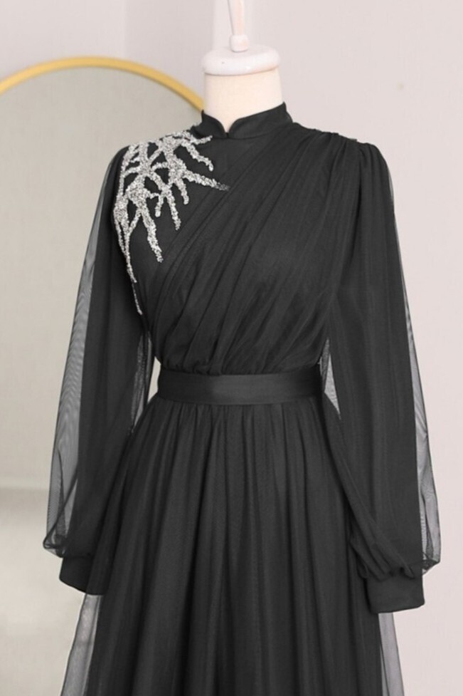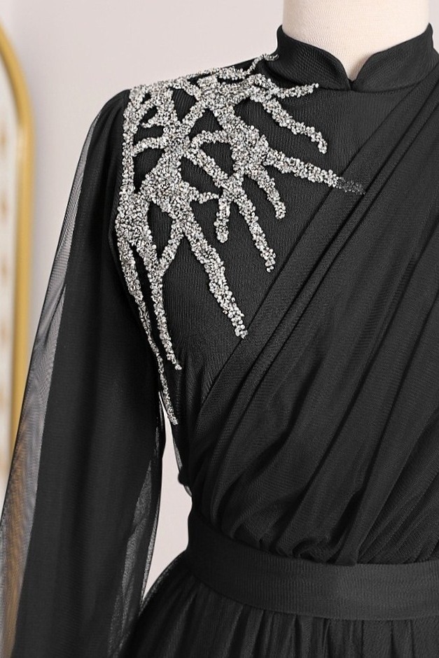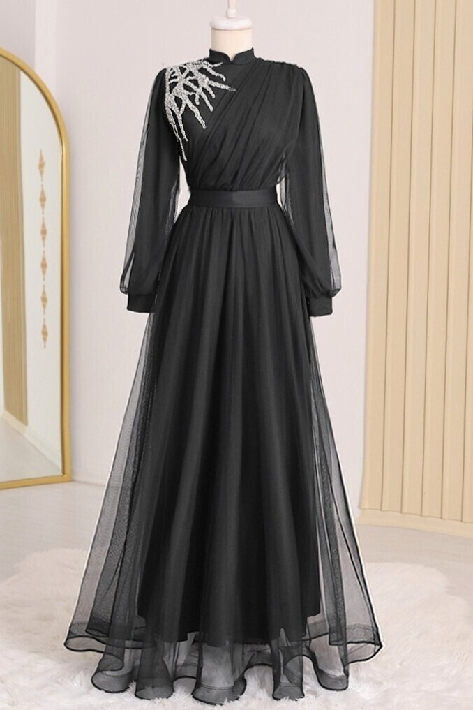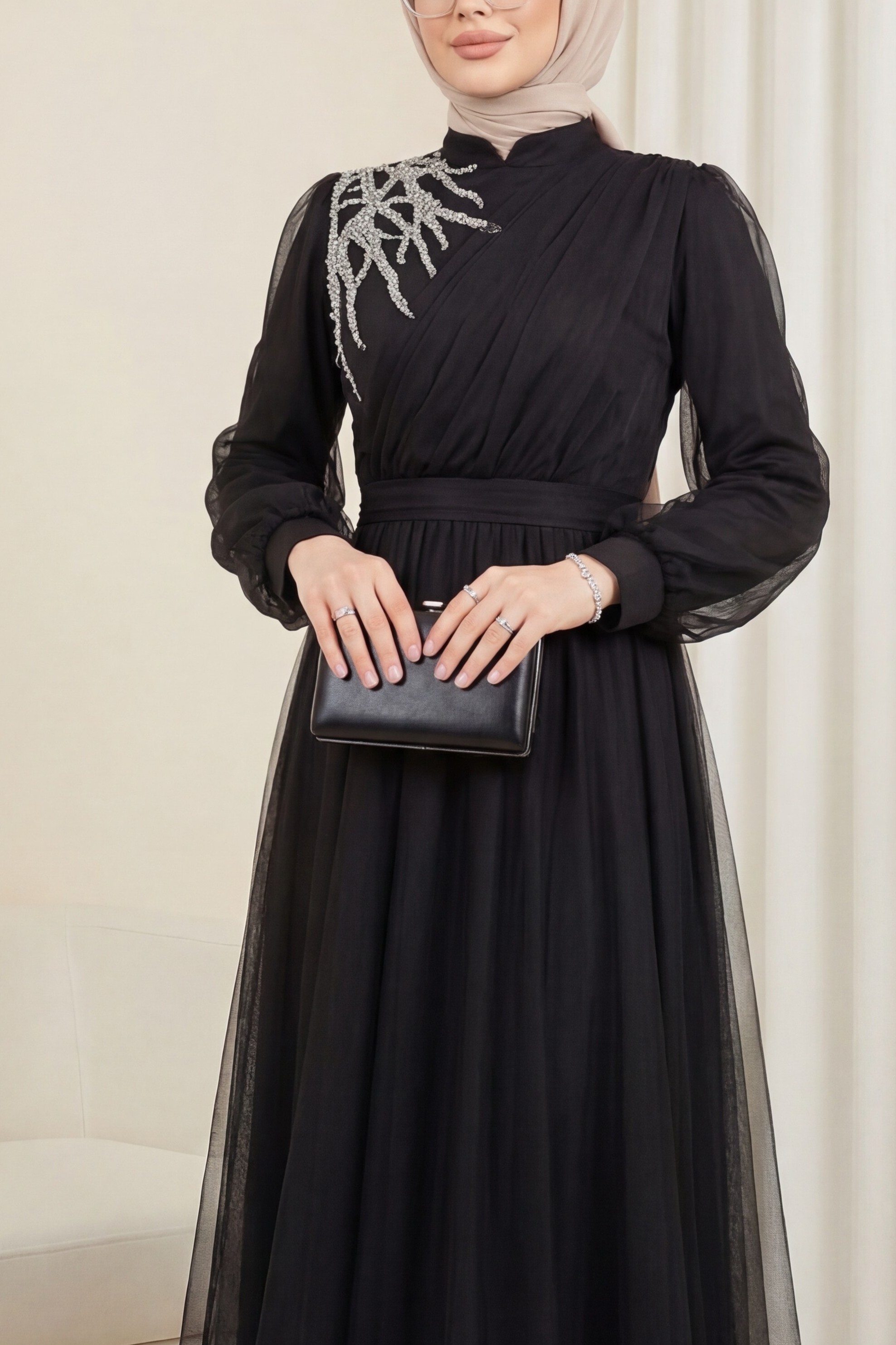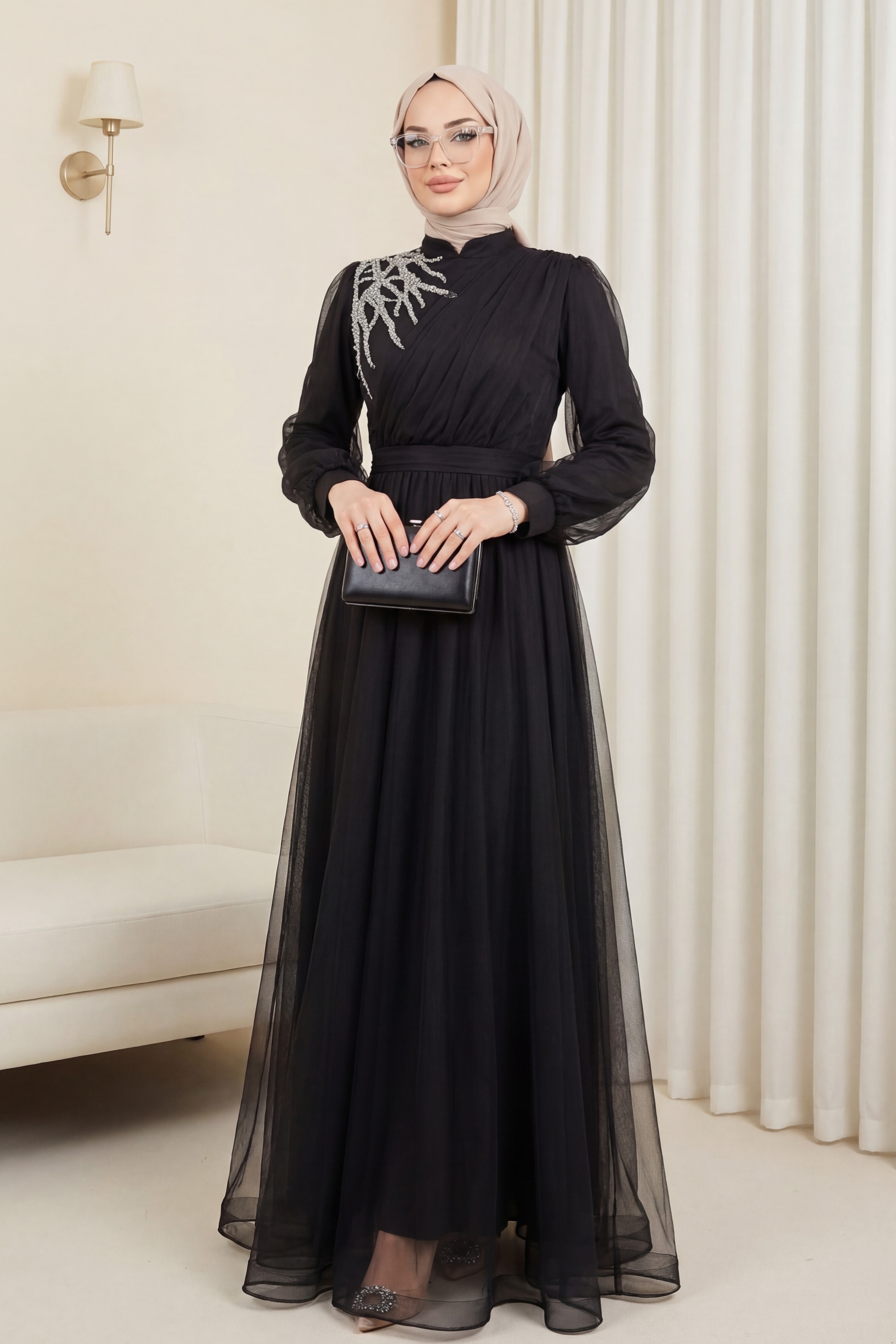 Önü Taş Detaylı Drapeli Kemerli Tül Abiye -Siyah