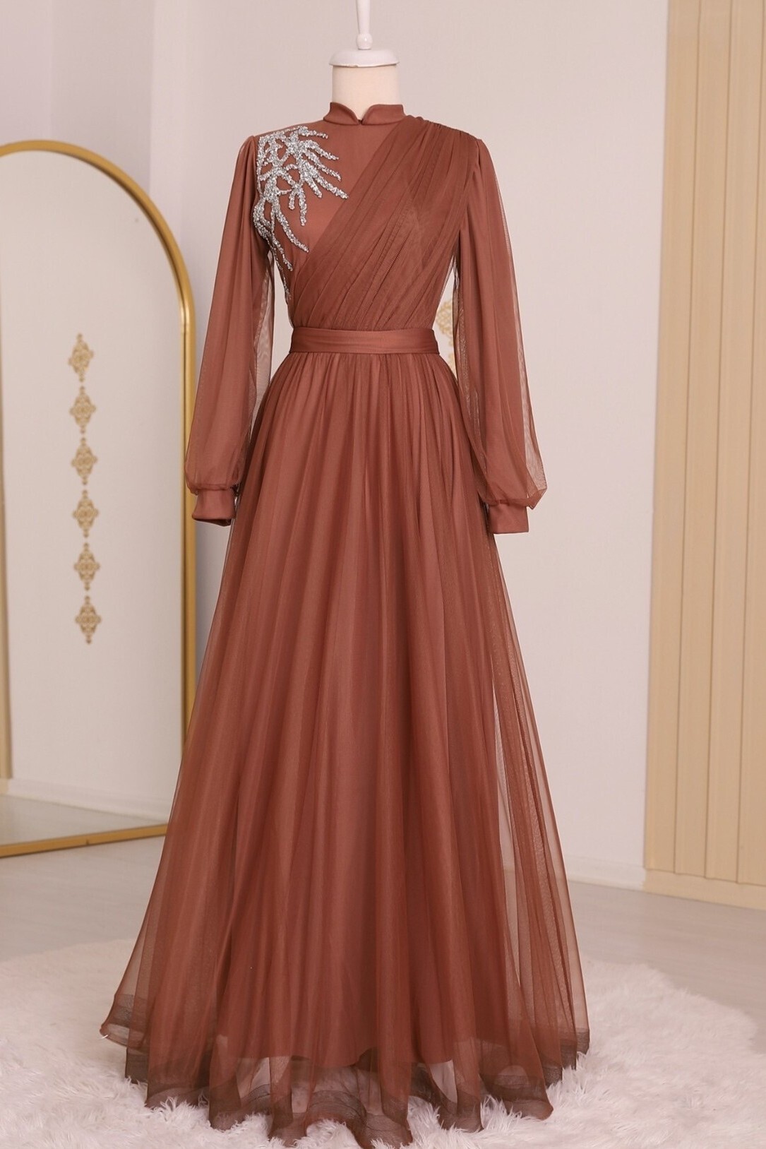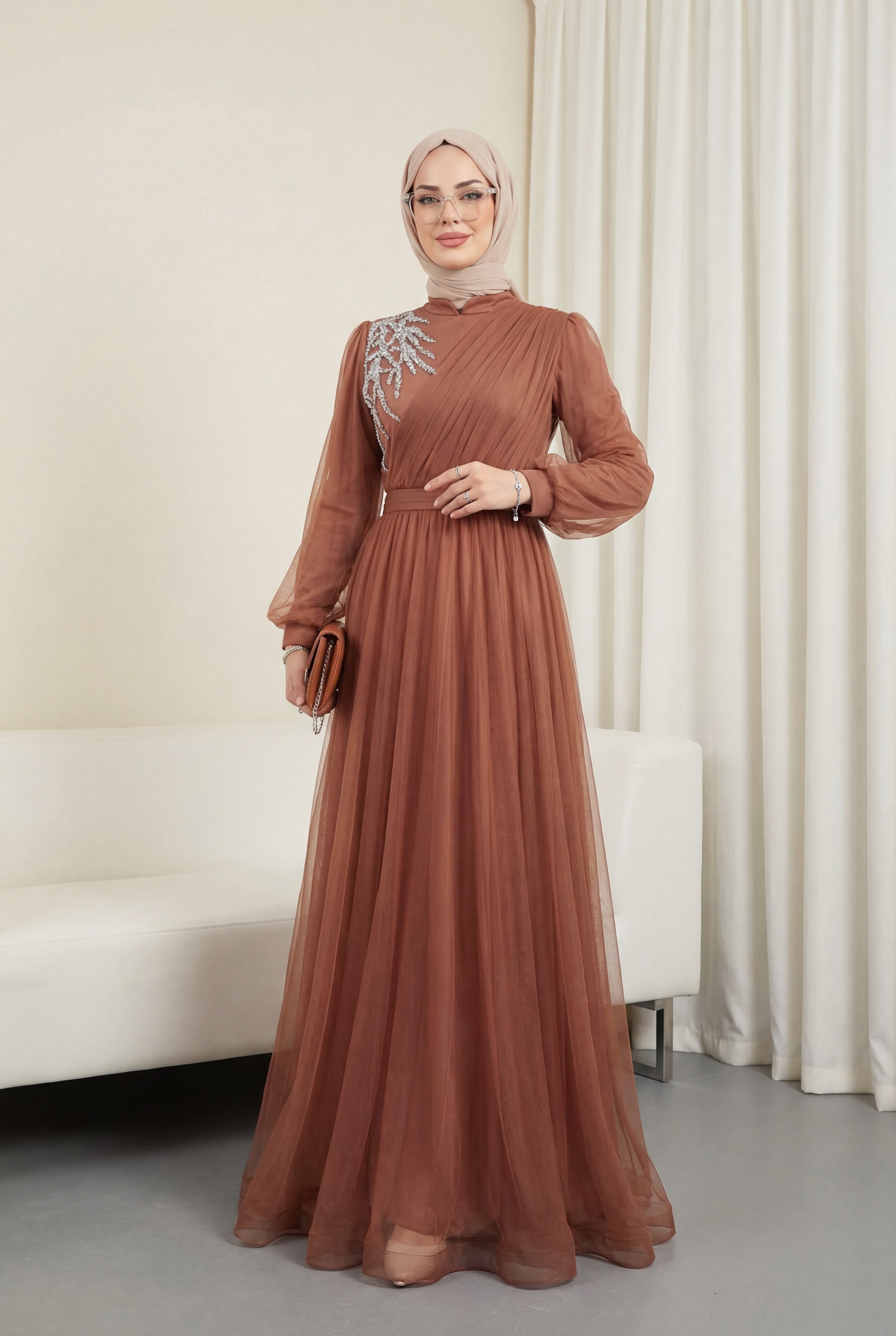 Önü Taş Detaylı Drapeli Kemerli Tül Abiye -Tarçın