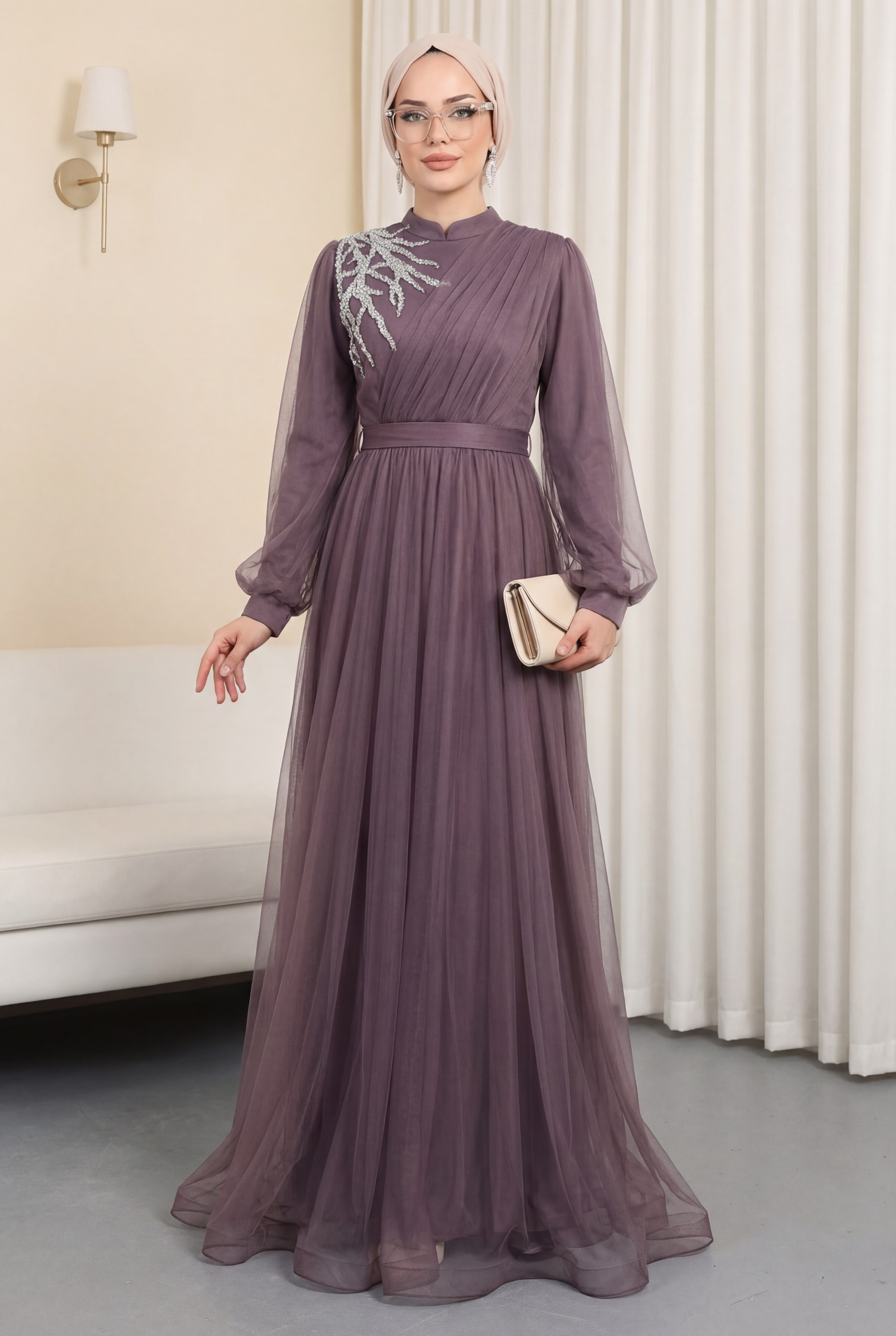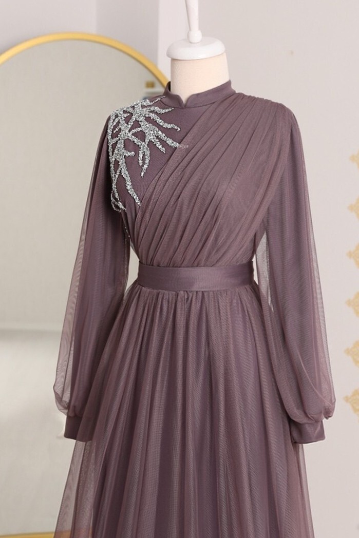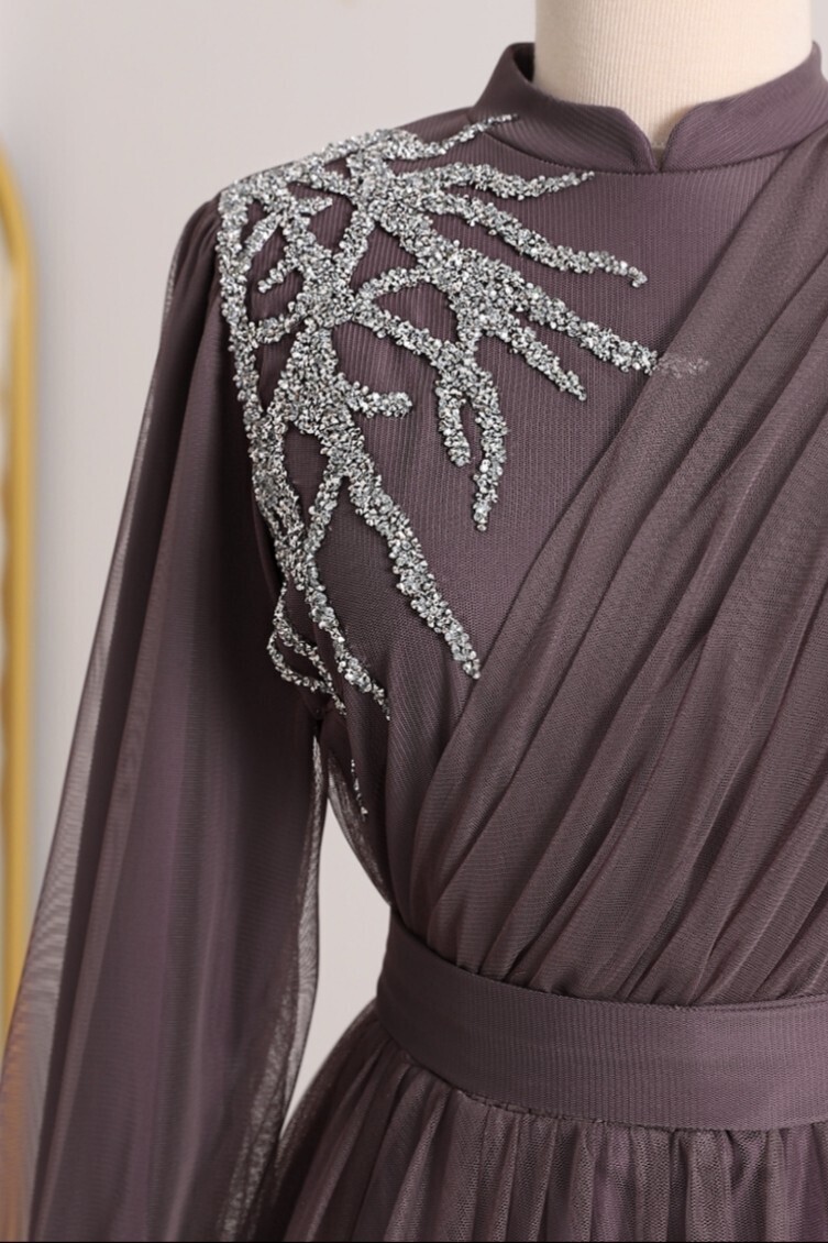 Önü taş detaylı, drapeli, hakim yaka, kemerli, arkadan fermuarlı, astarlı tül abiye modelimiz yeni sezonun en rağbet gören parçalarındandır.