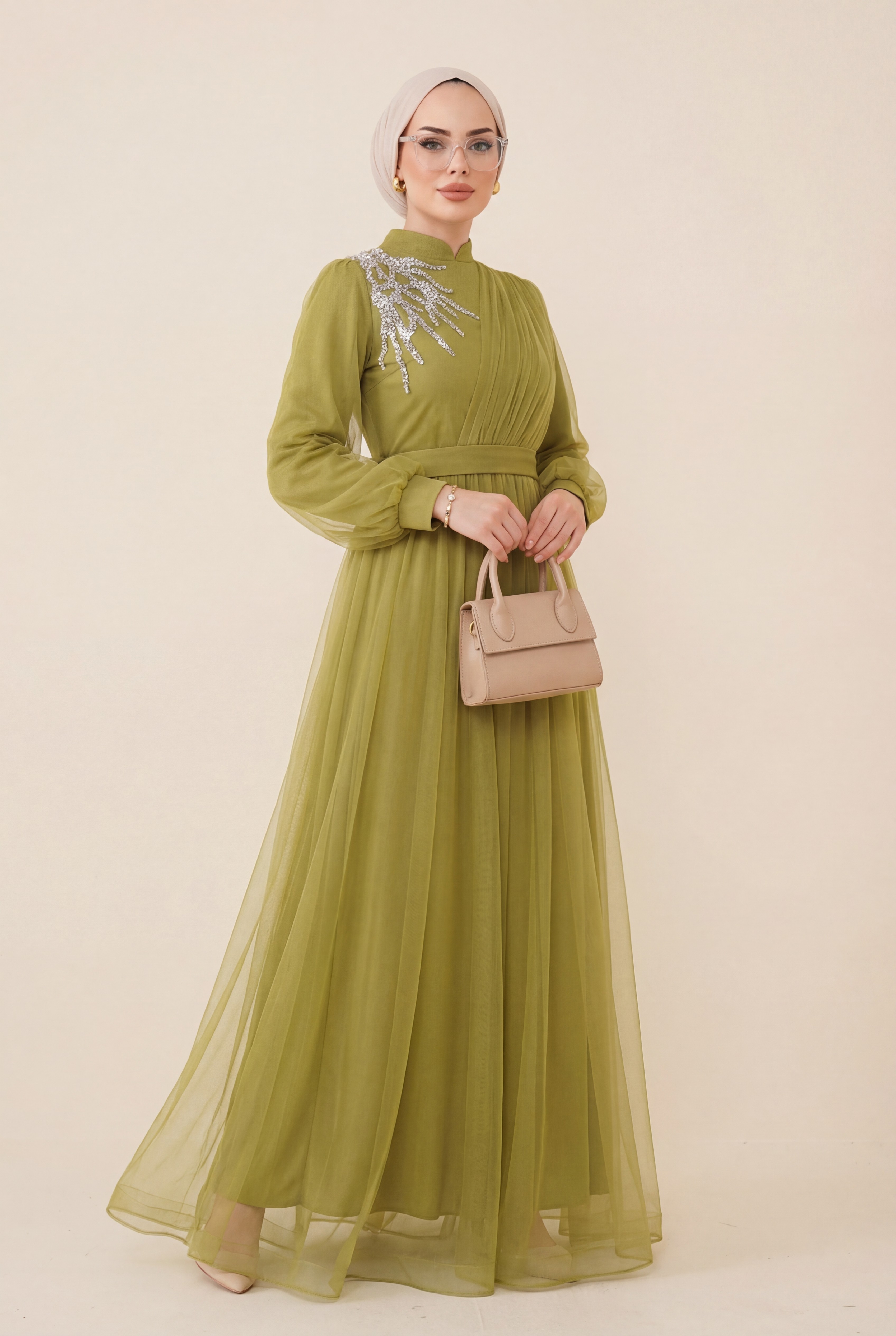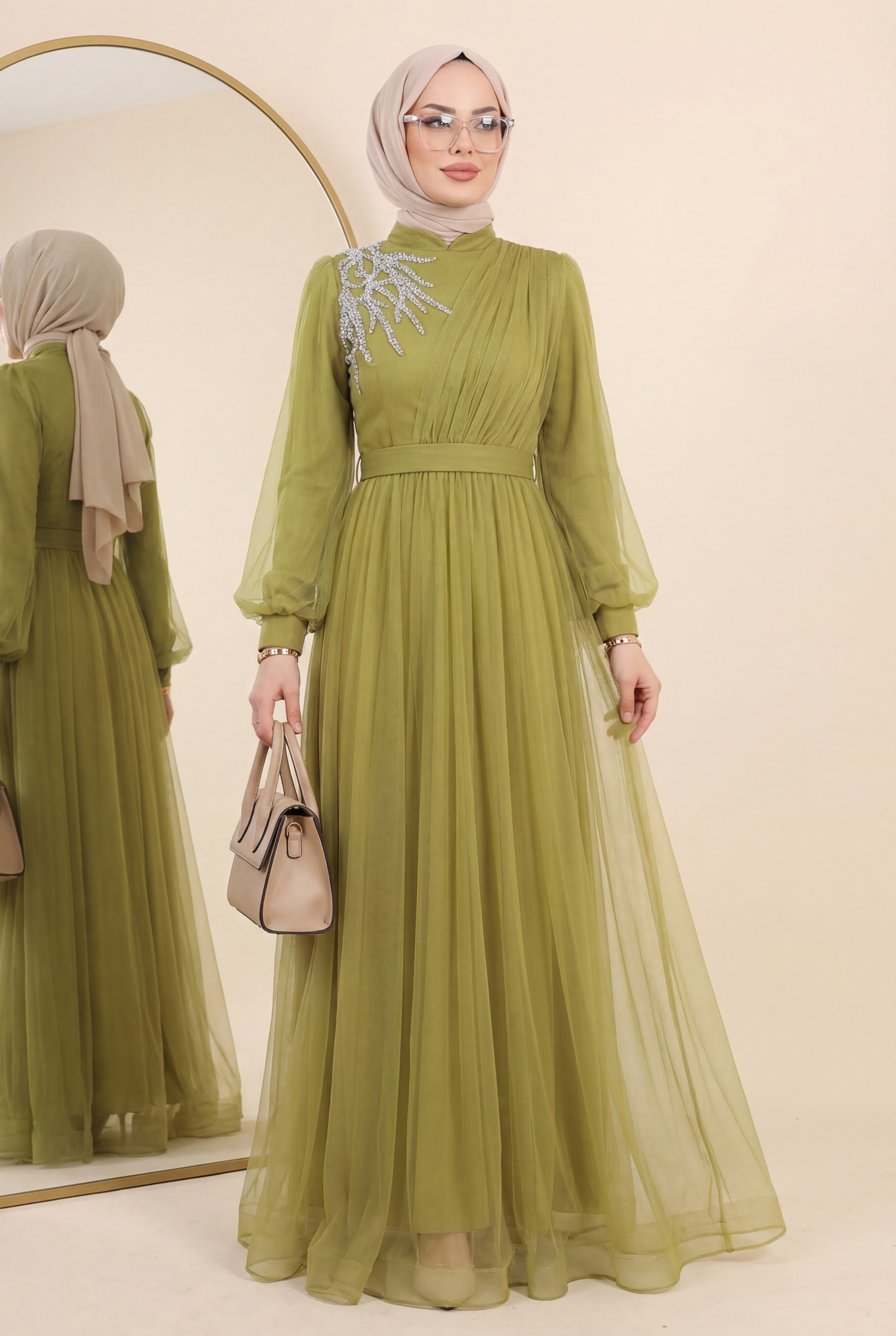 Önü Taş Detaylı Drapeli Kemerli Tül Abiye -Yağ Yeşili