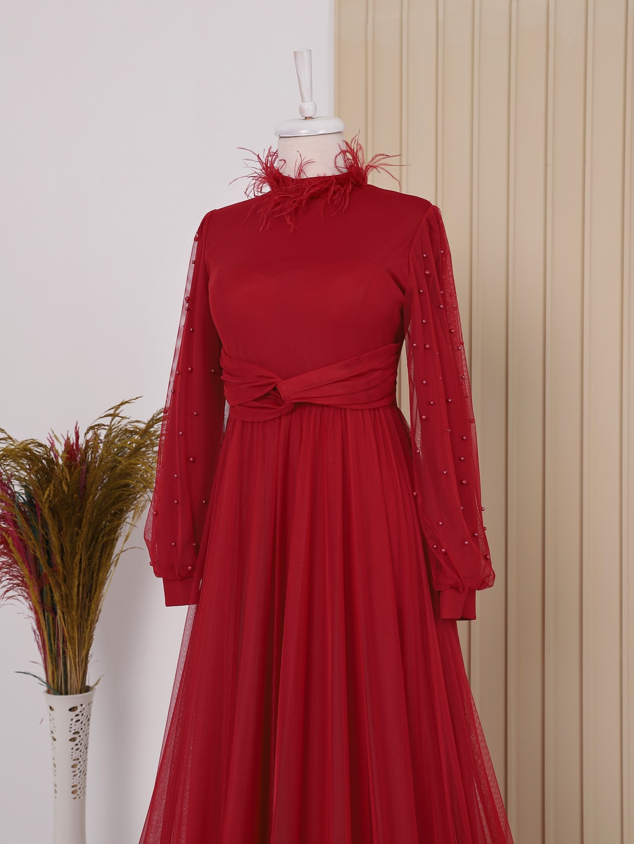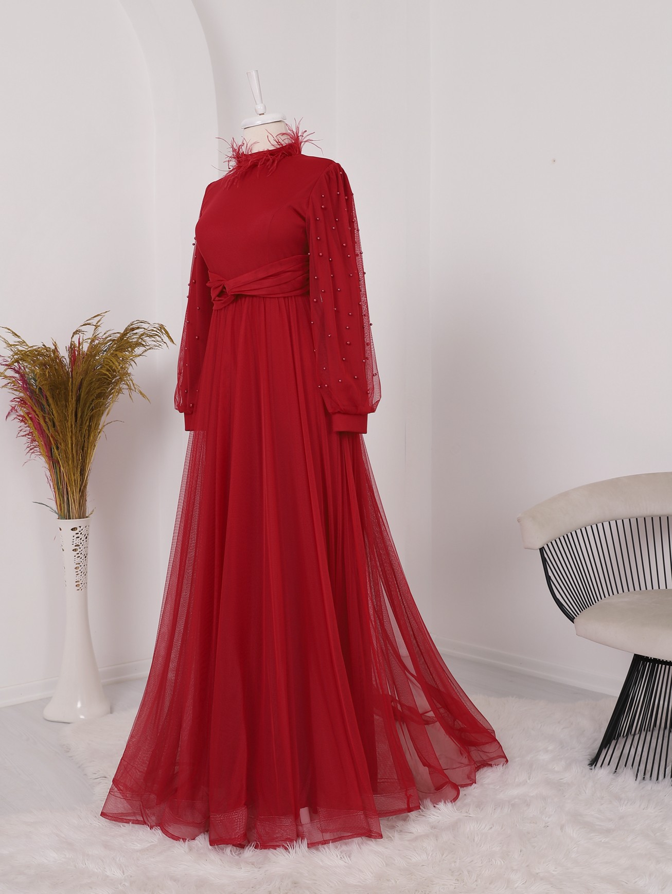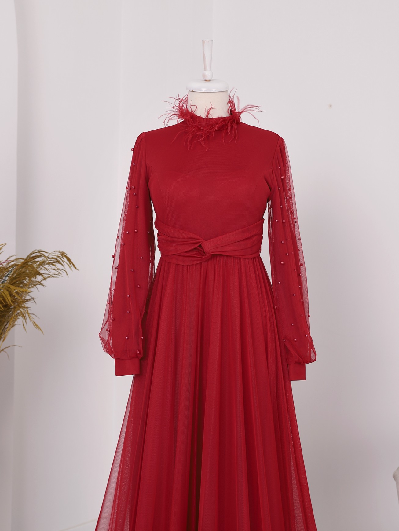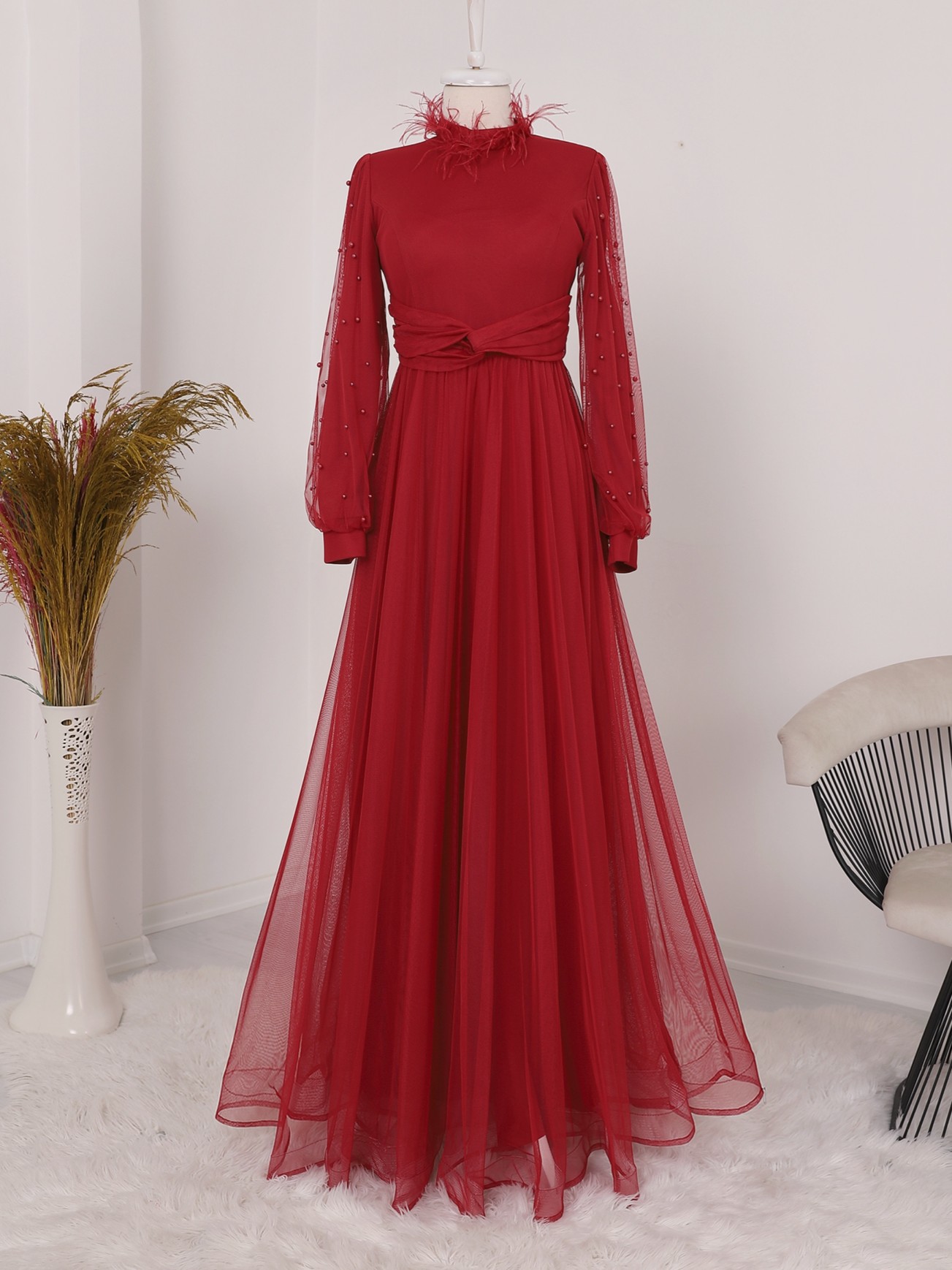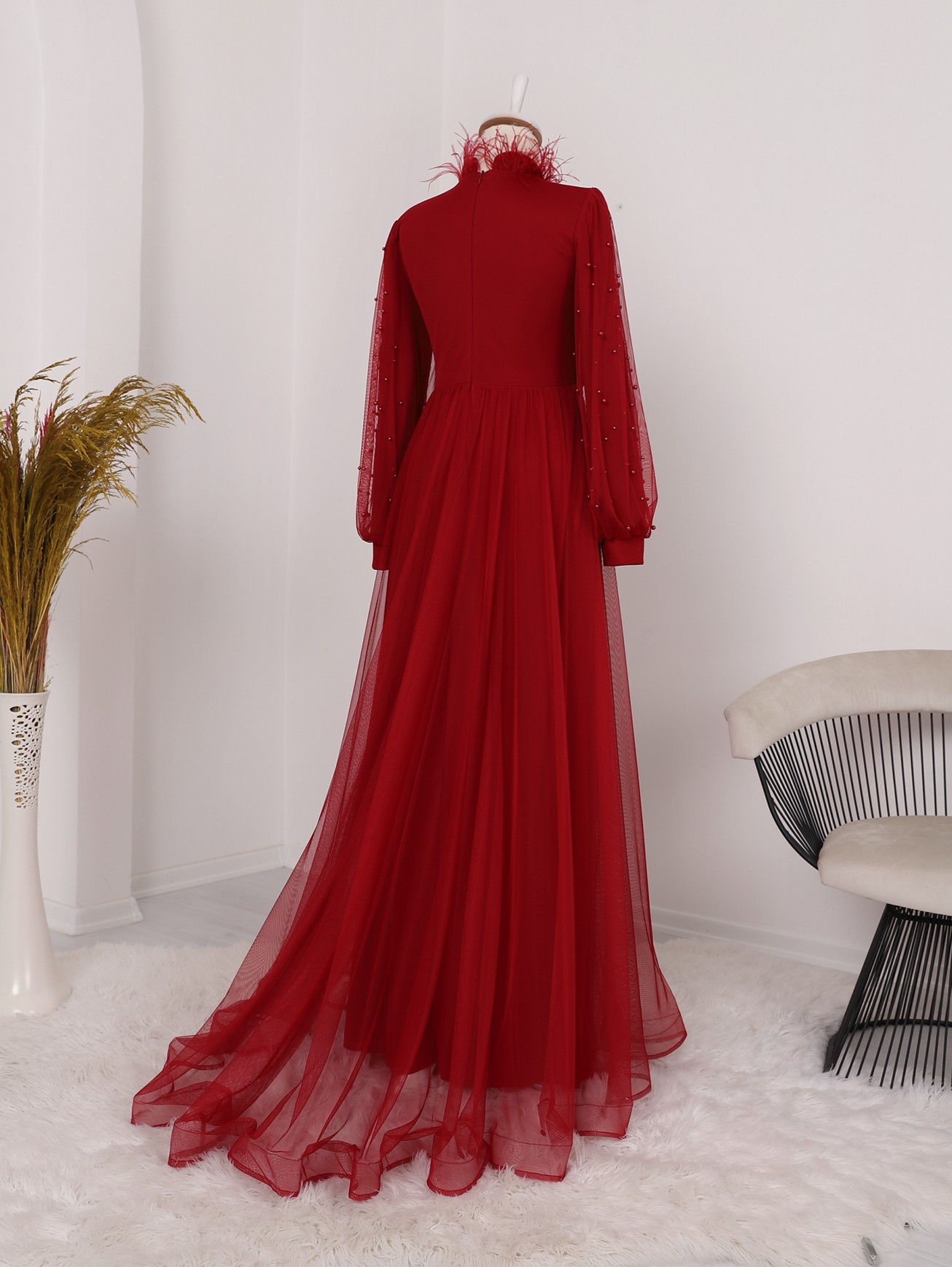 Yakası Tüylü Tül Abiye -Bordo - 313-4305-R04