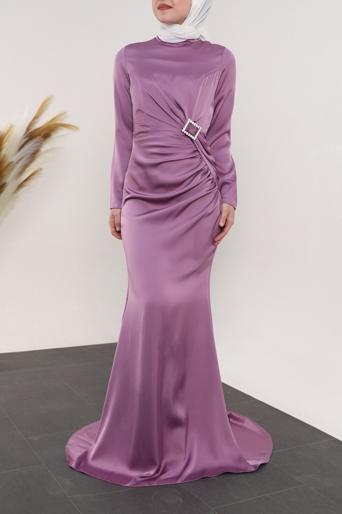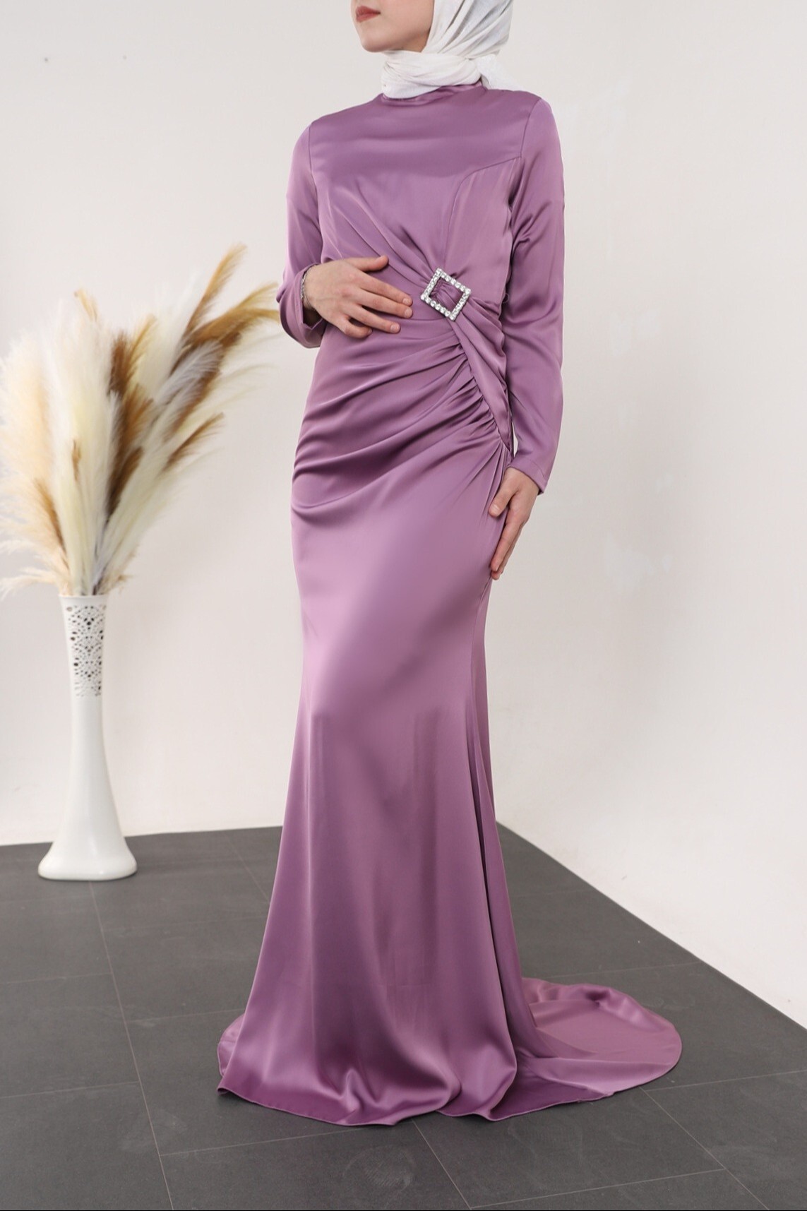 Hakim yaka, beli taşlı kemer detaylı, önü kısa arkası uzun, arkadan fermuarlı, astarsız, saten abiye modelimiz yeni sezonun en rağbet gören parçalarındandır.