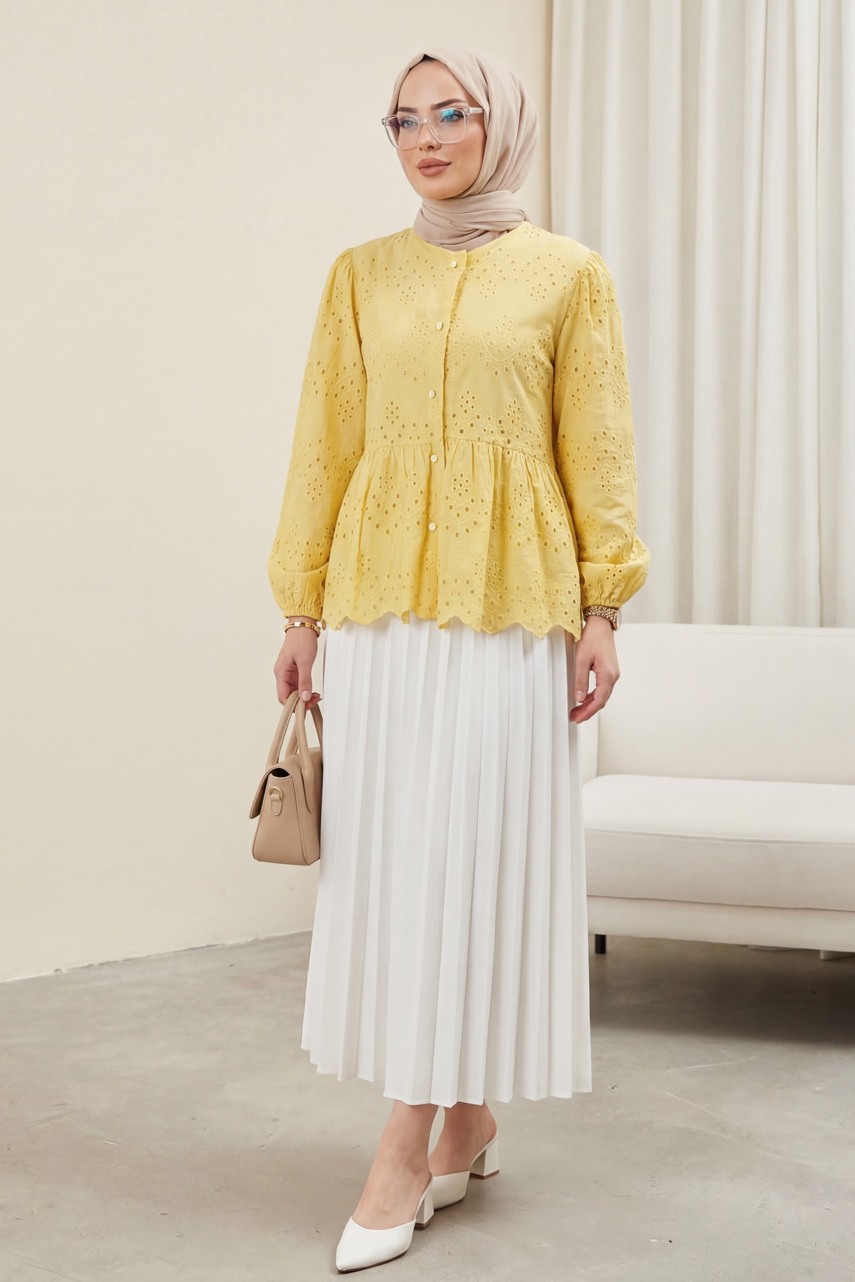 Kolu Lastikli Ajurlu Düğmeli Astarlı Gömlek -Sarı