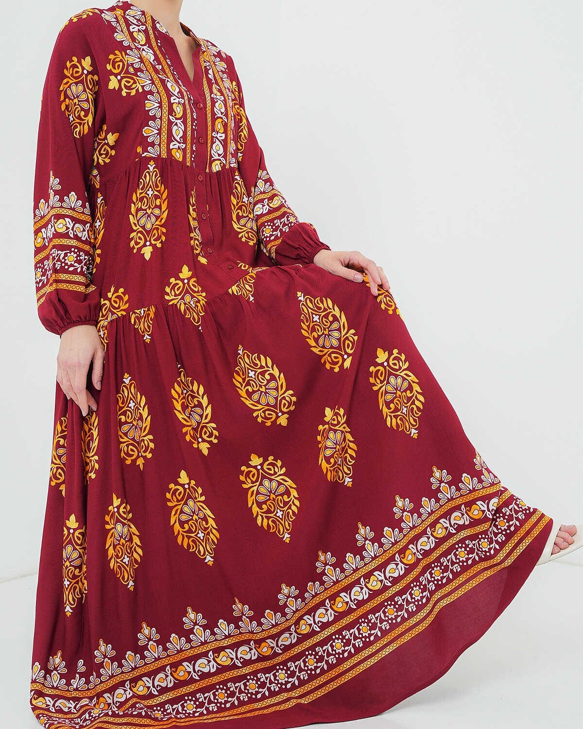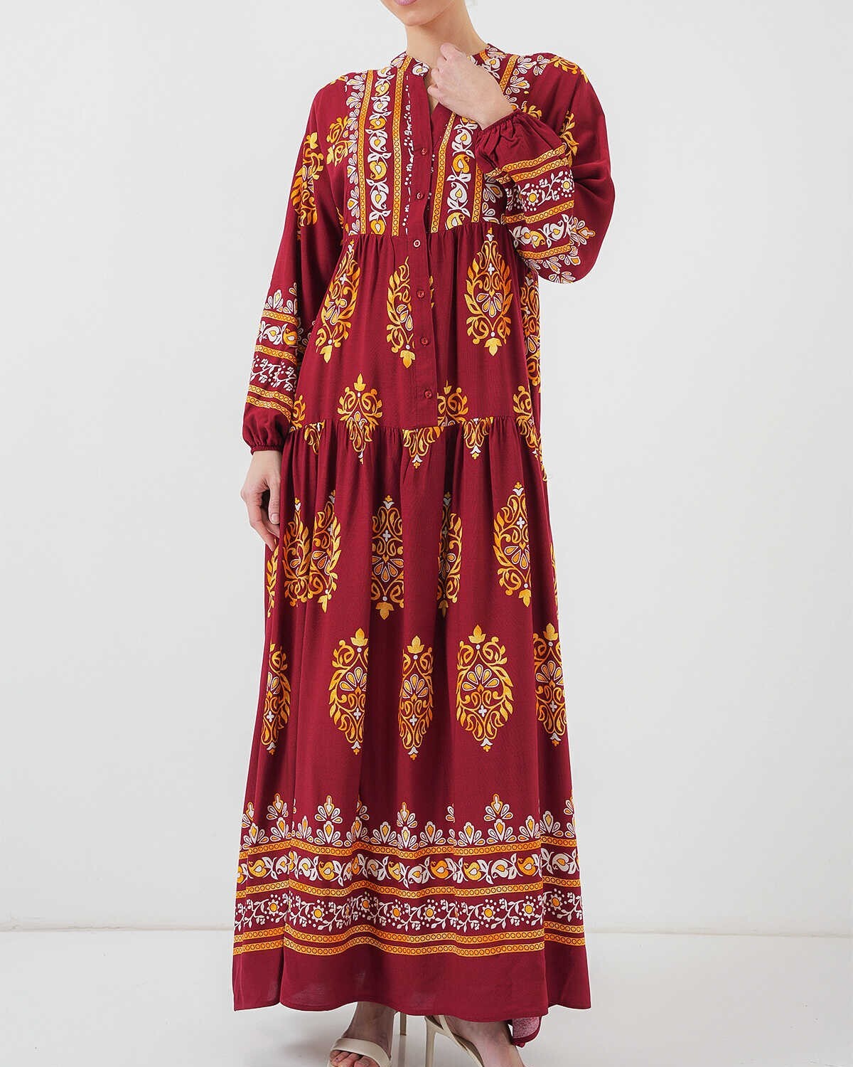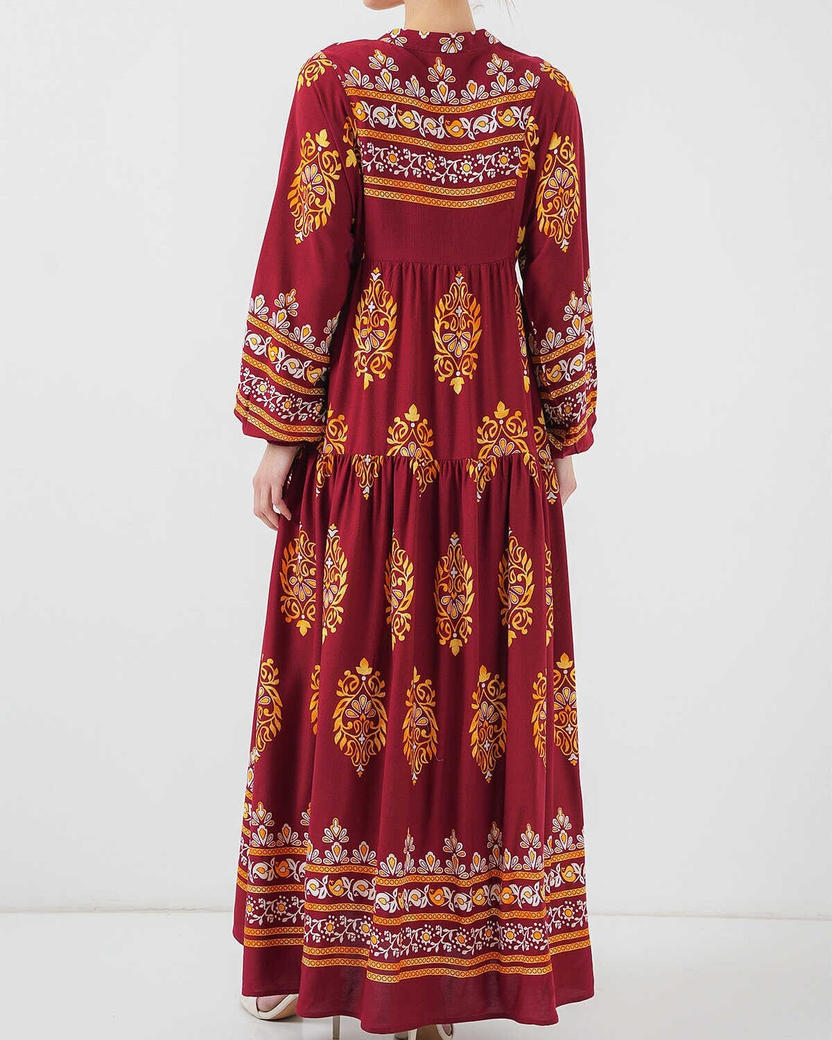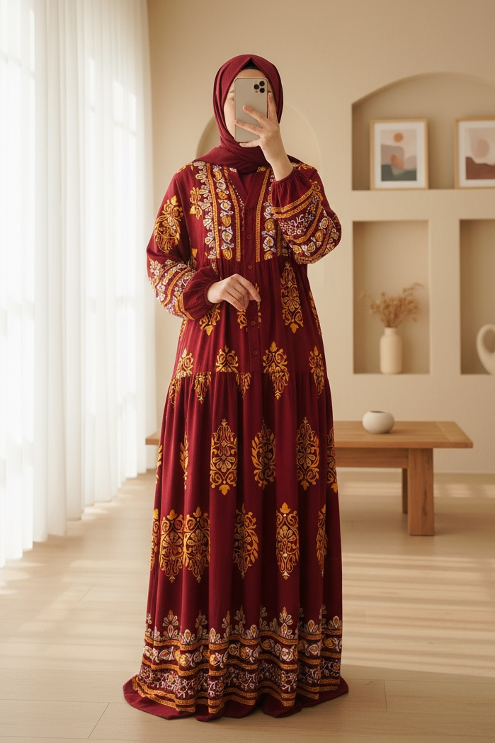 2423 Otantik Desenli Tesettür Elbise - E. Bordo