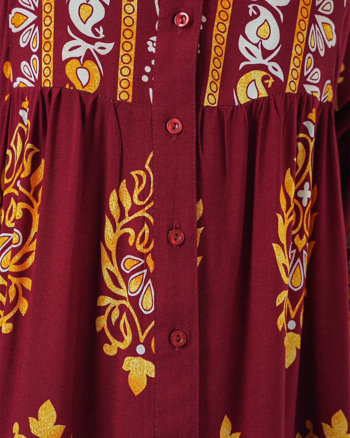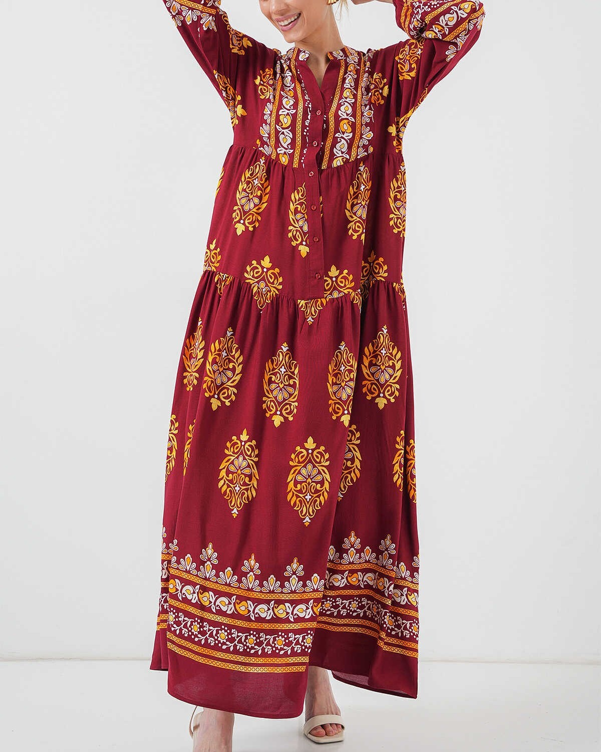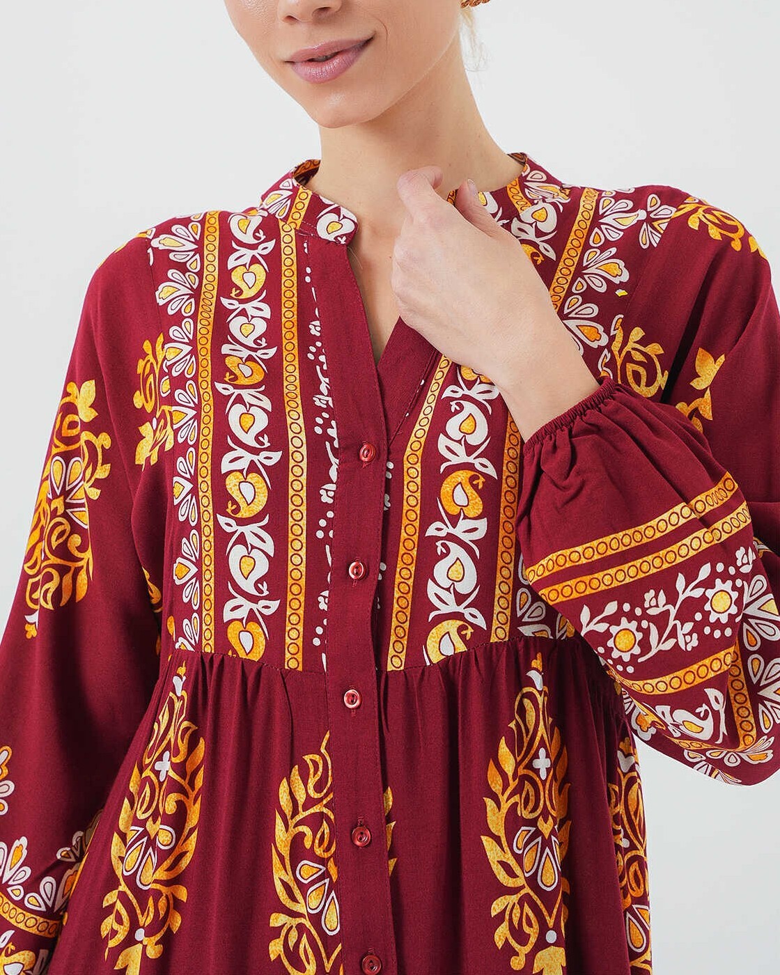 2423 Otantik Desenli Tesettür Elbise - E. Bordo
