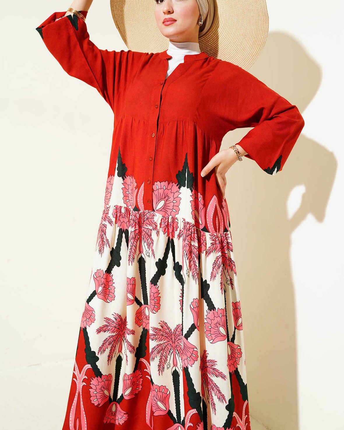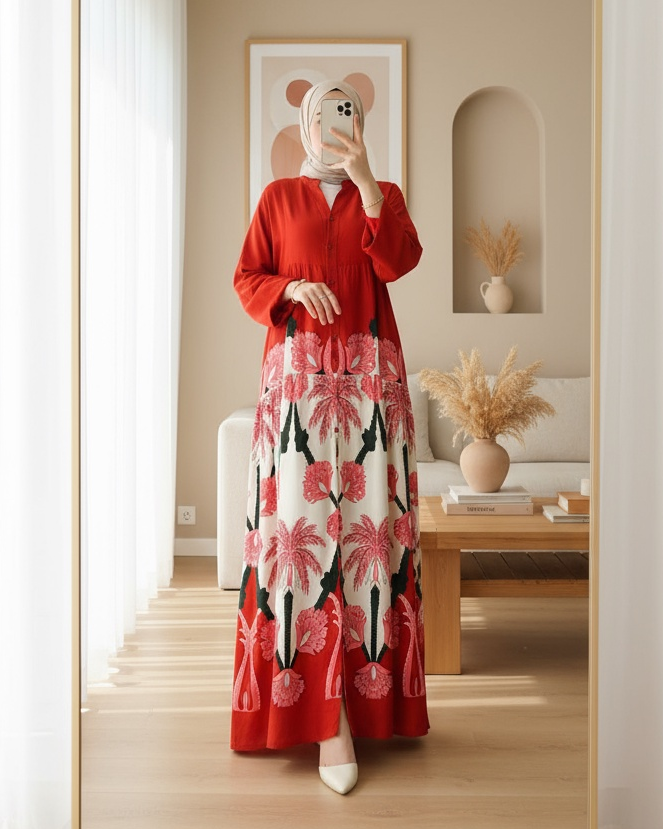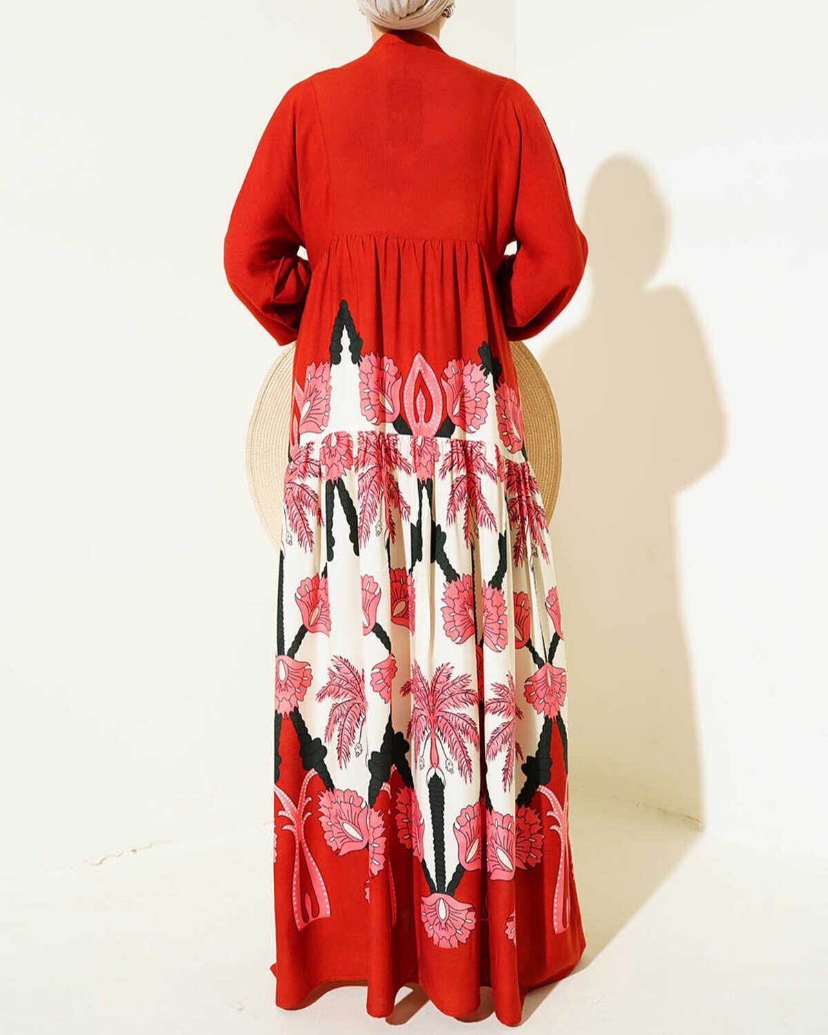 2423 Otantik Desenli Tesettür Elbise - F.Bordo