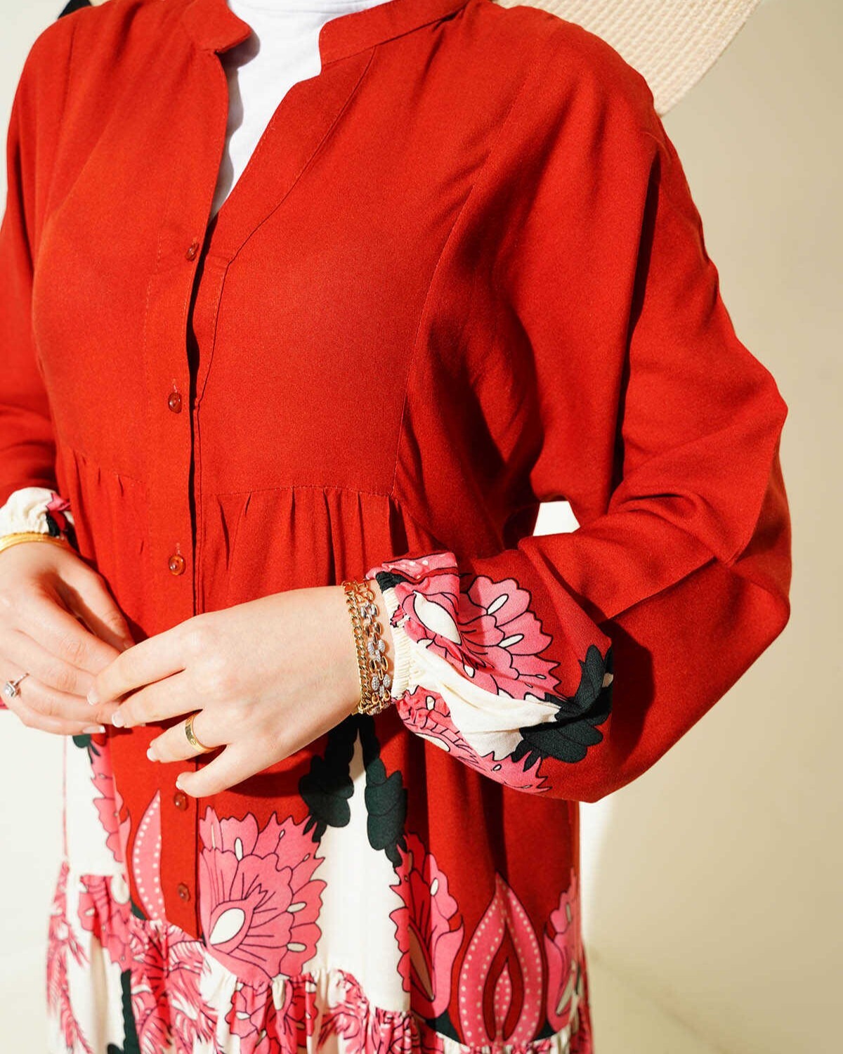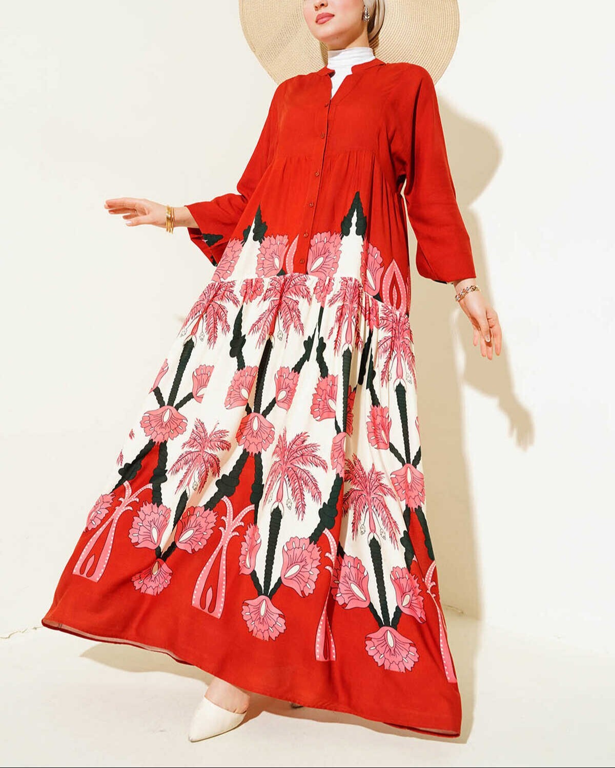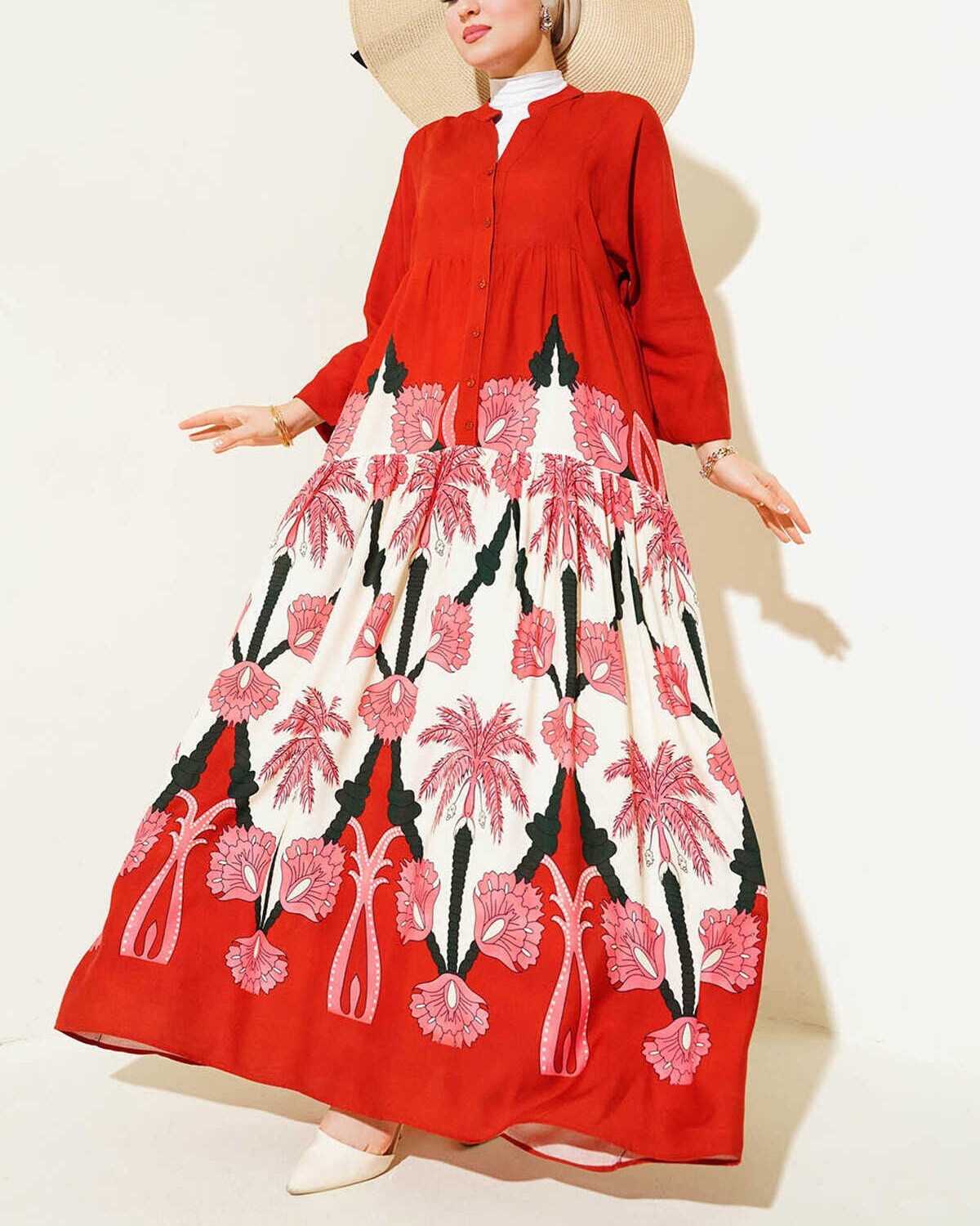 2423 Otantik Desenli Tesettür Elbise - F.Bordo