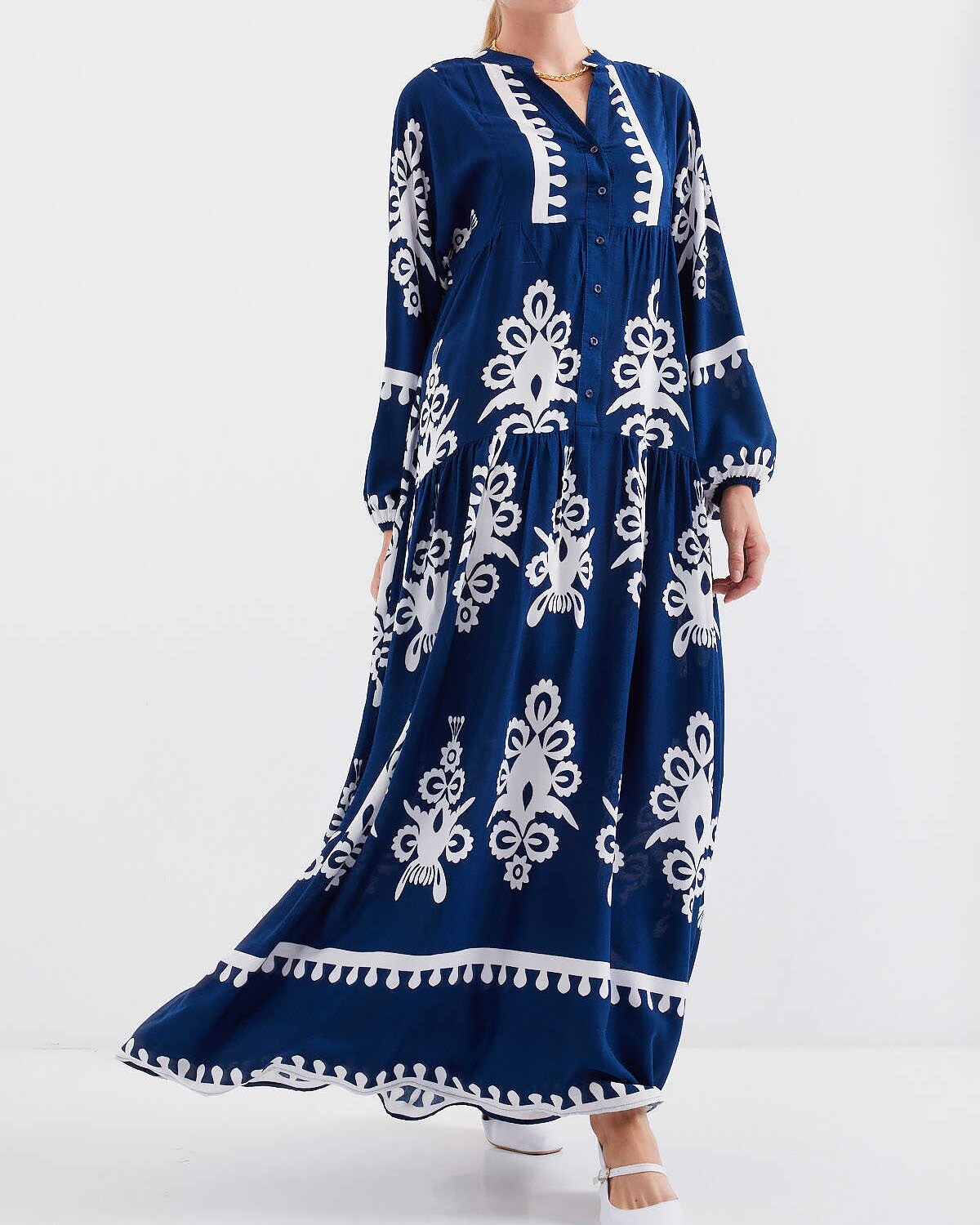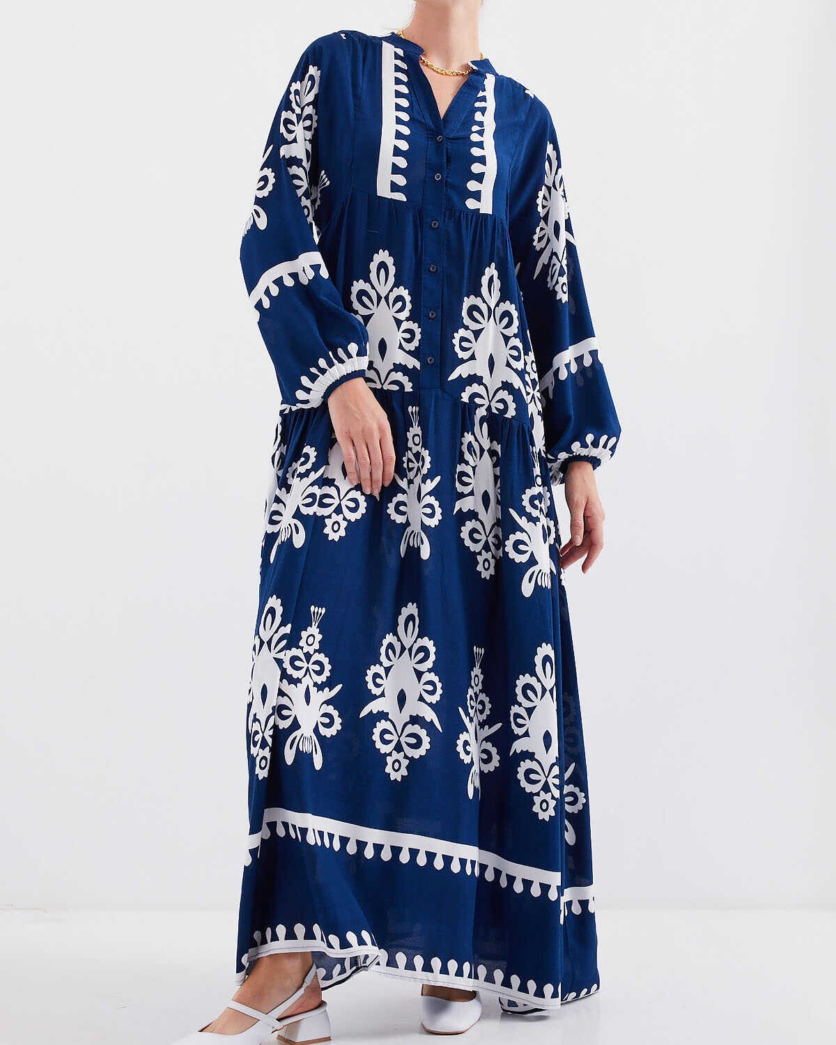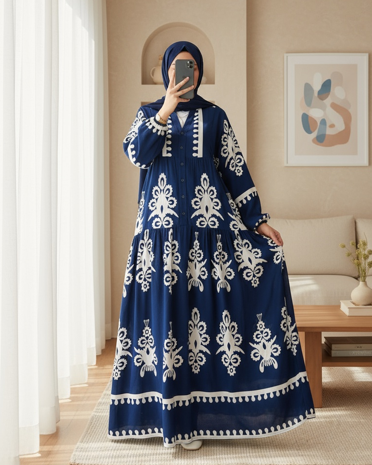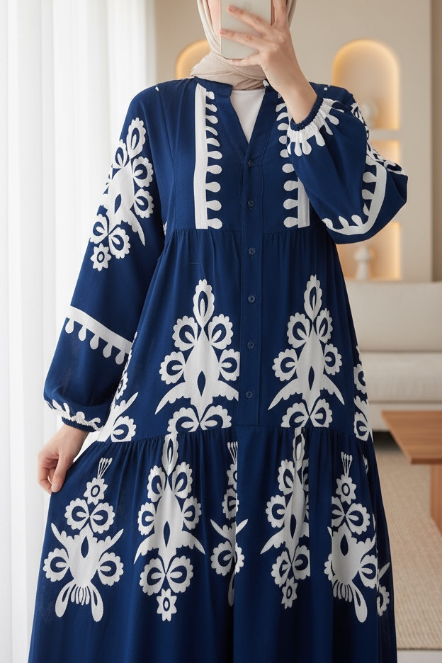 2423 Otantik Desenli Tesettür Elbise - F.Lacivert