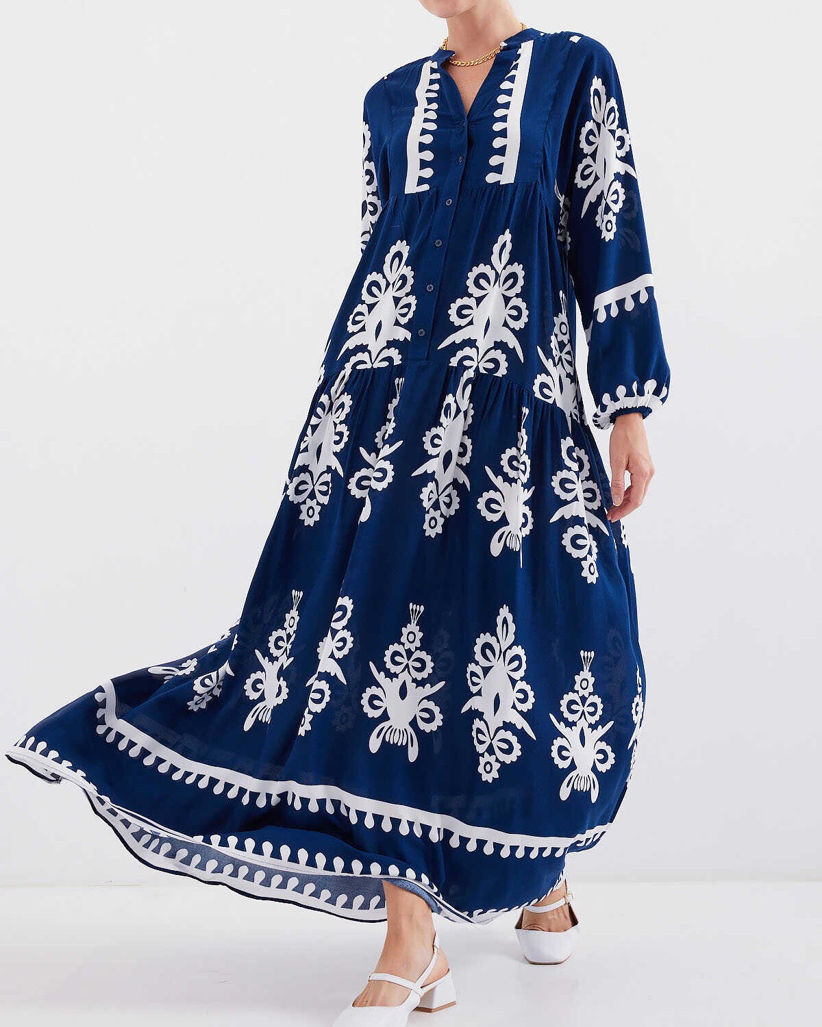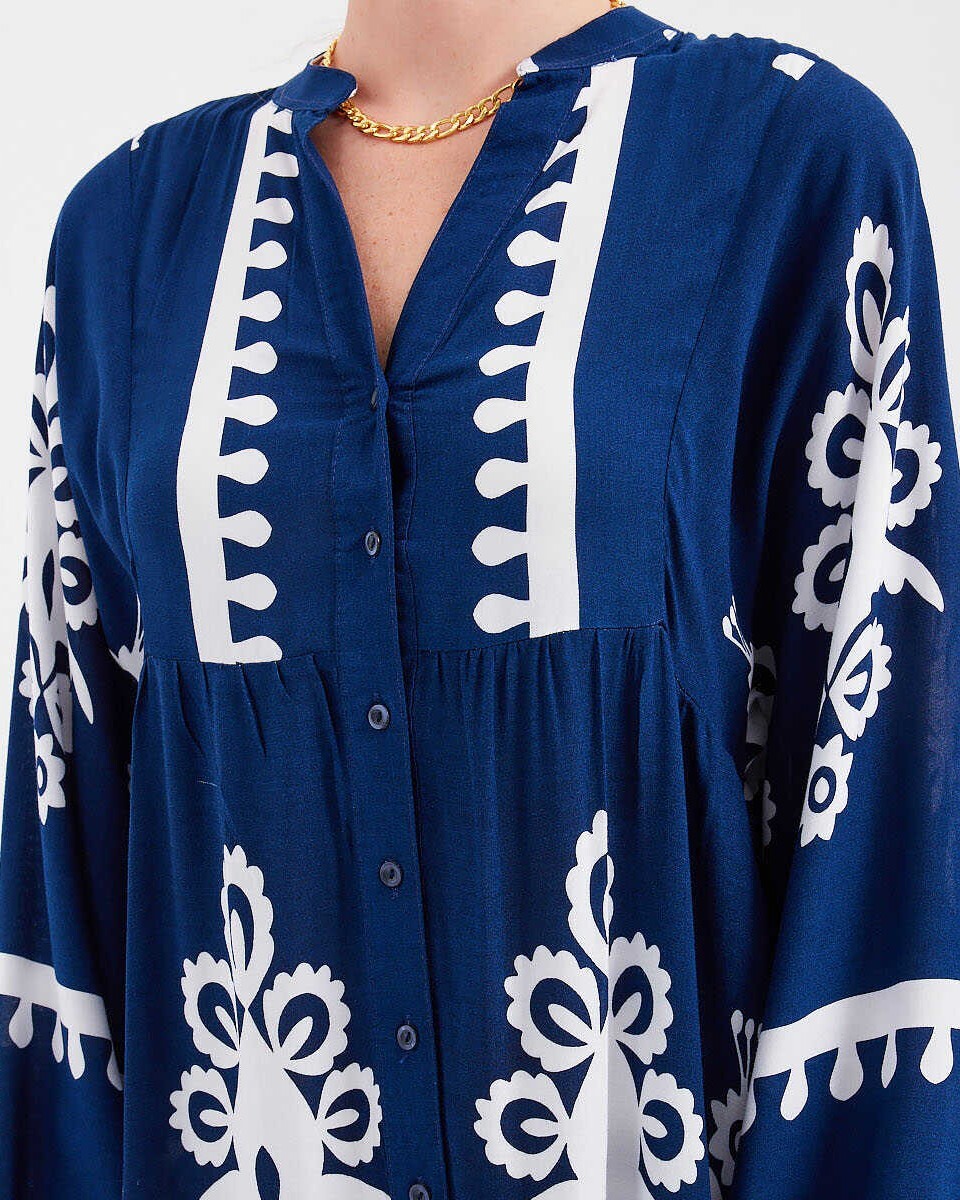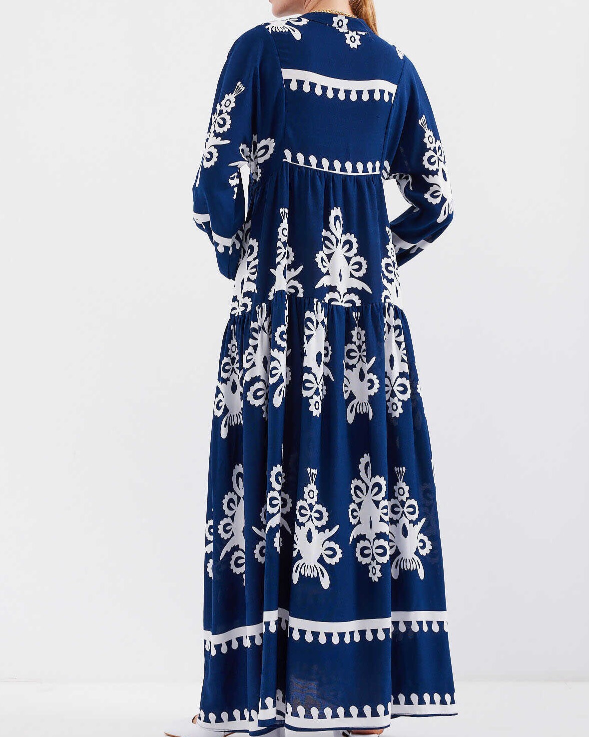 2423 Otantik Desenli Tesettür Elbise - F.Lacivert