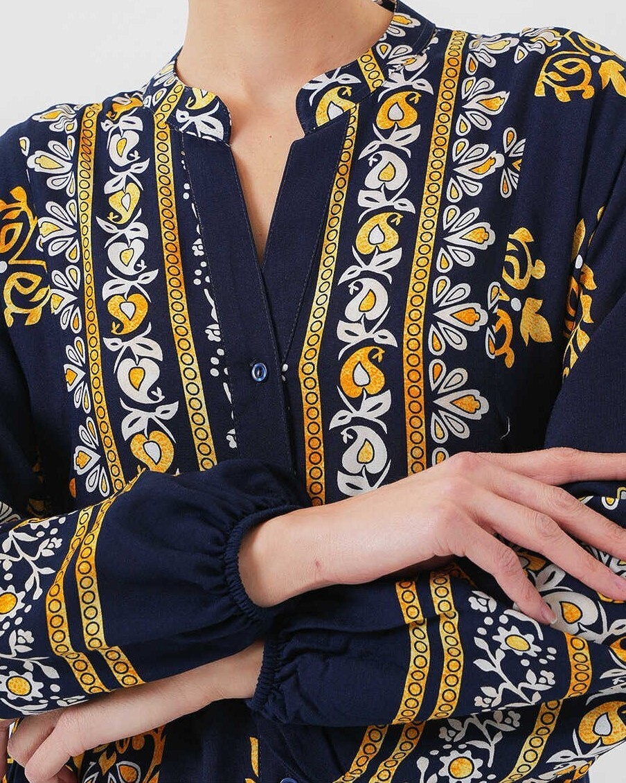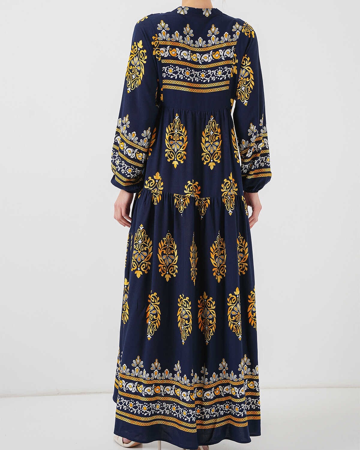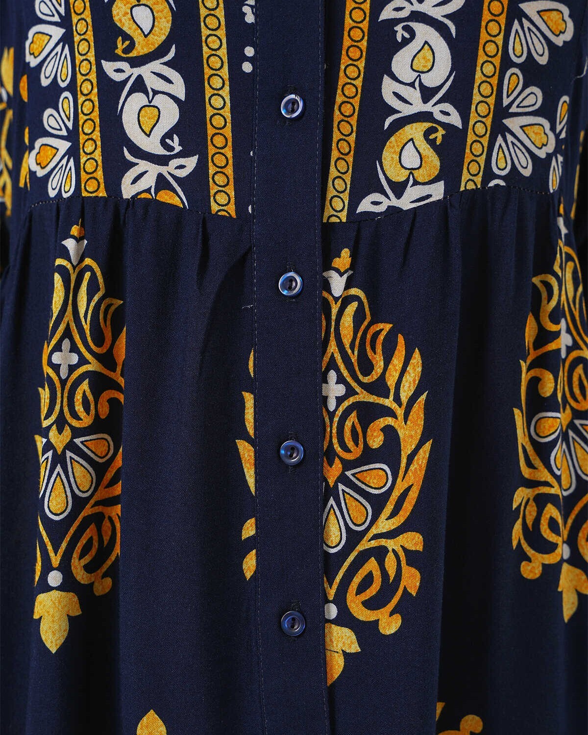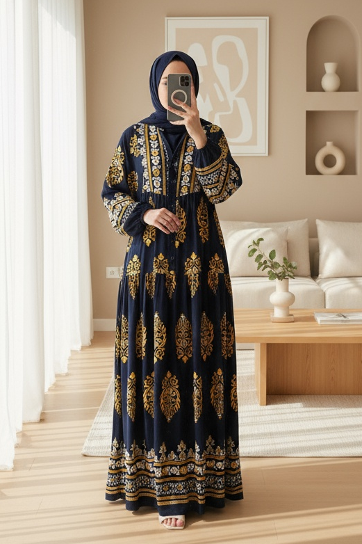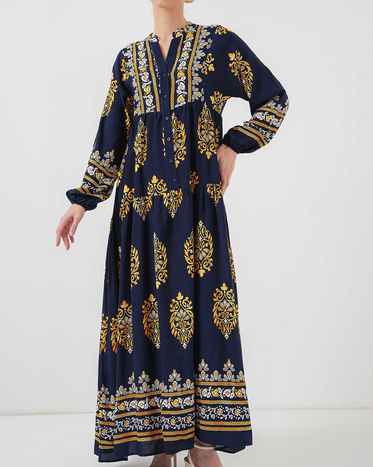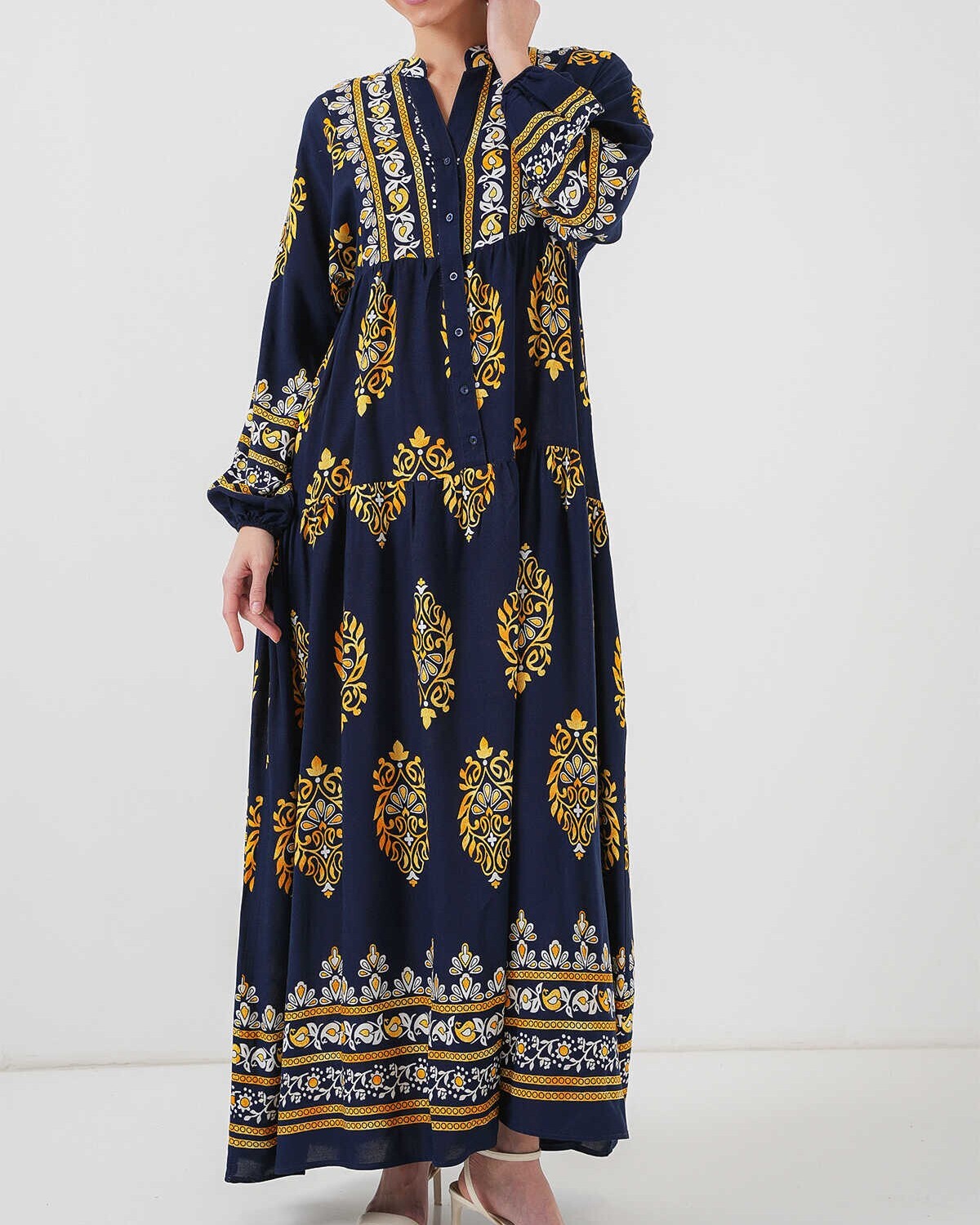 2423 Otantik Desenli Tesettür Elbise - Lacivert 2