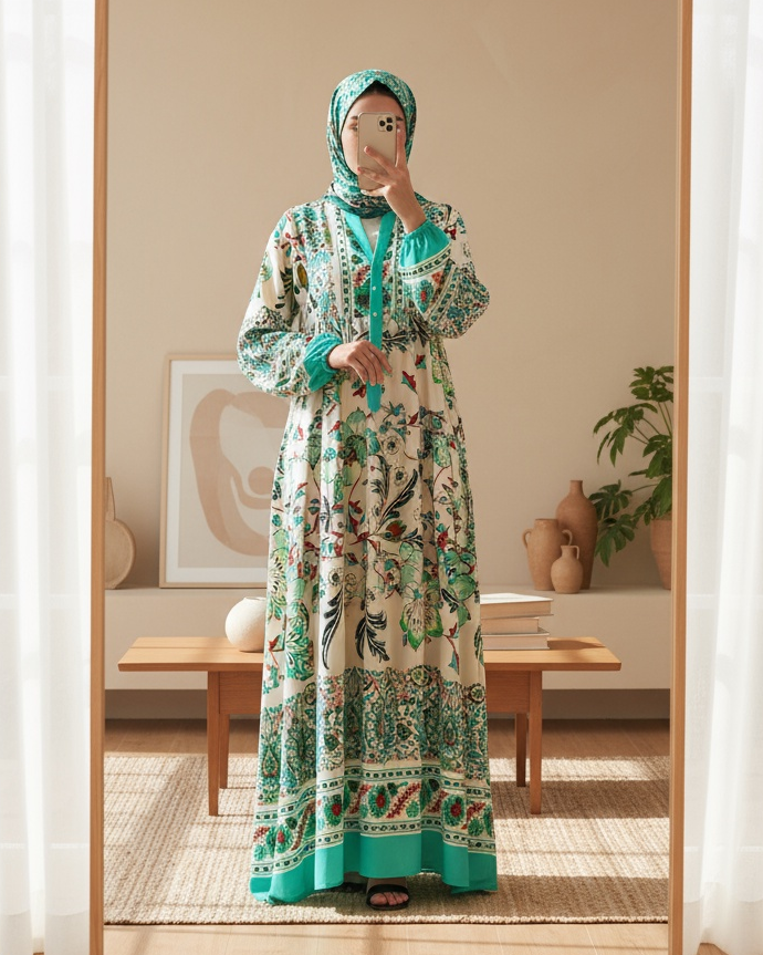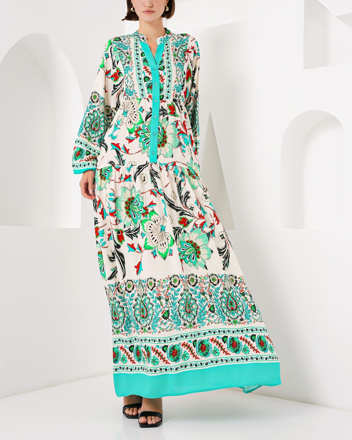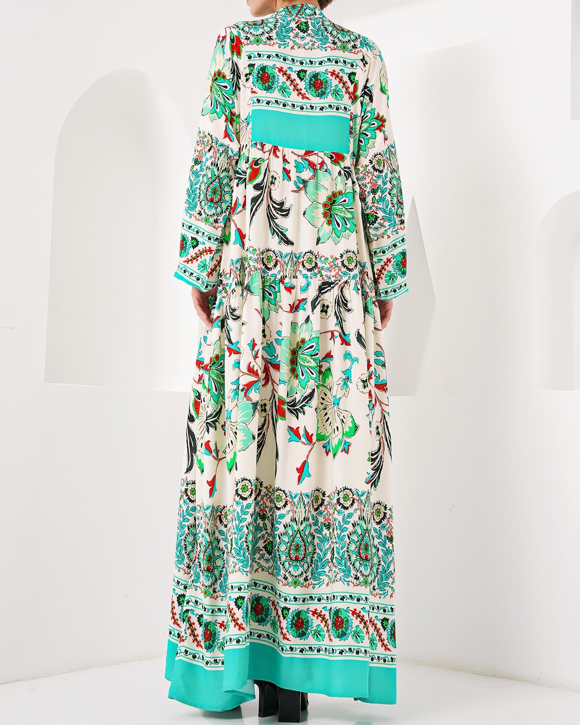 2423 Otantik Desenli Tesettür Elbise - Y.Yeşil