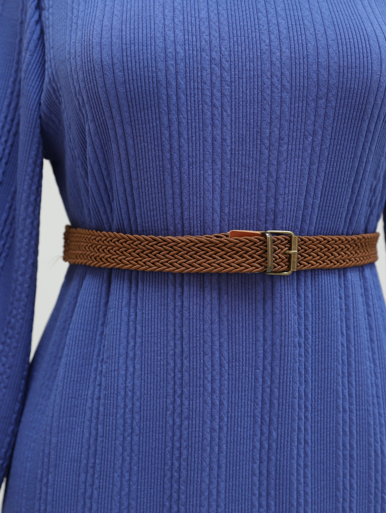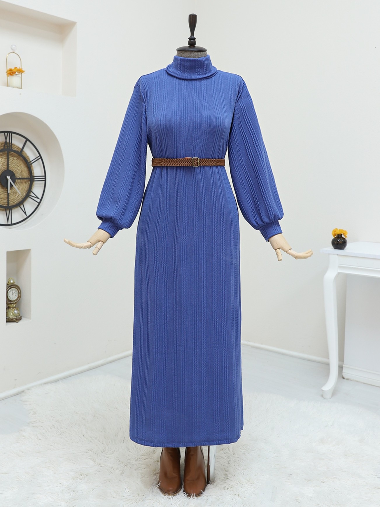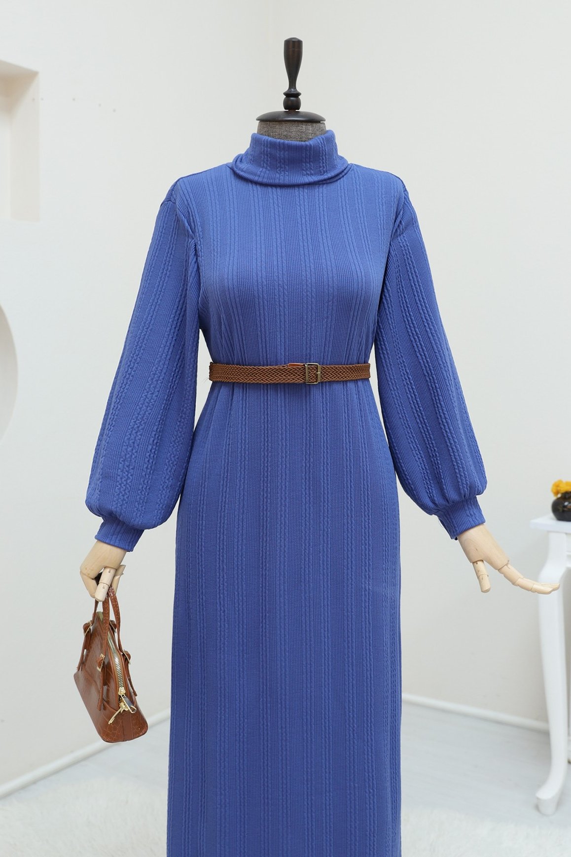 Balıkçı Yaka Kemerli Likralı Elbise -İndigo
