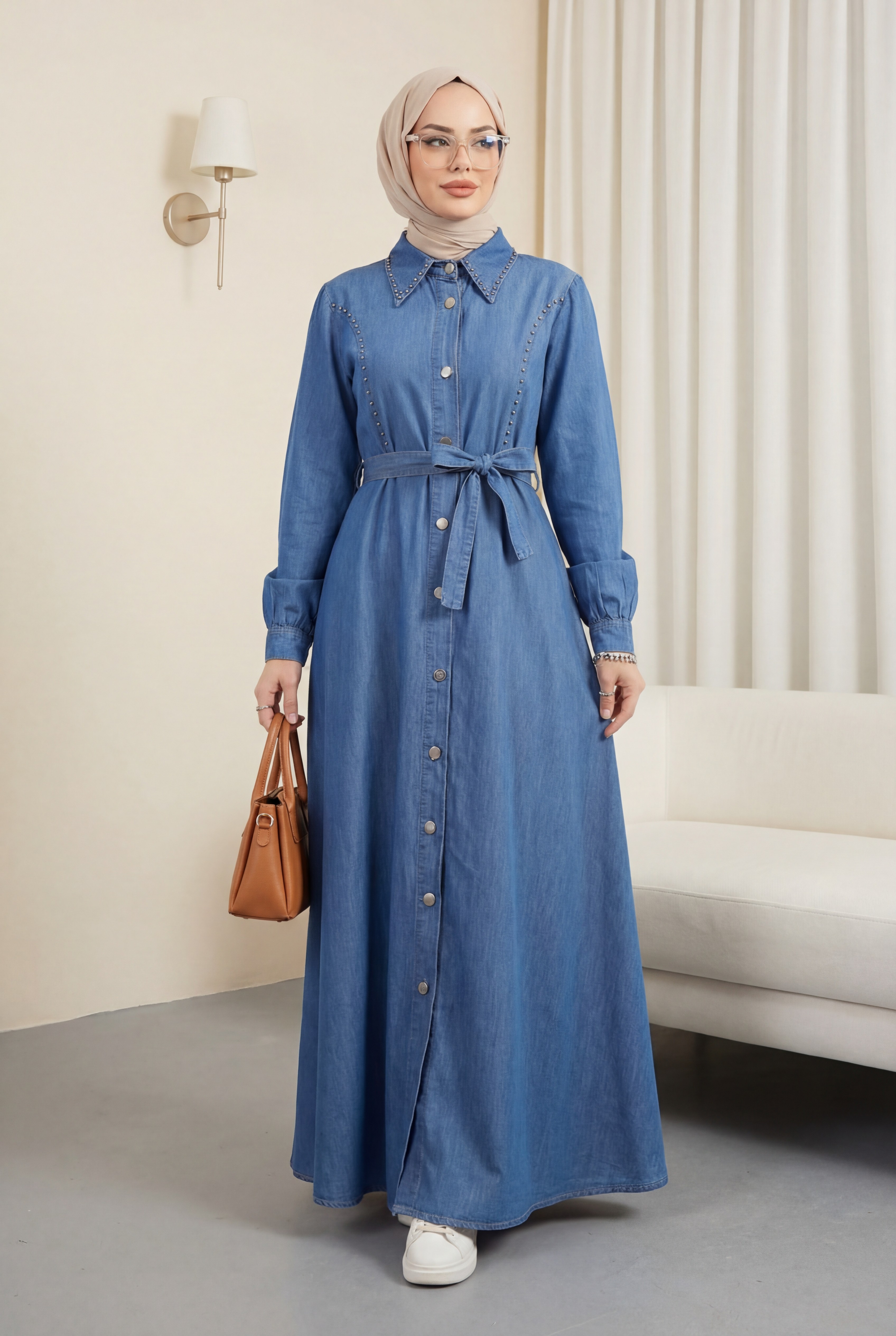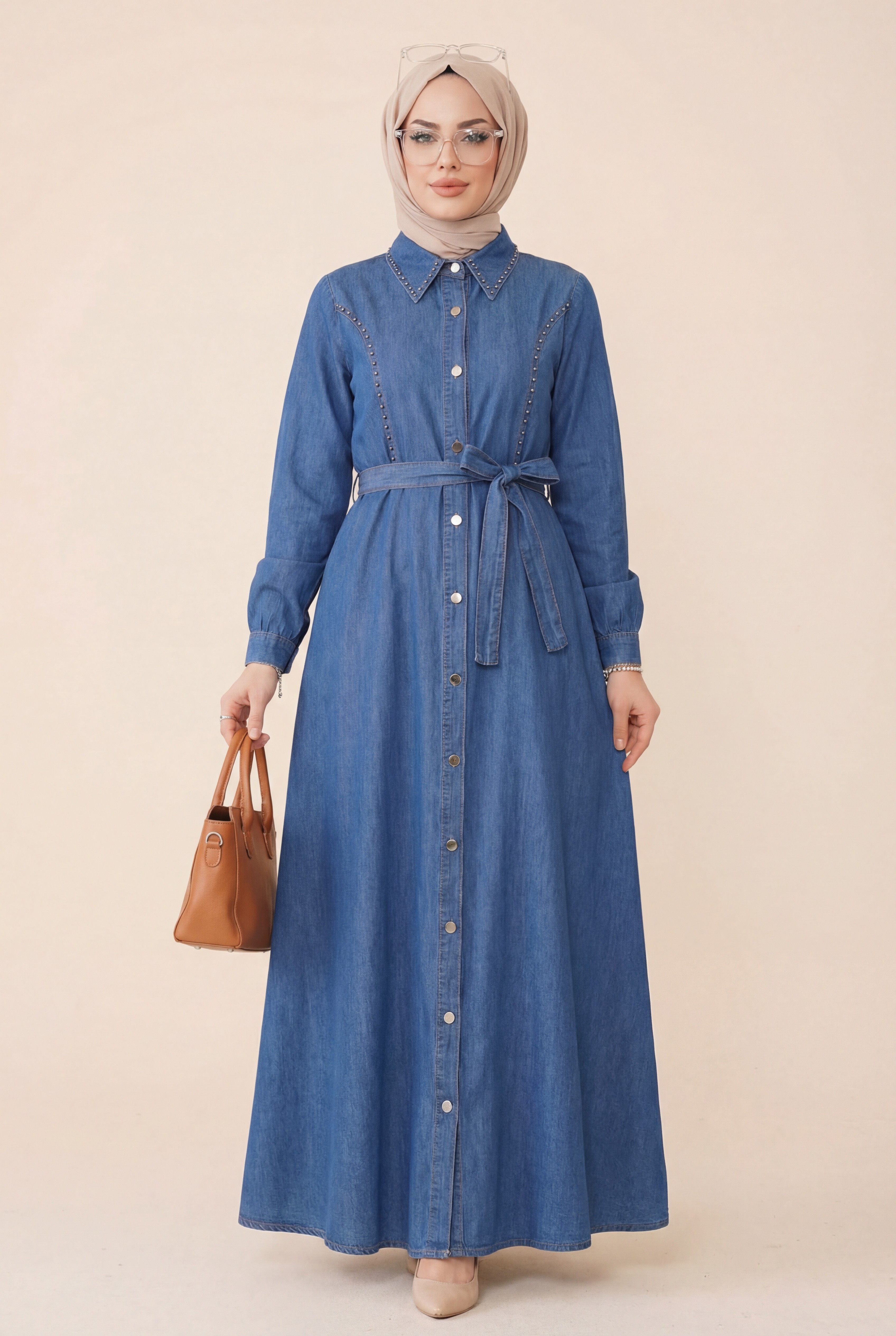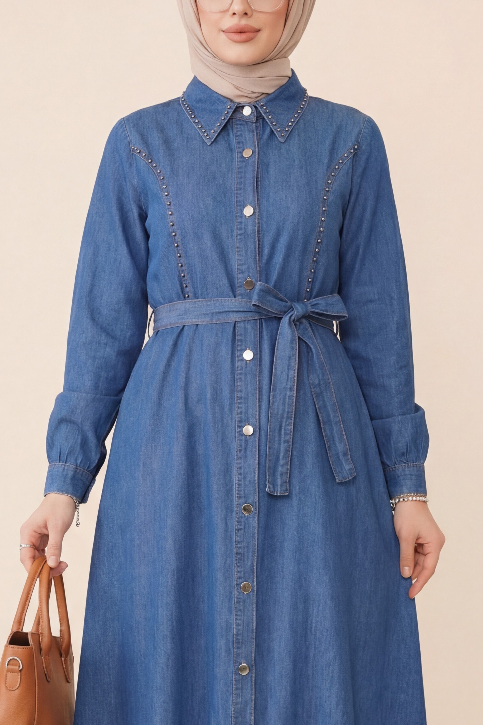 Belden Bağlamalı Önü Düğmeli Boncuklu Kot Elbise, zarif boncuk detayları ve belden bağlama tasarımıyla şıklığı ve rahatlığı bir arada sunar. Ön düğmeli yapısı ve kot kumaşı, modern bir görünüm yaratırken, her bedene uyum sağlayan kesimi ile rahat bir kullanım sağlar.