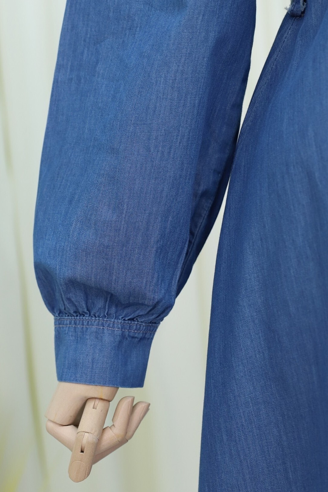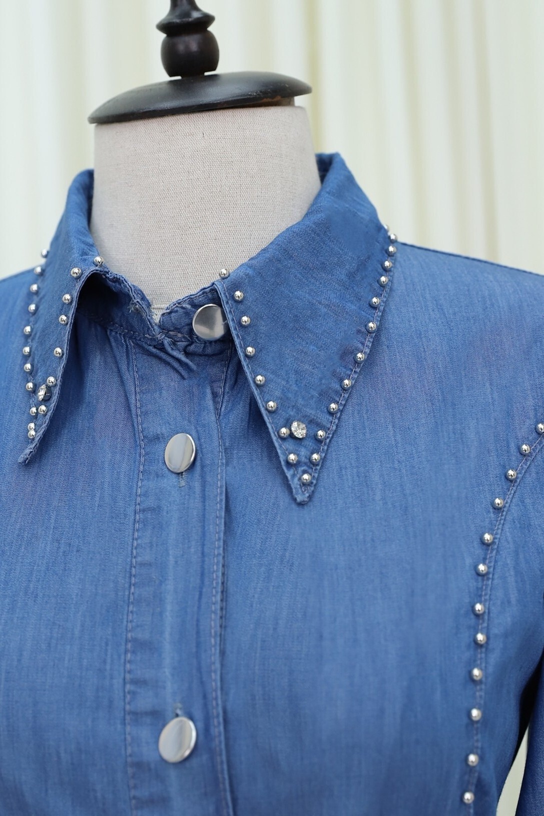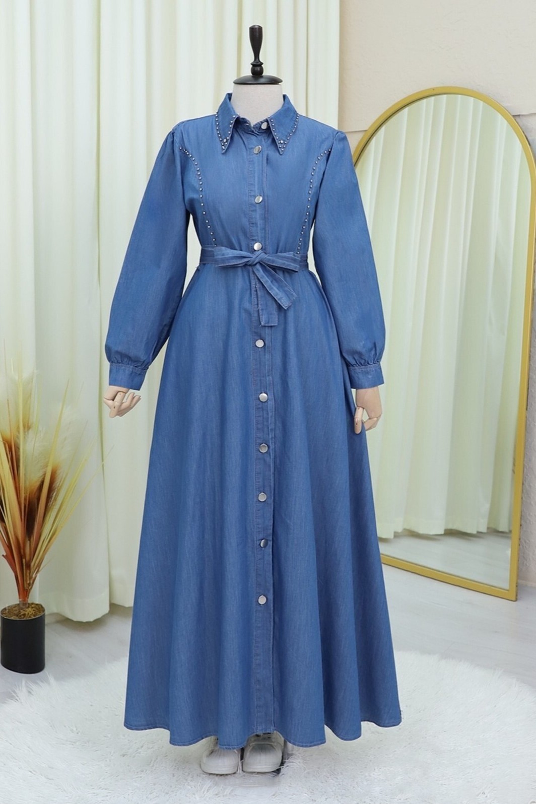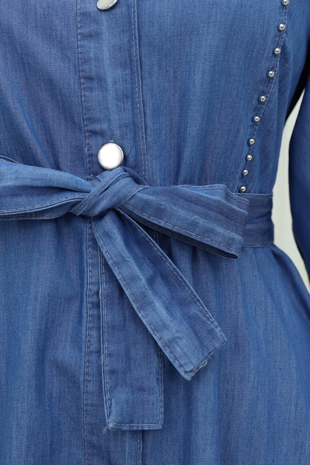 Belden Bağlamalı Önü Düğmeli Boncuklu Kot Elbise, zarif boncuk detayları ve belden bağlama tasarımıyla şıklığı ve rahatlığı bir arada sunar. Ön düğmeli yapısı ve kot kumaşı, modern bir görünüm yaratırken, her bedene uyum sağlayan kesimi ile rahat bir kullanım sağlar.