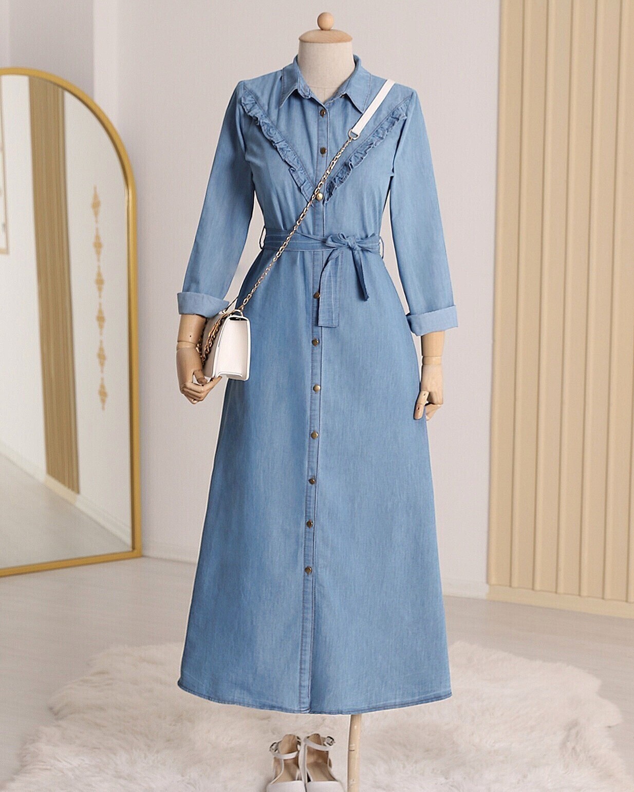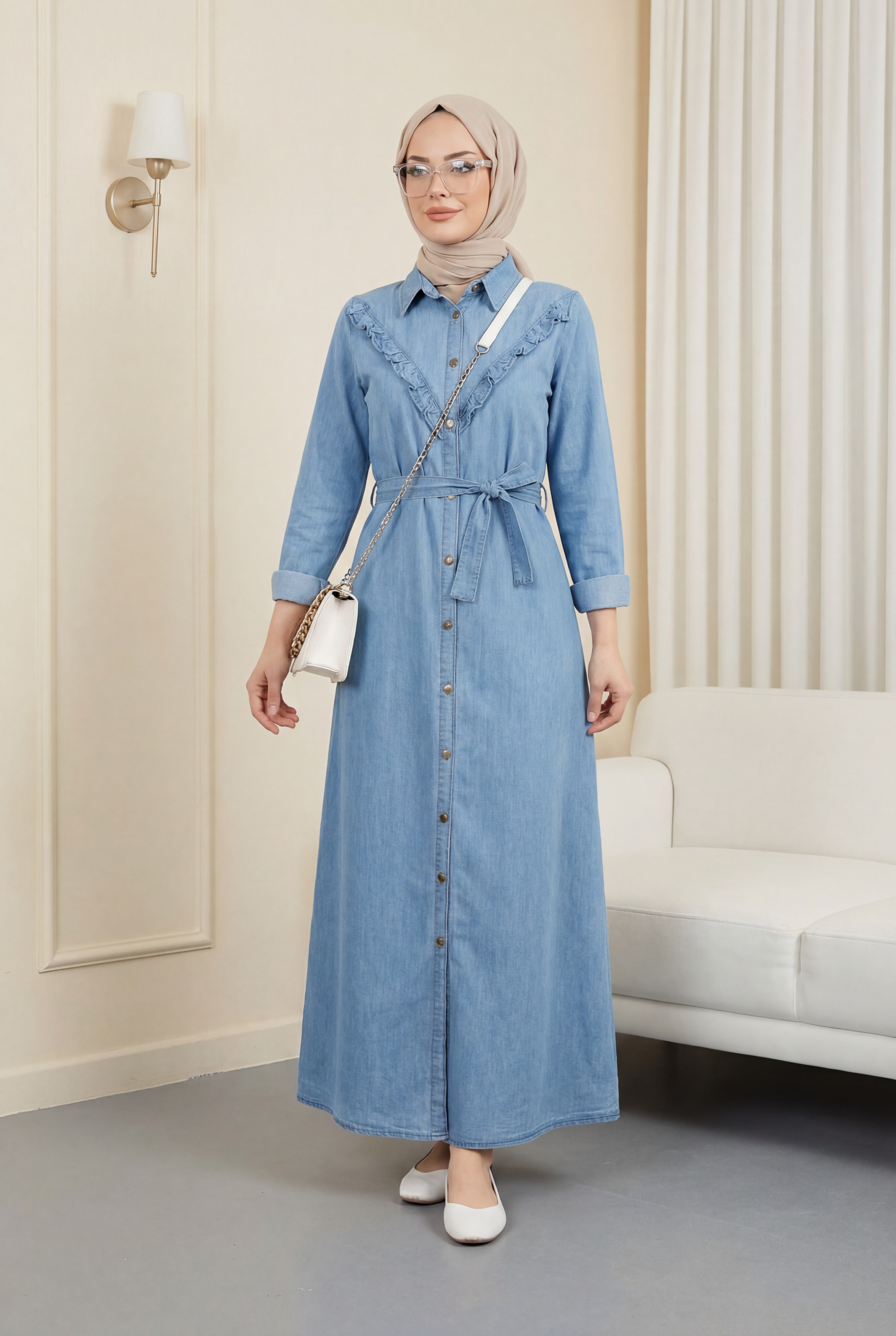 Önden düğmeli, kemerli kot elbise modelimiz yeni sezonun en trend modelleri arasında yerini almıştır.