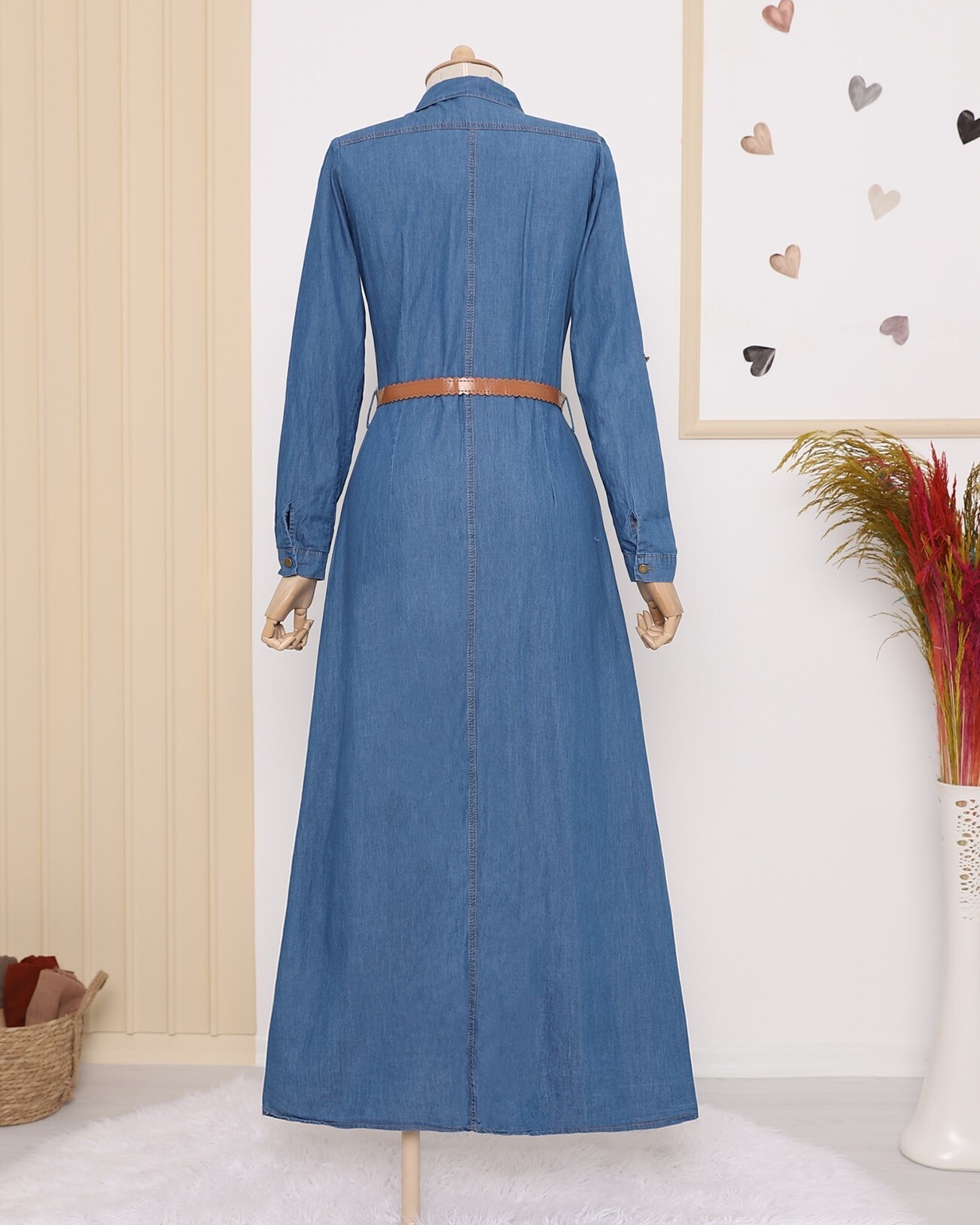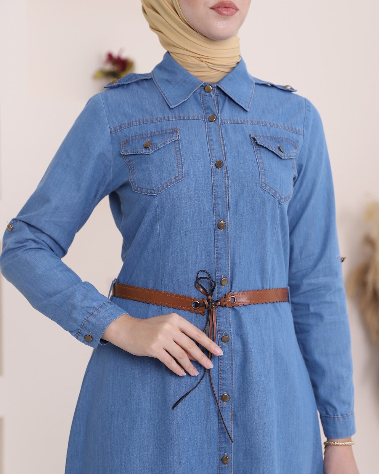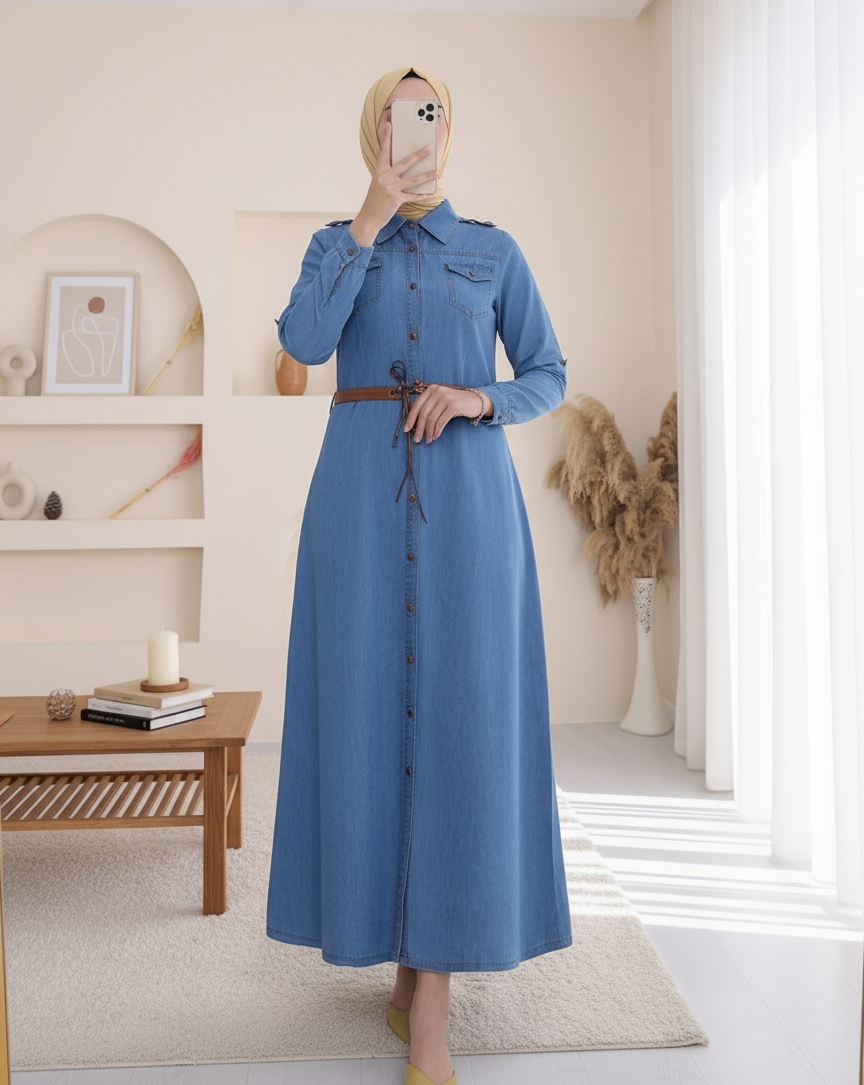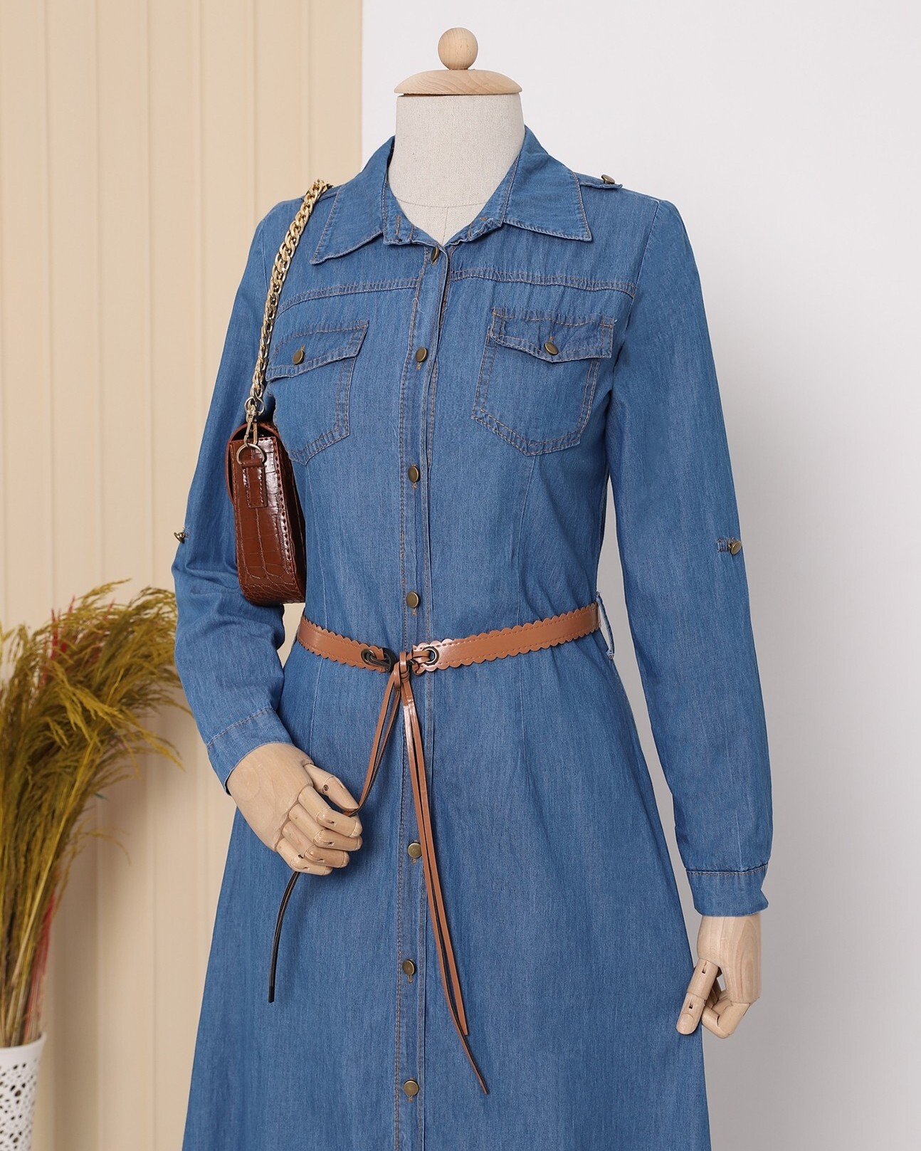 Boydan düğmeli, göğsü cep detaylı, kemerli, kolları katlamalı kot elbise modelimiz yeni sezonun en çok tercih edilen modelleri arasında yer almaktadır.