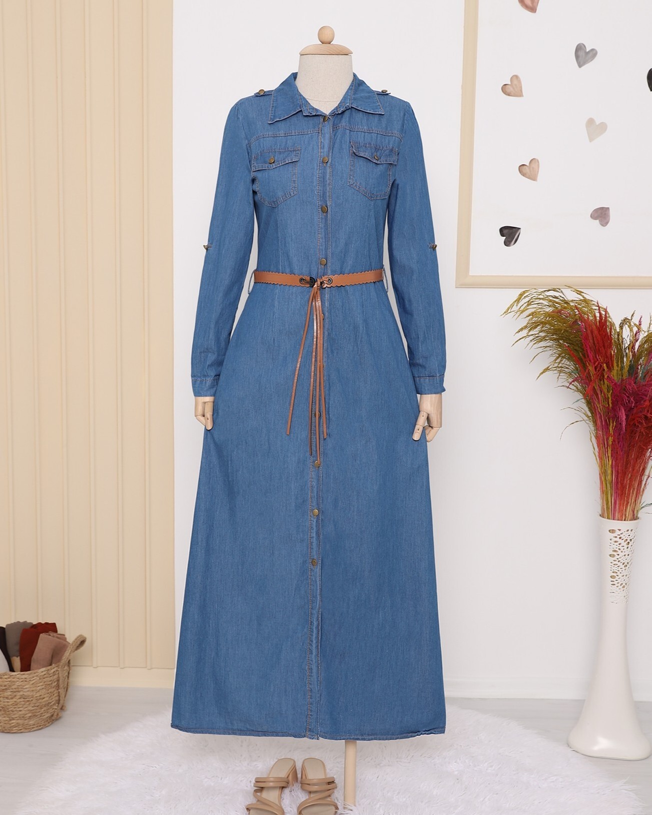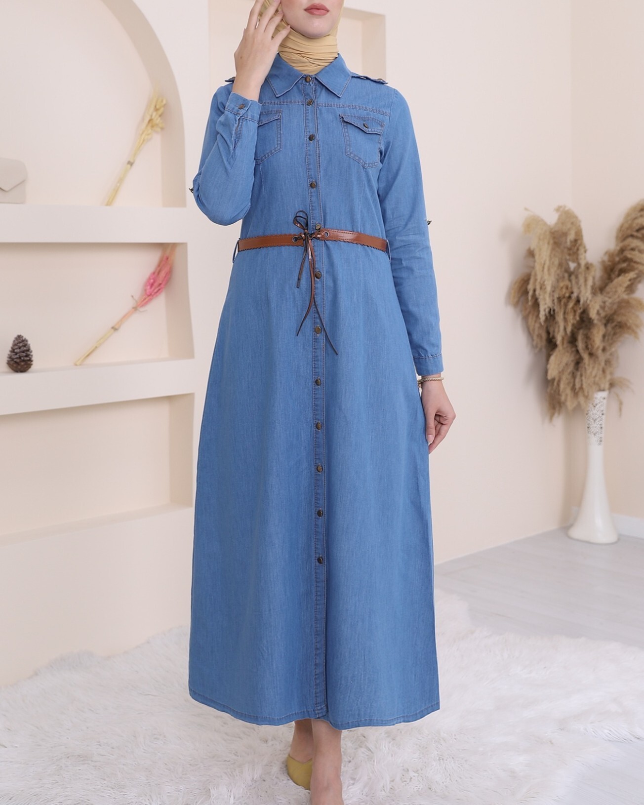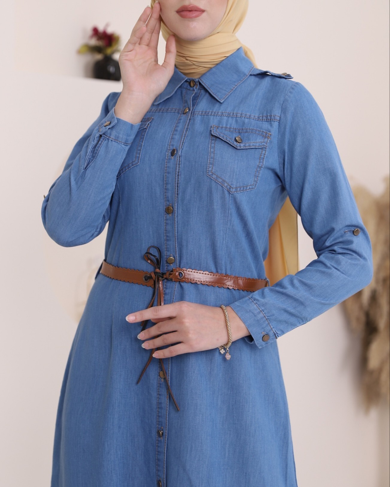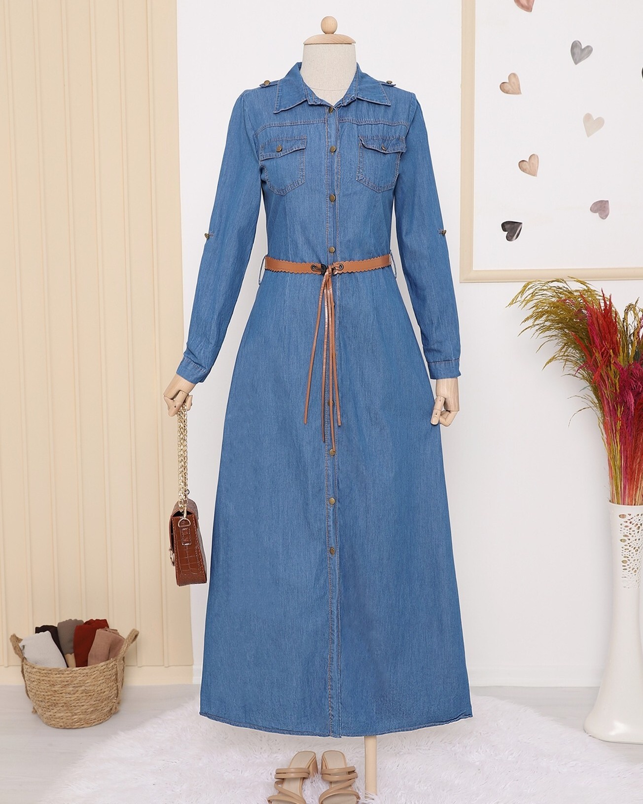 Boydan düğmeli, göğsü cep detaylı, kemerli, kolları katlamalı kot elbise modelimiz yeni sezonun en çok tercih edilen modelleri arasında yer almaktadır.