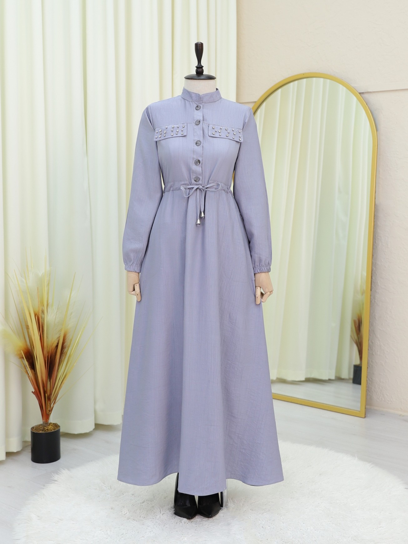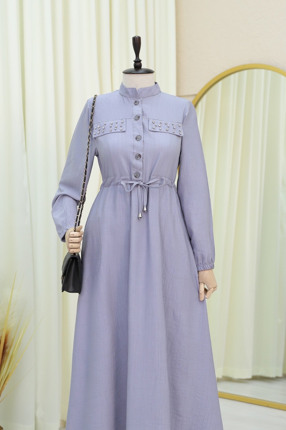 Şıklığınızı bir adım öteye taşır. Beli bağlamalı tasarımı vücuda otururken, kolundaki lastik detayı rahatlık sunar. Ceplerdeki taş detayları ise elbiseye ışıltı katarken, günlük şıklığınızdan özel davetlere kadar her ortamda rahatça kullanılabilir. Hem zarif hem rahat bir stil arayanlar için mükemmel bir tercih!