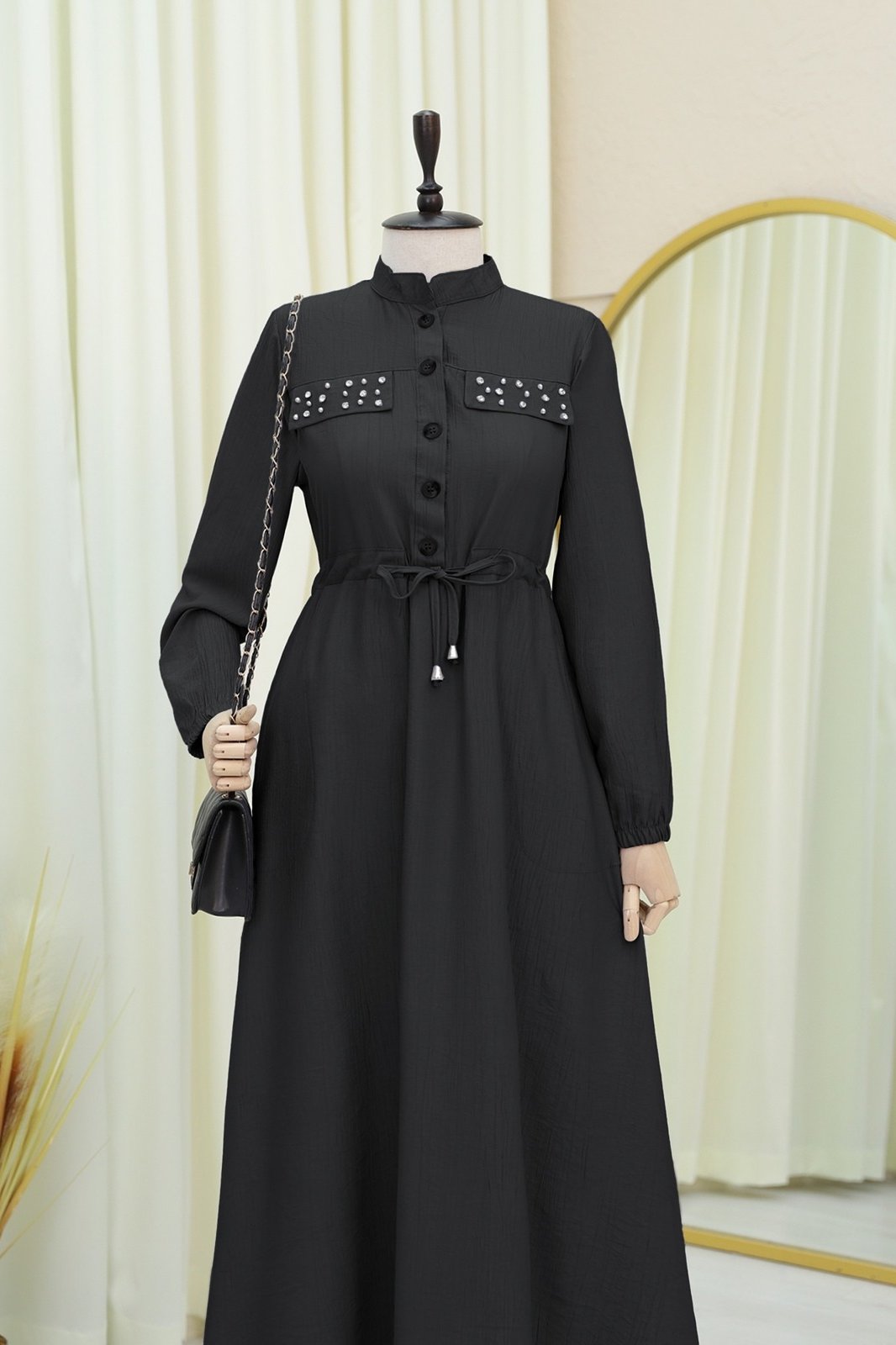 Cepleri Taşlı Beli Bağlamalı Kolu Lastikli Elbise -Siyah
