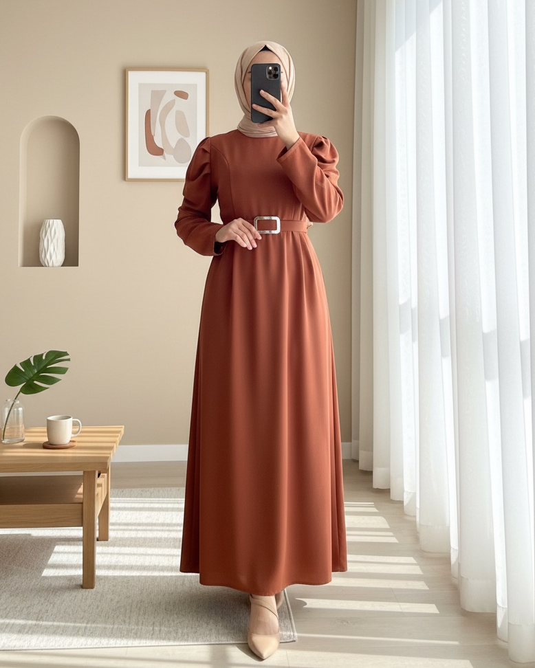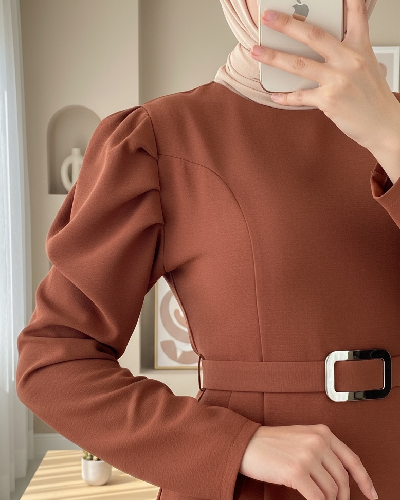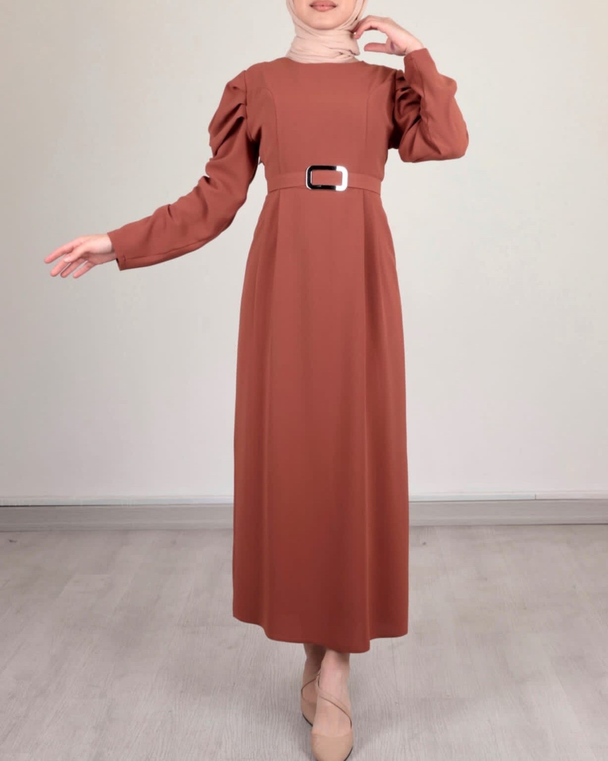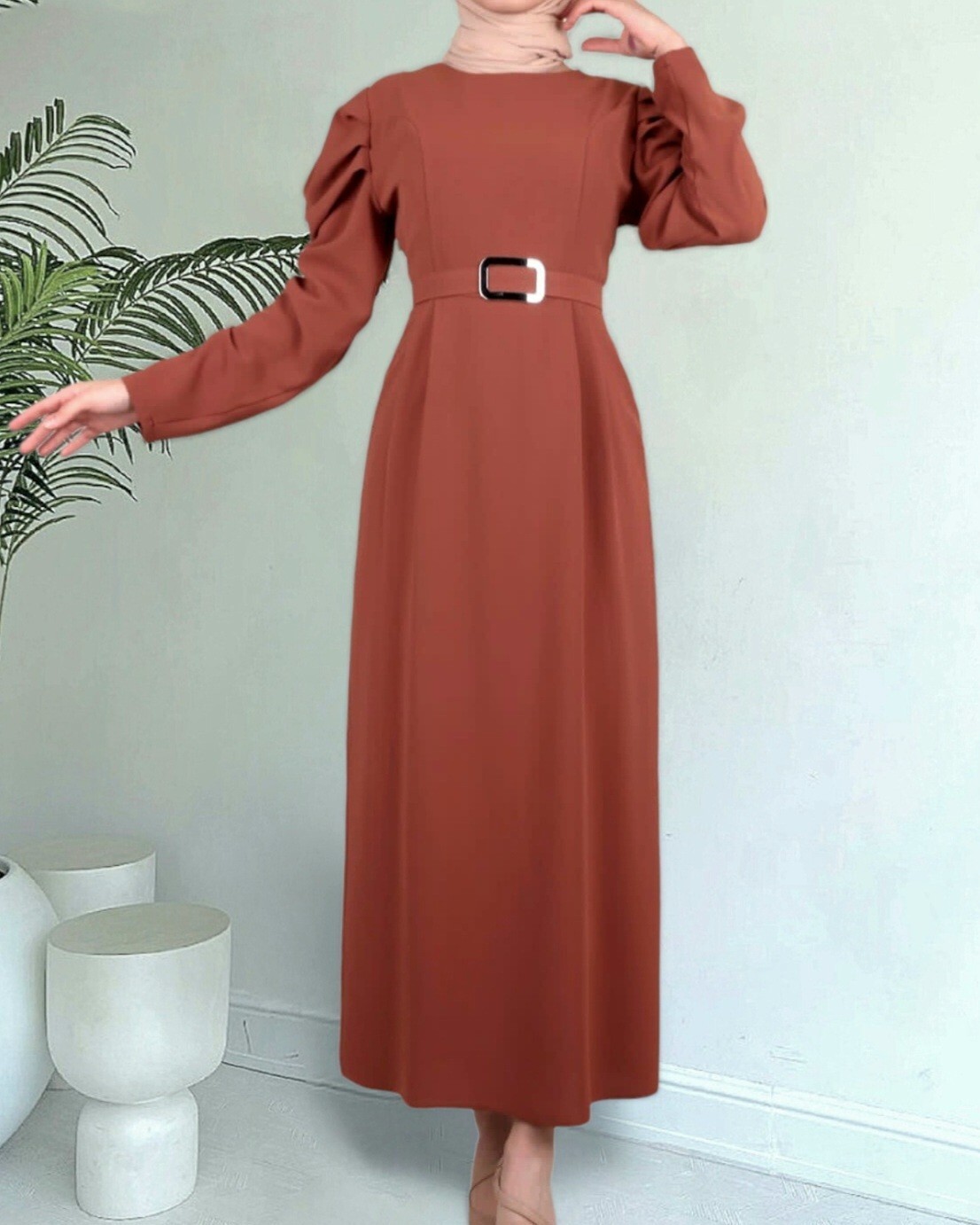 Karpuz Kol Tokalı Kemerli Elbise -Taba