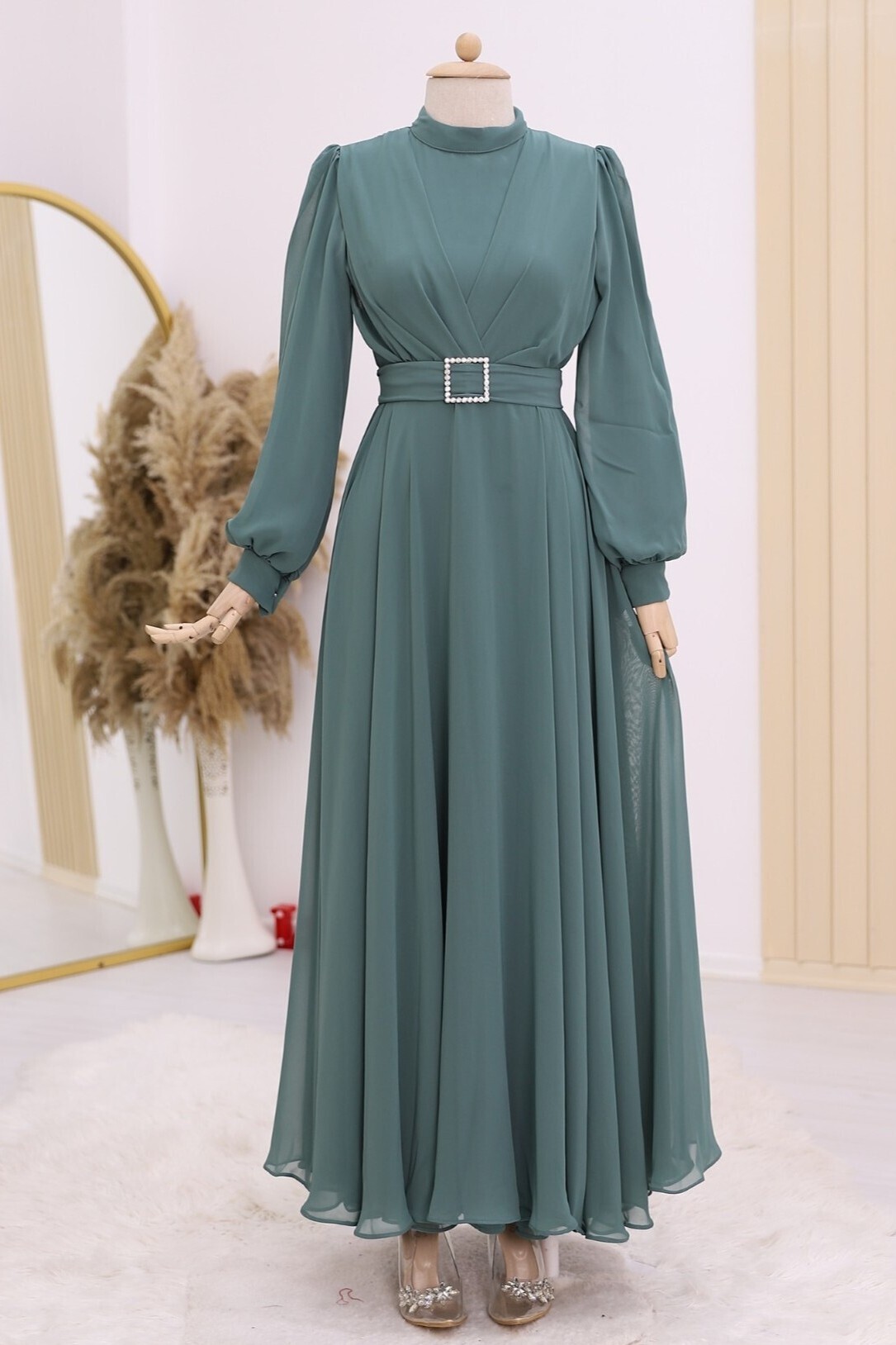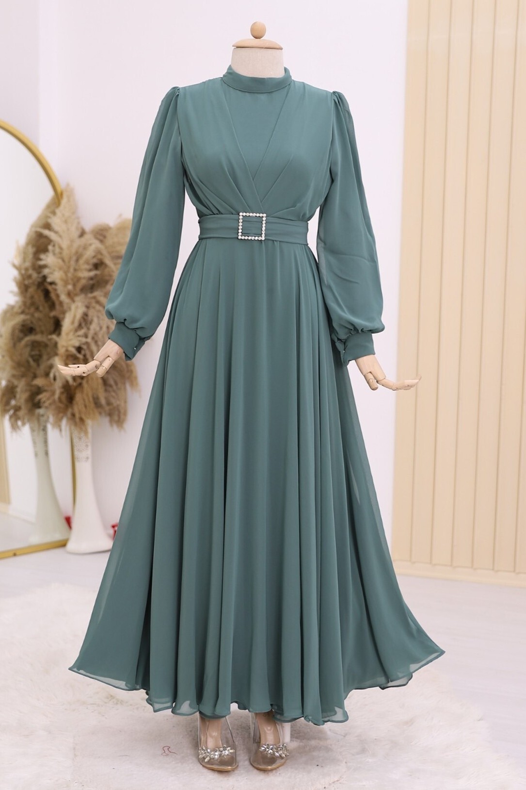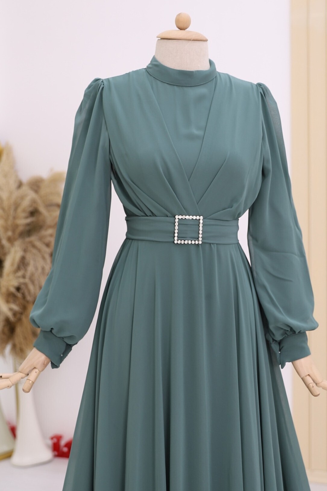 Hakim yaka, kemerli, önü drape detaylı, arkadan fermuarlı, astarlı elbise modelimiz yeni sezonun en çok sevilen modelleri arasında yer almaktadır.