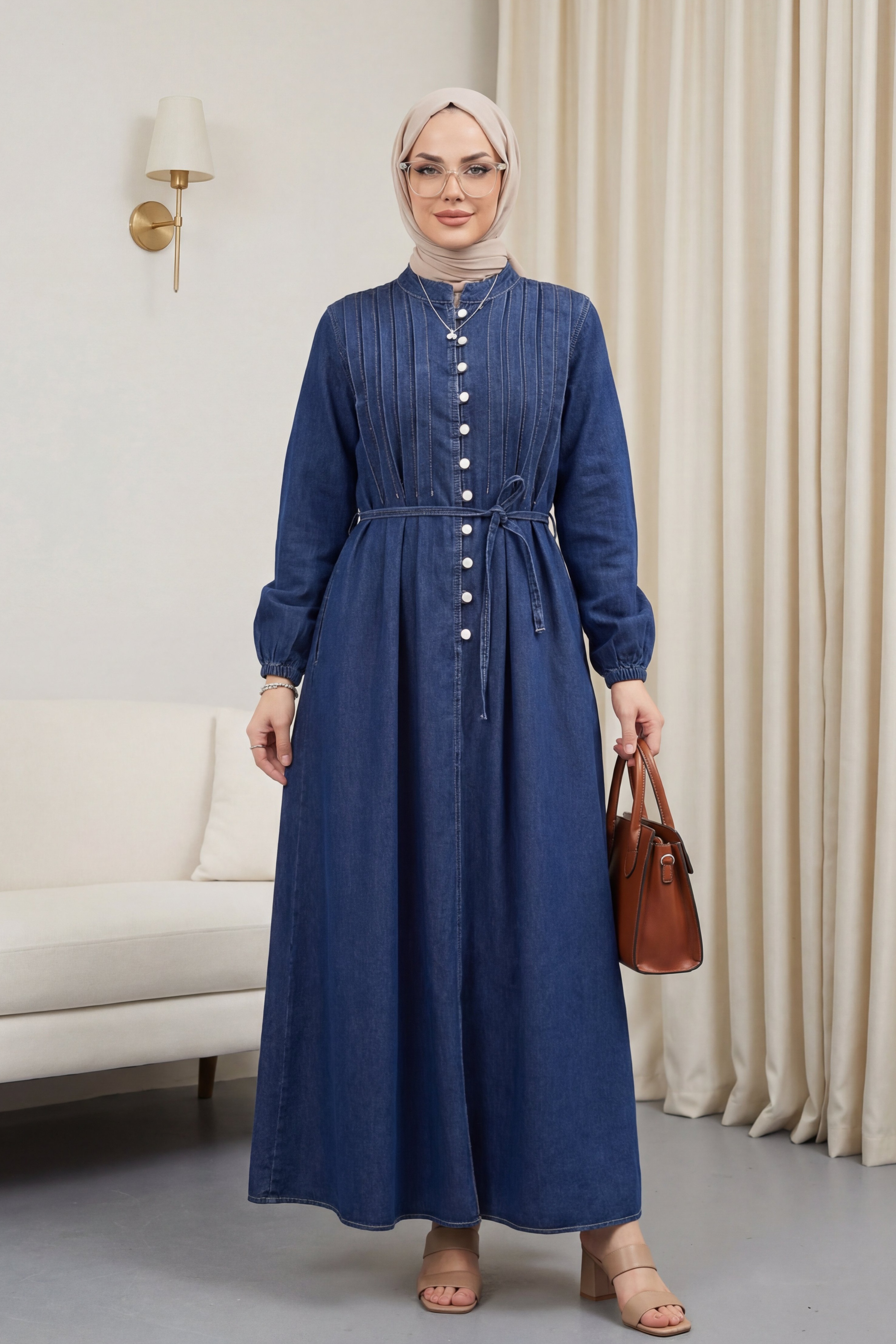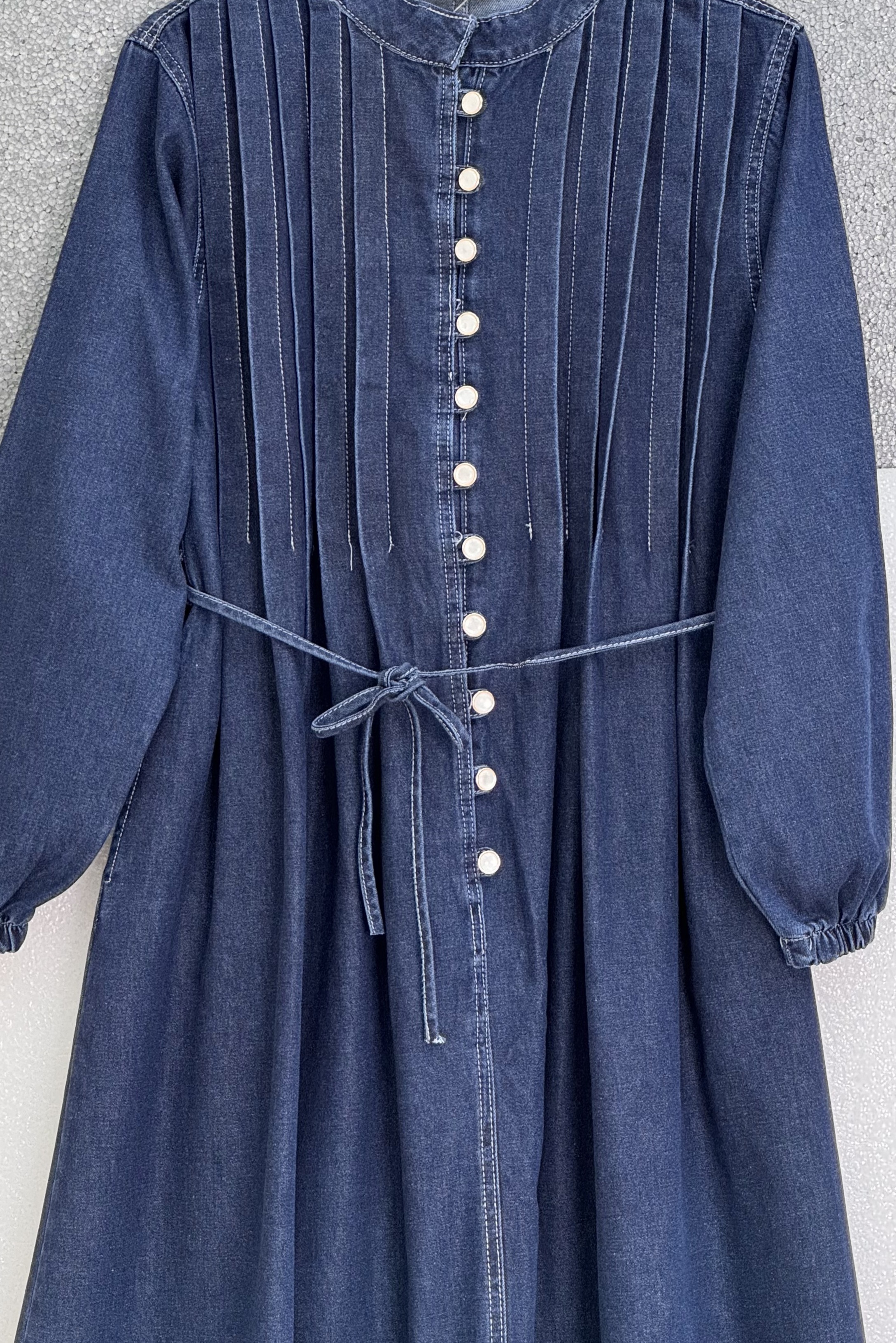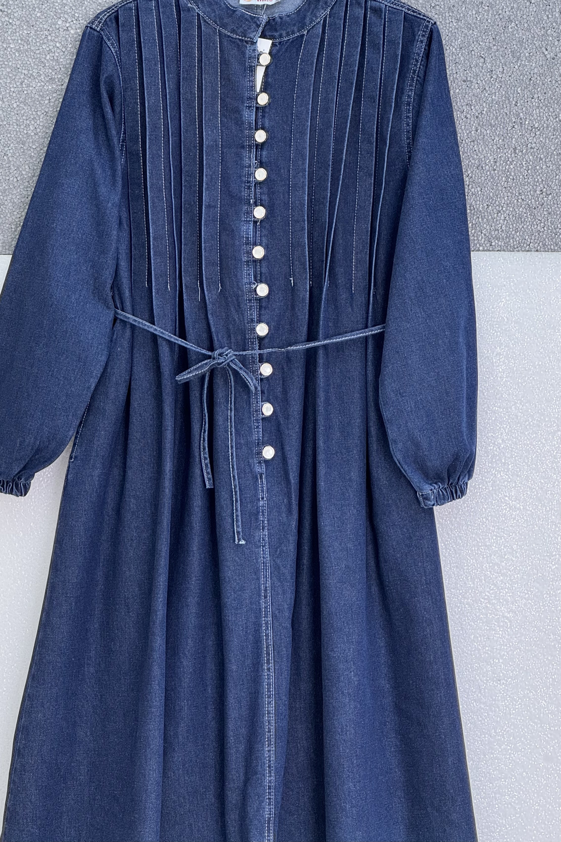 “Bağcıklı kot elbise”, “yarım düğmeli denim elbise”, “günlük kot elbise”, “kolu lastikli kadın elbise” gibi adlandırılabilir.