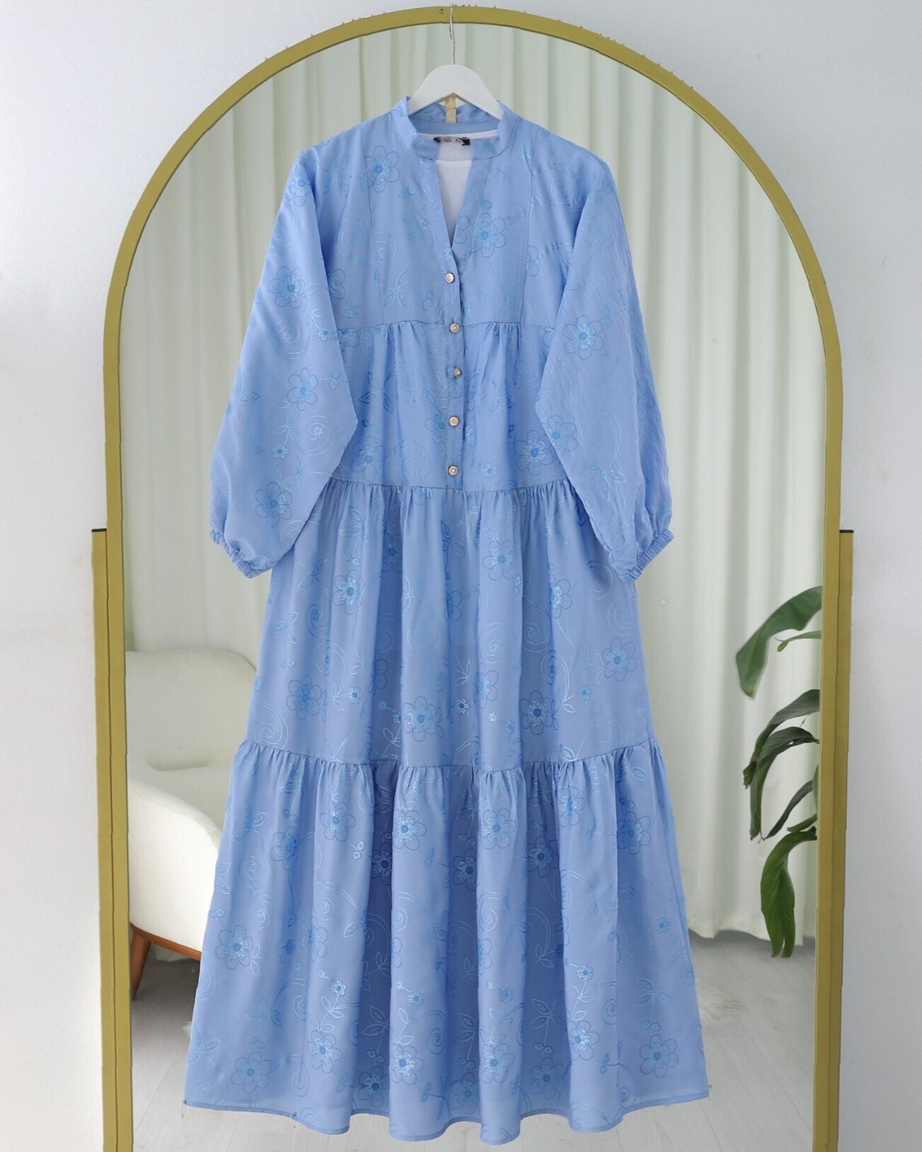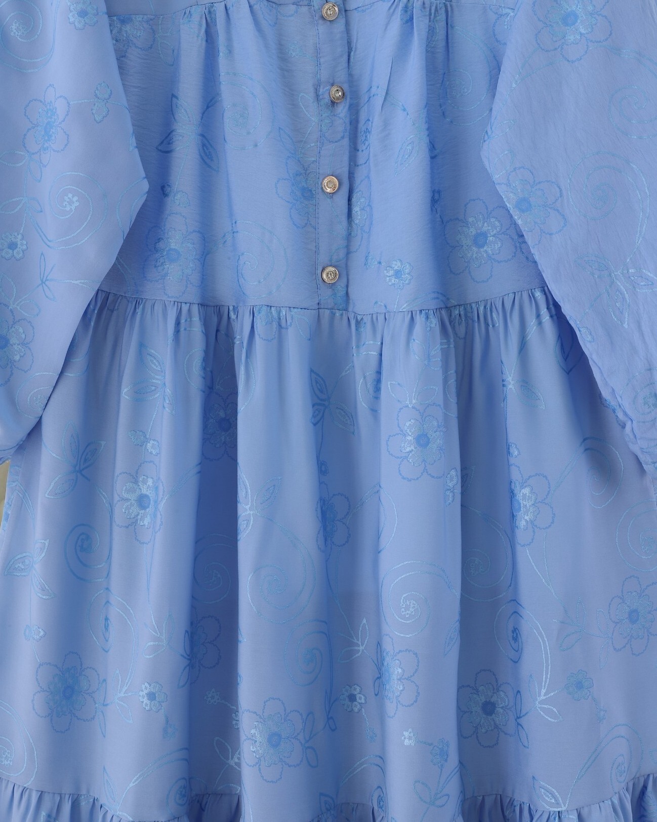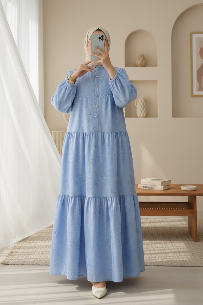 Kolu Lastikli Yarım Düğmeli Jakar Baskılı Parçalı Elbise -Açık Mavi