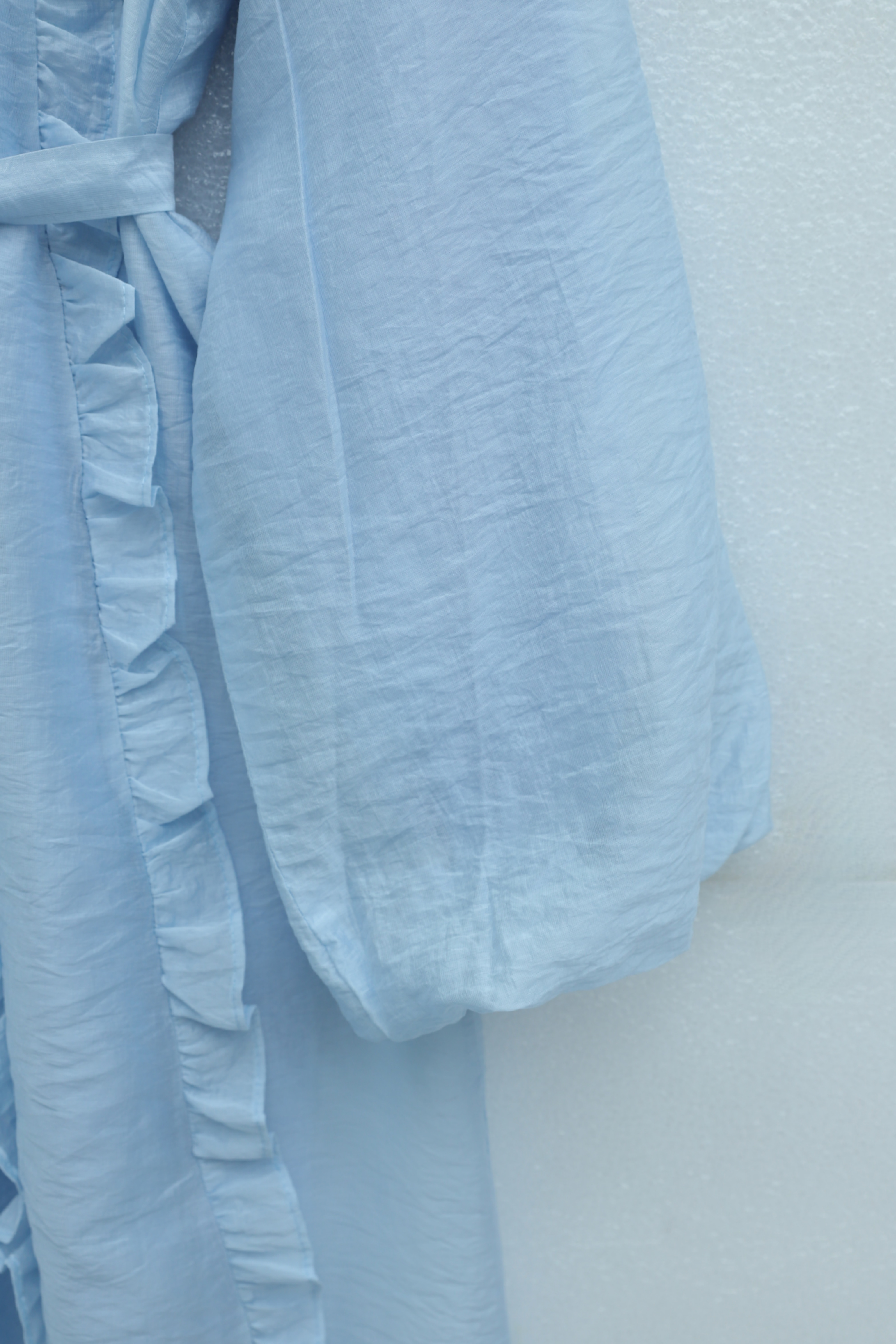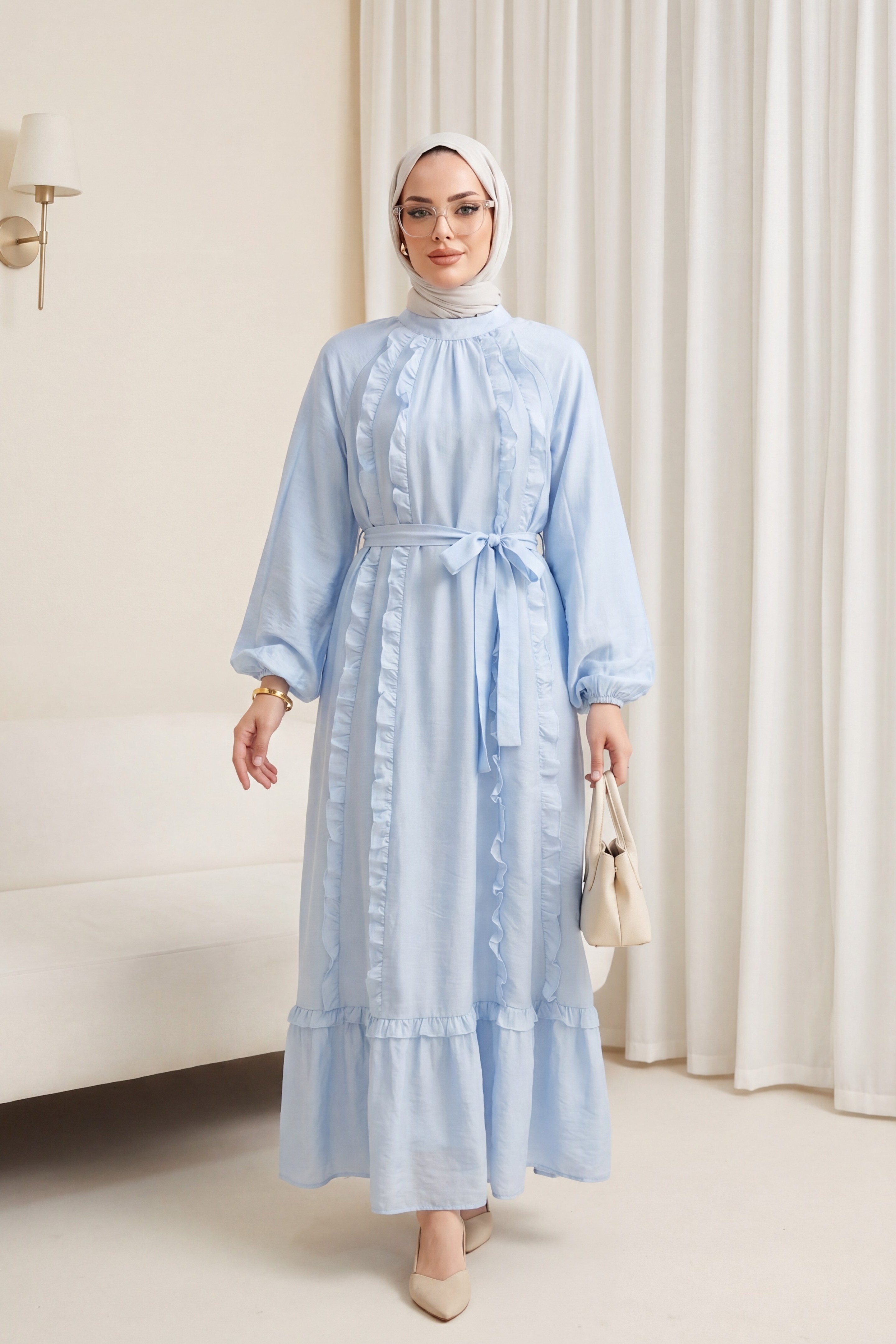 Önü Fırfırlı Beli Kemerli Kolu Lastikli Astarlı Cupra Elbise -Bebe Mavi