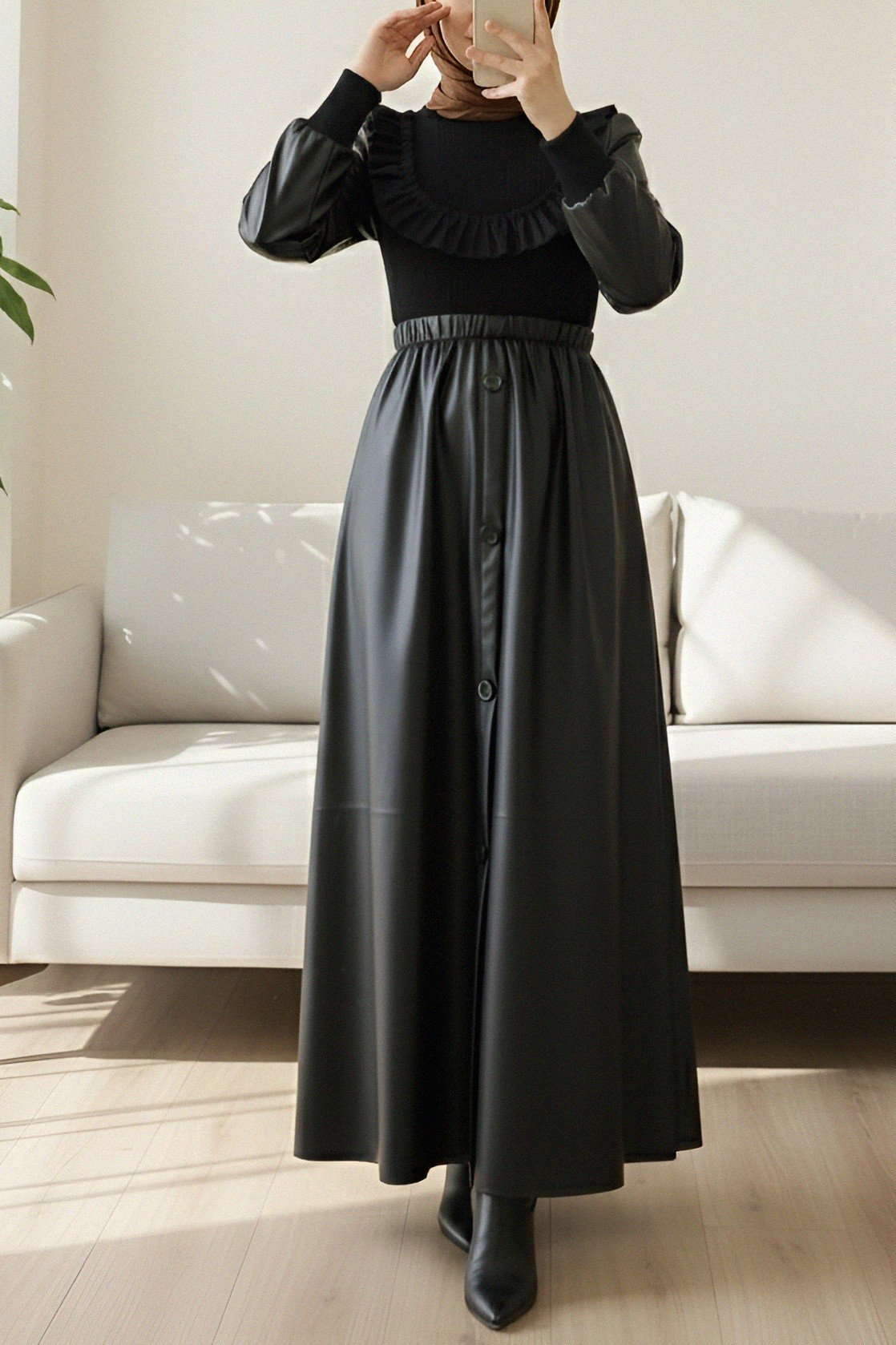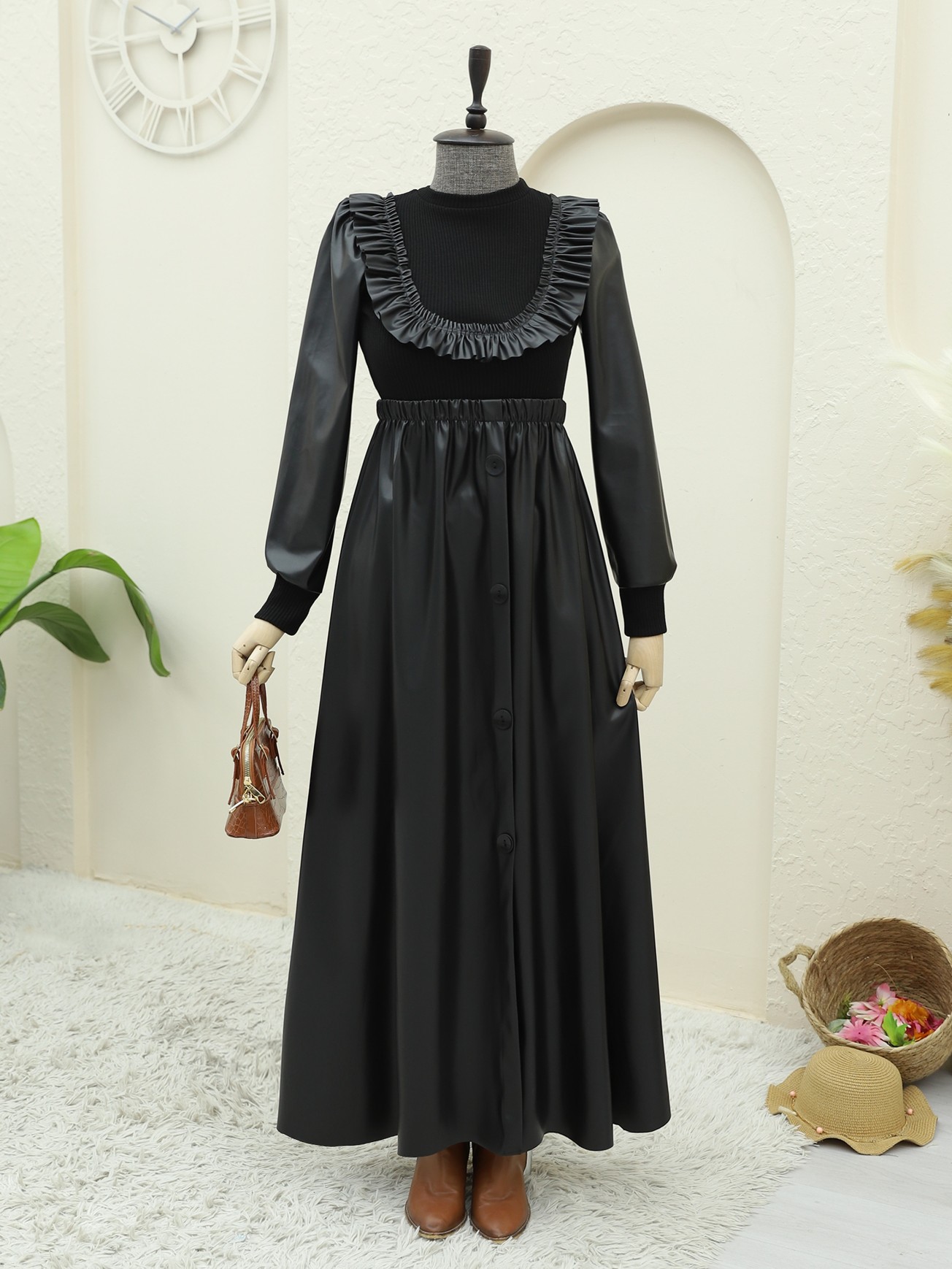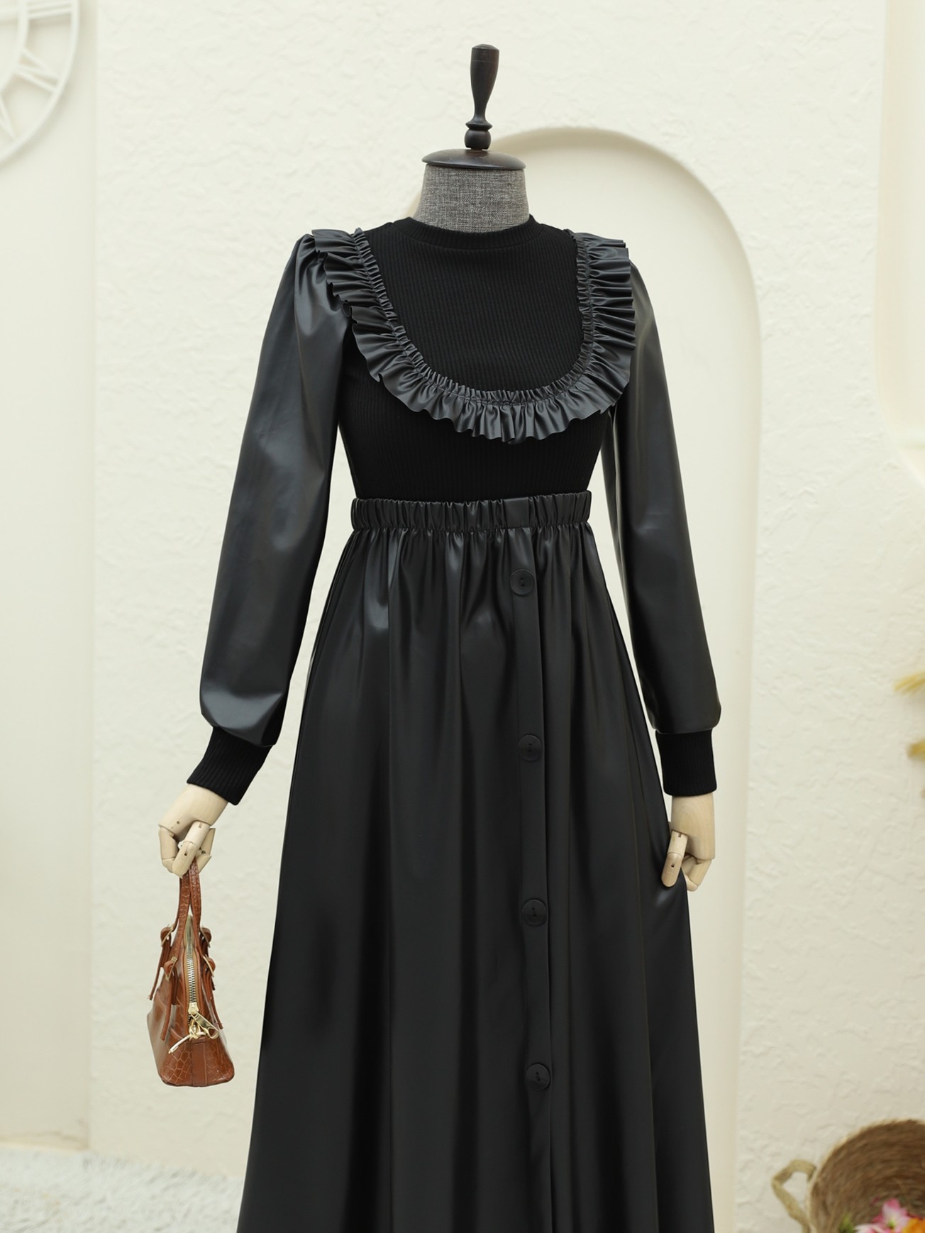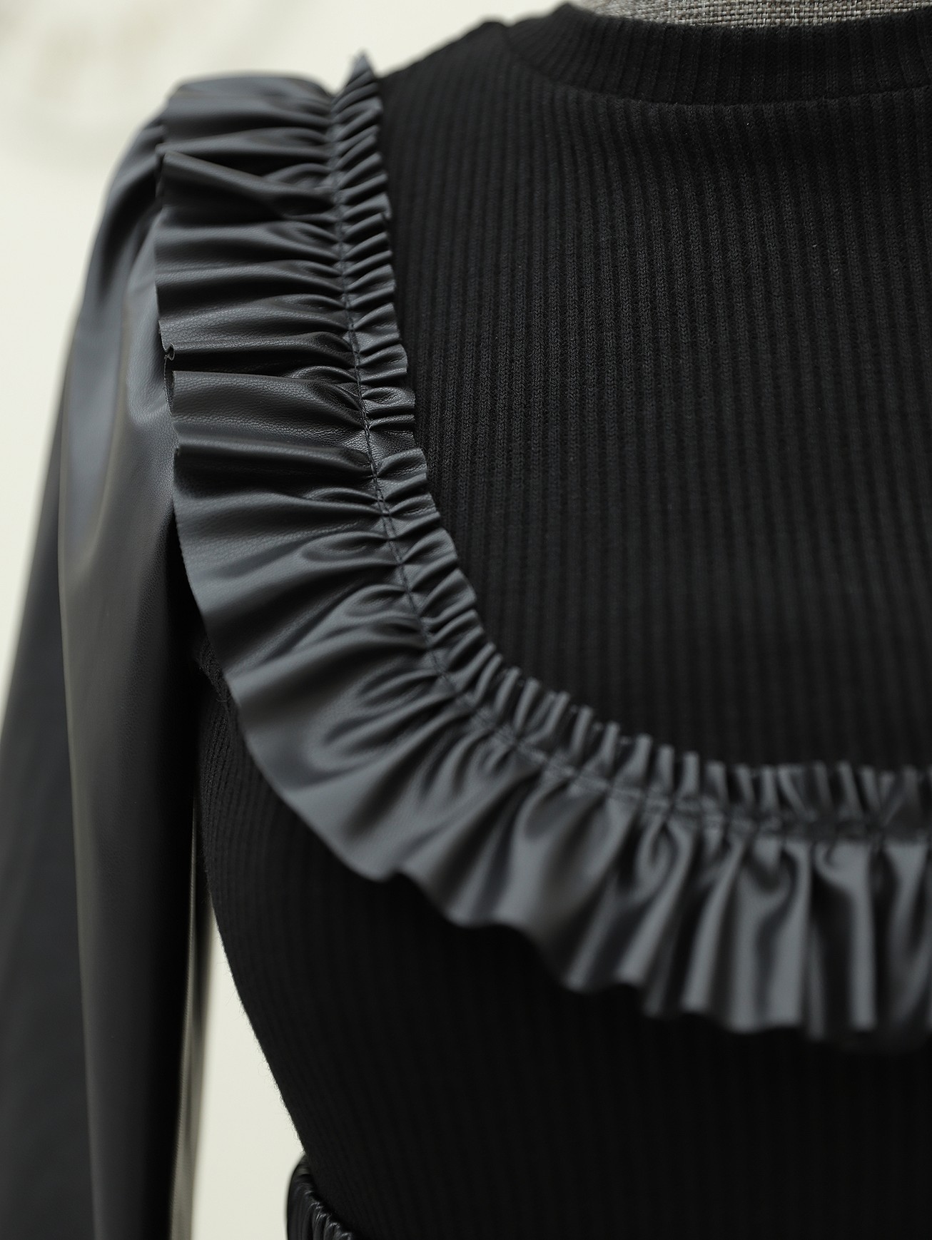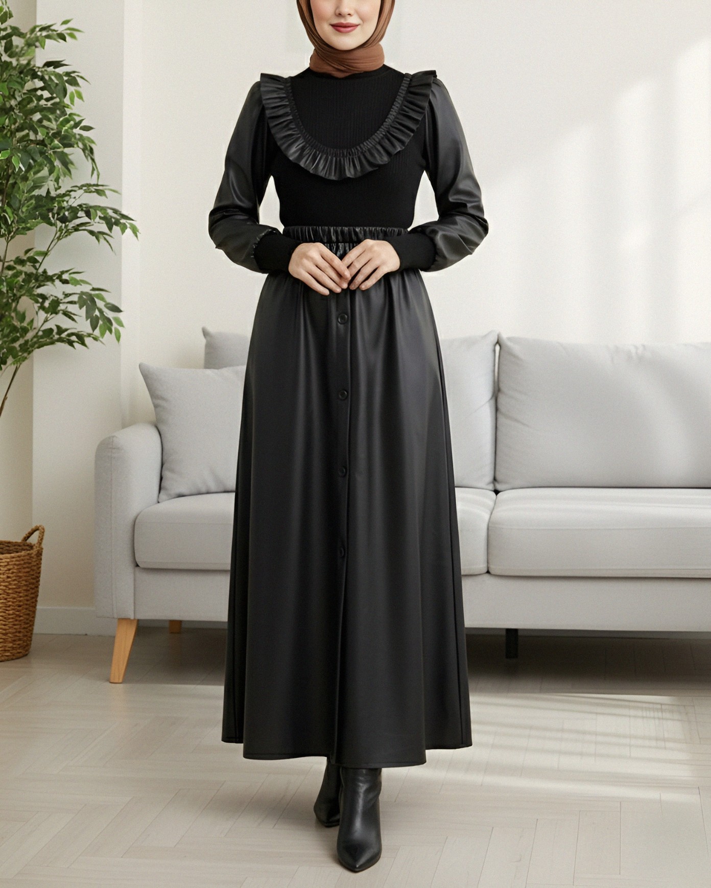 Önü fırfırlı, triko detaylı, deri elbise, zarif ve şık bir görünüm sunar. Fırfır detayları ve triko üst kısmı, elbiseye feminen bir dokunuş katarak modern bir stil oluşturur. Deri alt kısmı ise sofistike bir şıklık sağlar. Hem özel davetlerde hem de günlük şıklığınızda rahatlıkla kullanabileceğiniz bu elbise, zarafeti ve rahatlığı bir araya getiriyor. Şık, rahat ve trendy bir stil arayanlar için mükemmel bir seçenek!