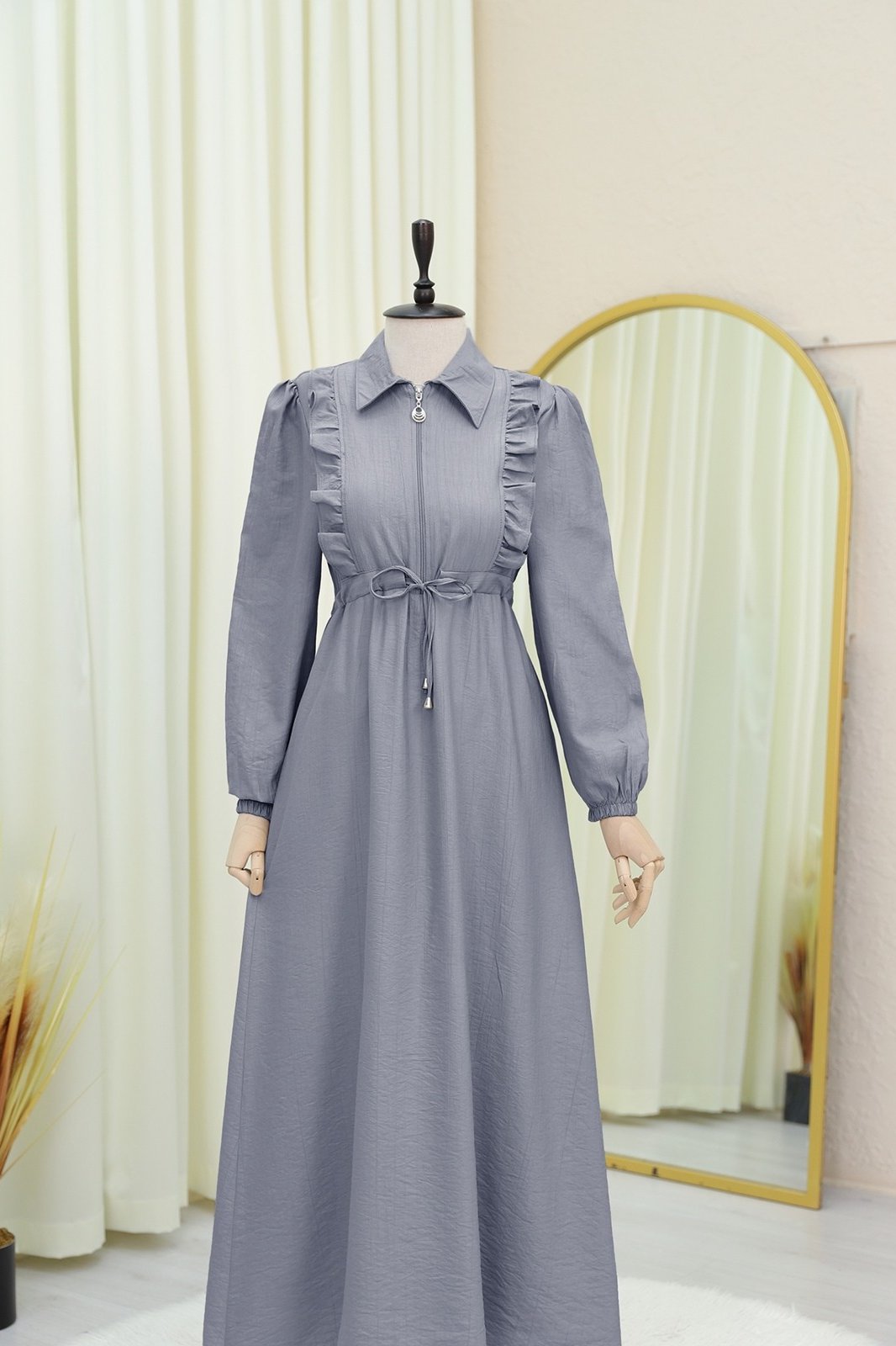 Önü Fırfırlı Yarım Düğmeli Tünel Bağcıklı Elbise -Gri