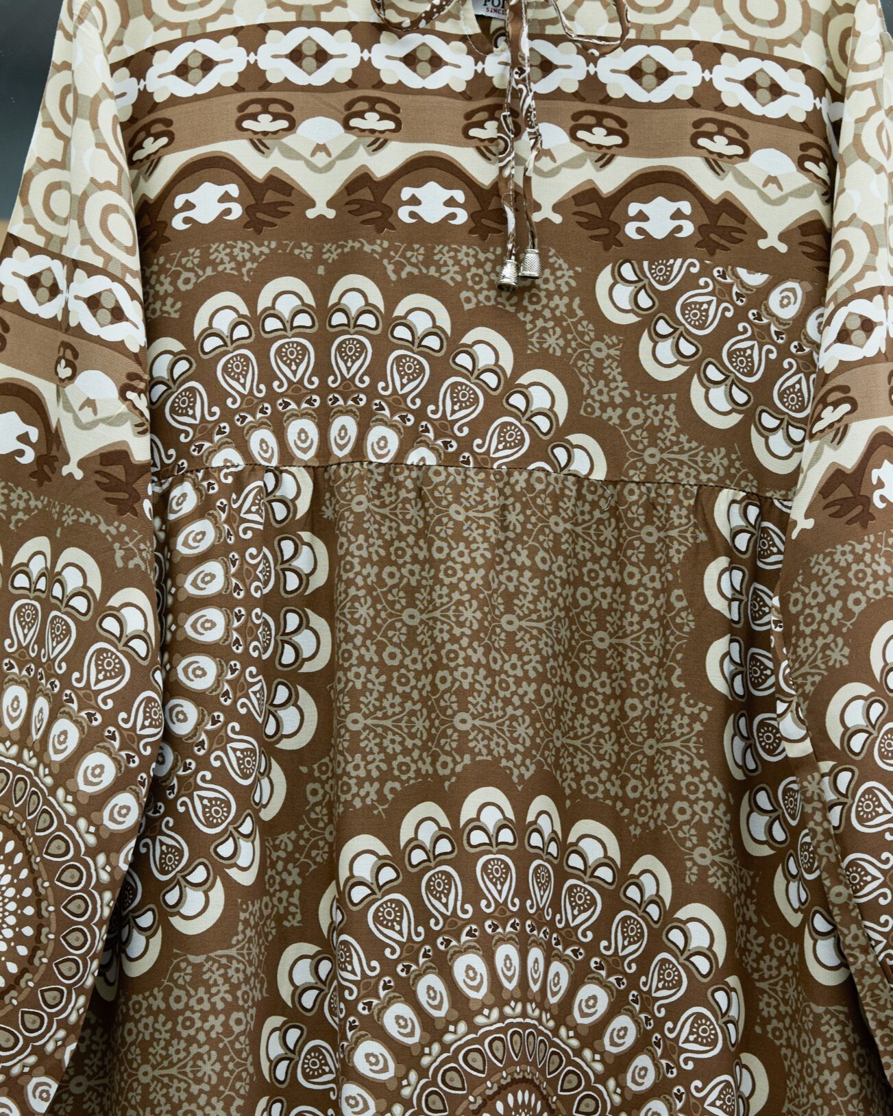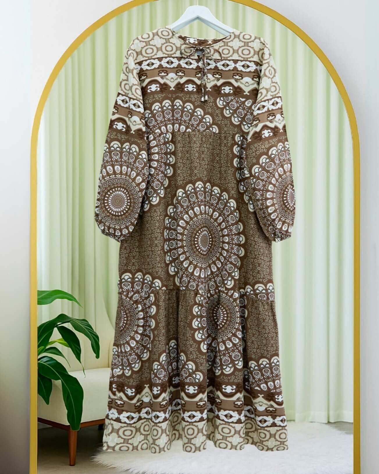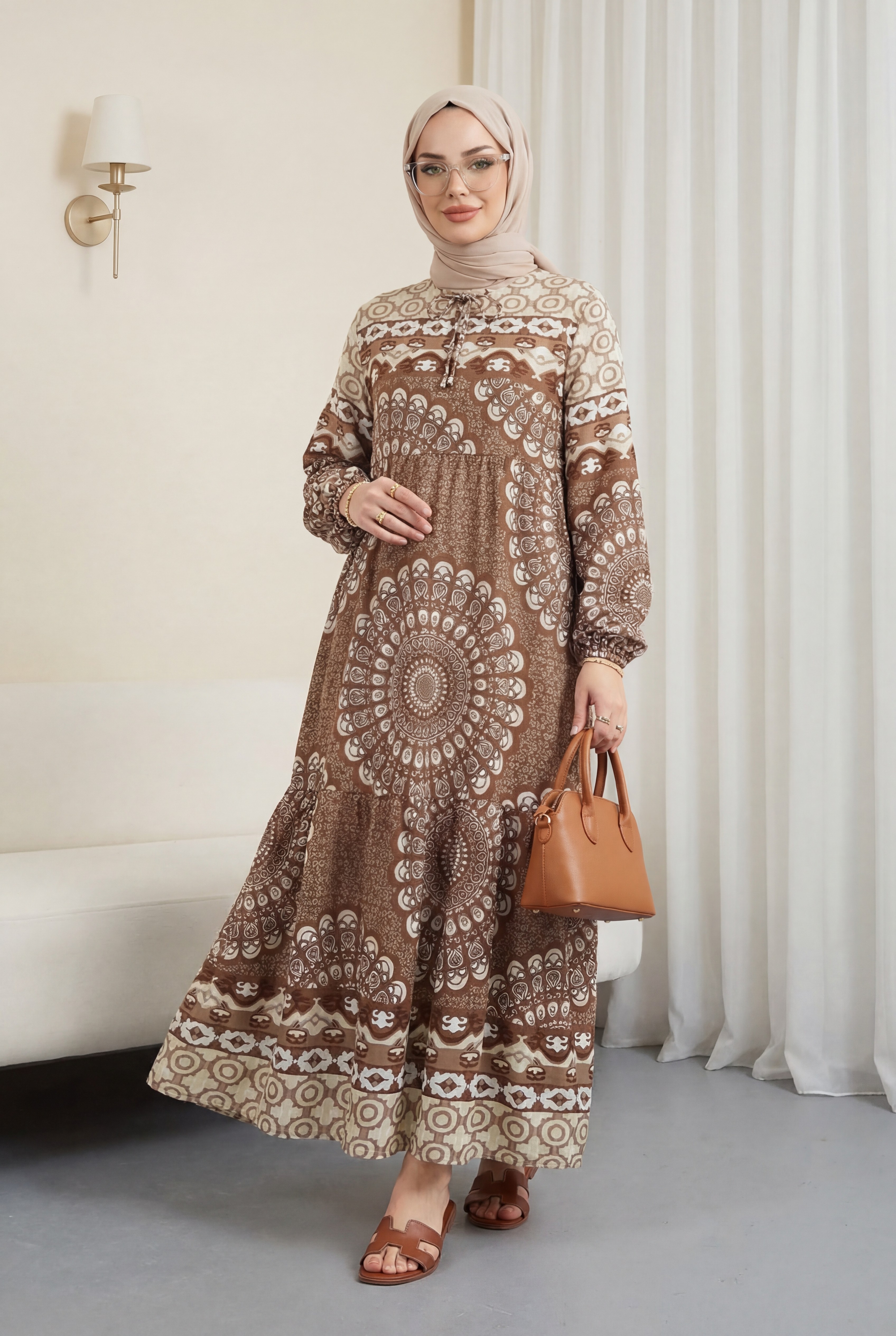 Parçalı Deseli Bağcıklı Kolu Lastikli Elbise -Kahve